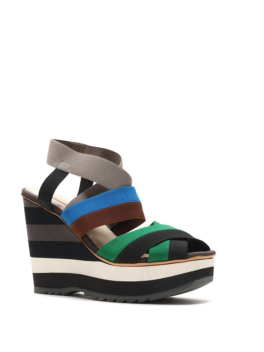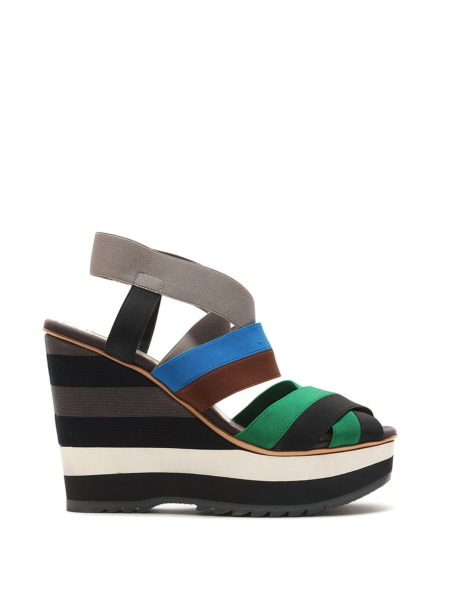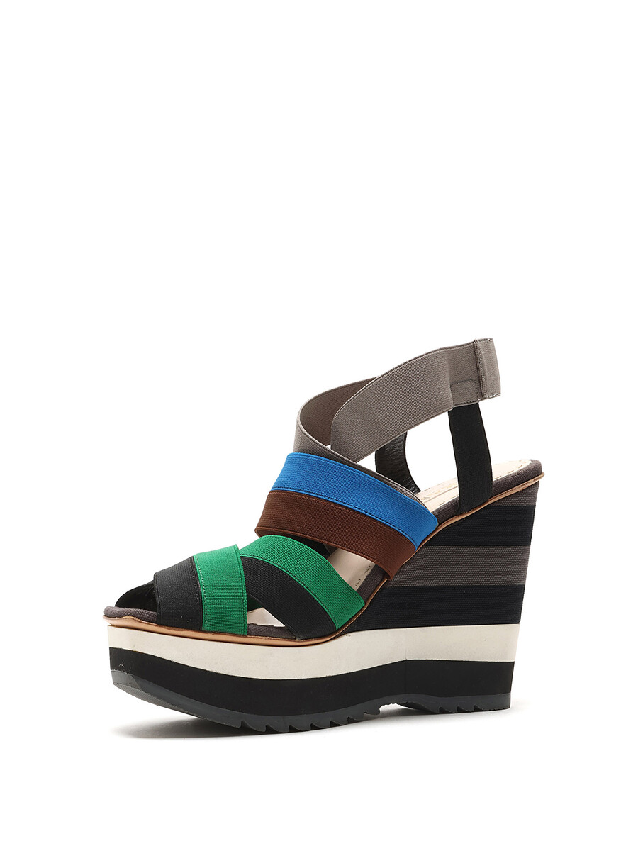 Color-block platform sandals featuring a mix of black, green, blue, brown, and grey. Slip-on design with an open toe style. Rubber sole.