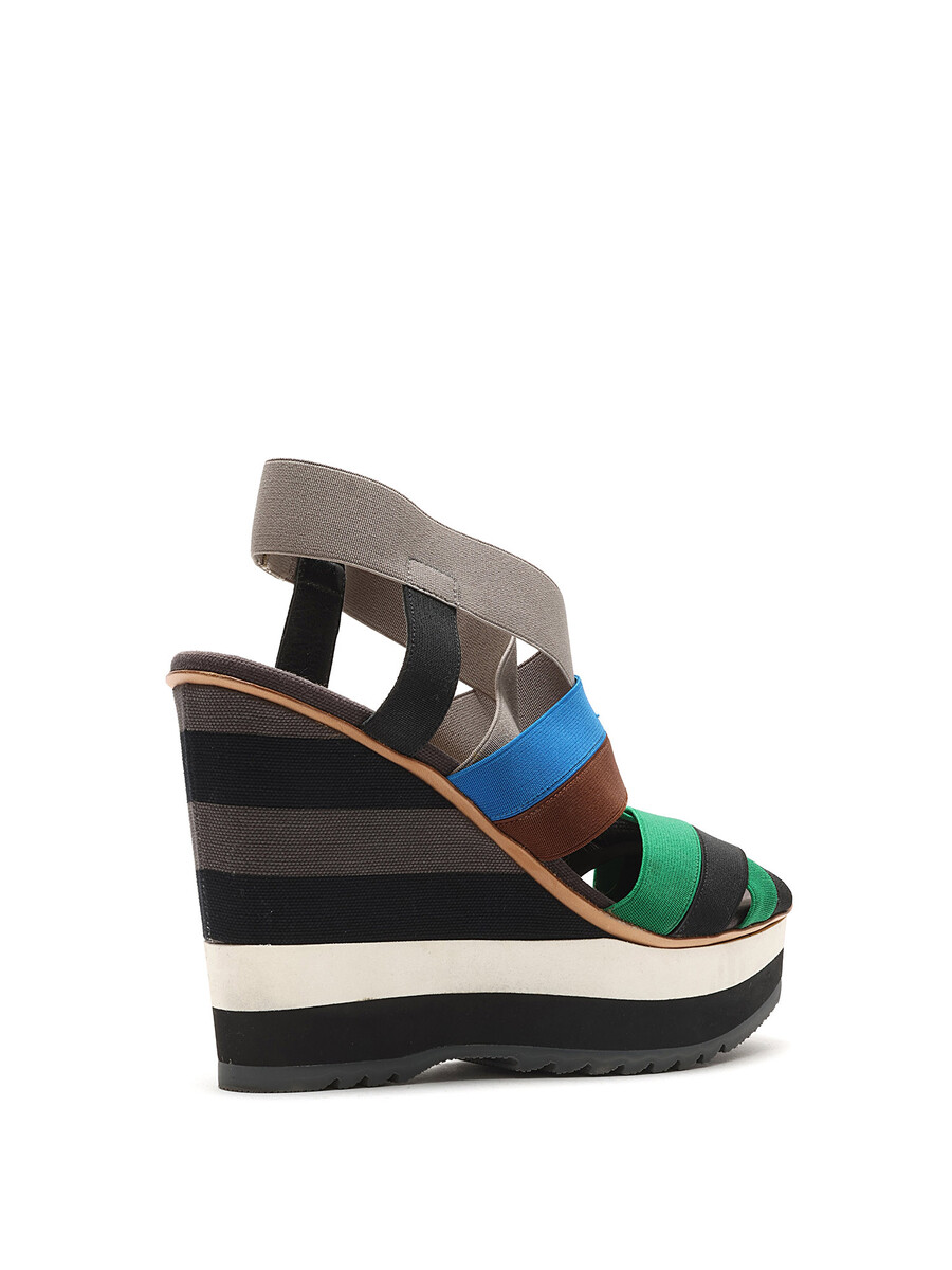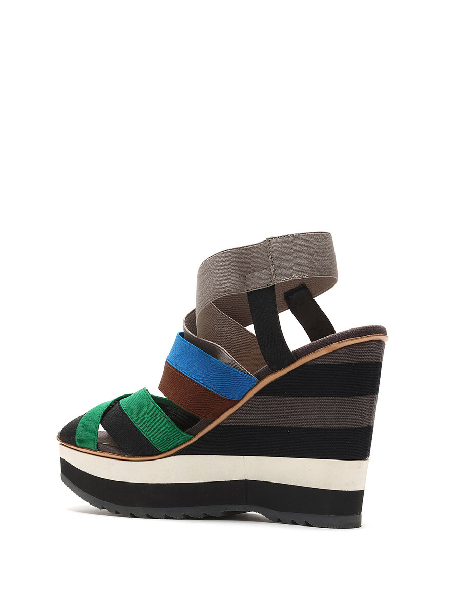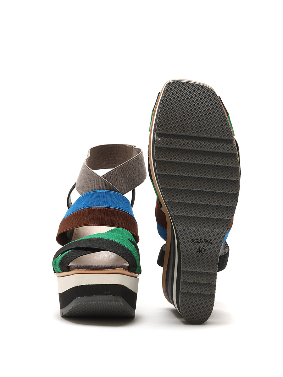 Color-block platform sandals featuring a mix of black, green, blue, brown, and grey. Slip-on design with an open toe style. Rubber sole.