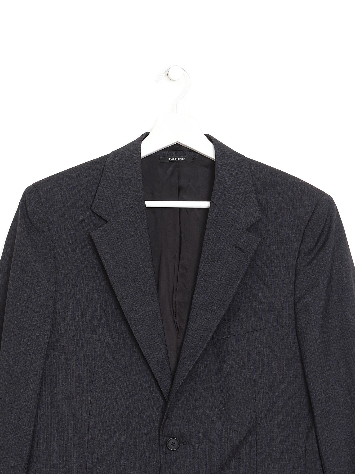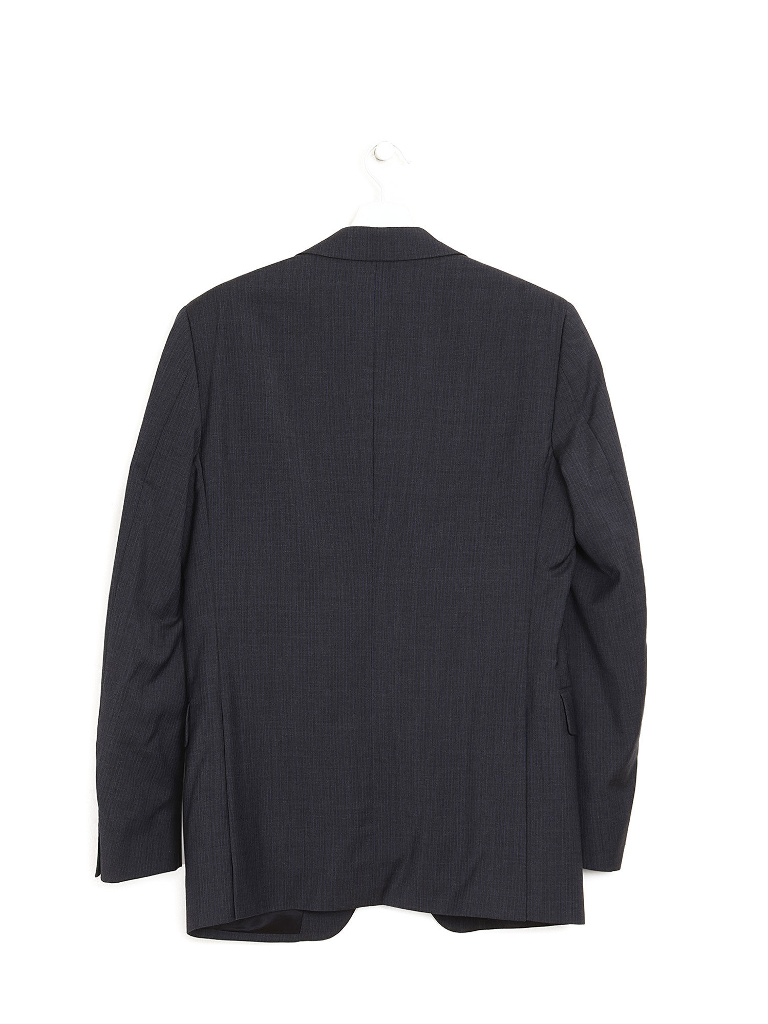 Gray virgin wool blazer. Notched lapels. Flap pockets. Single-breasted design. Tailored fit.