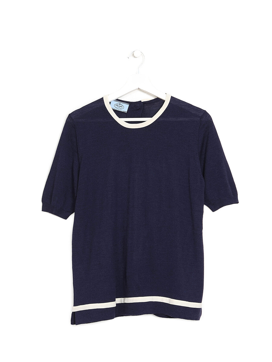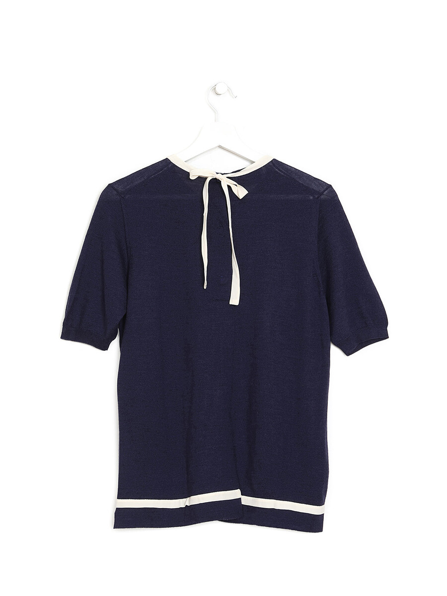 Navy short-sleeved sweater featuring a white hem finish and a bow detail at the back.