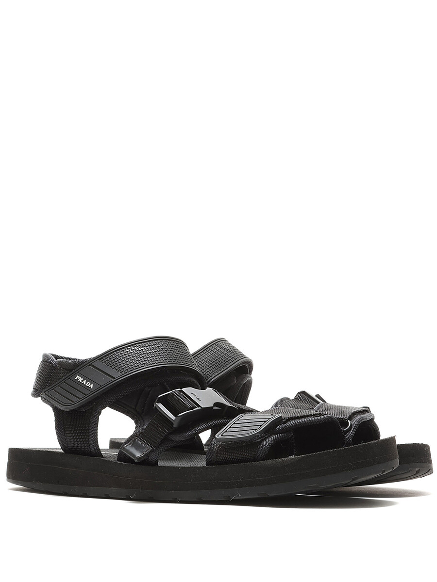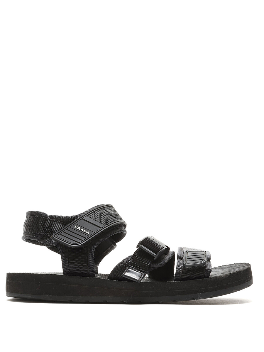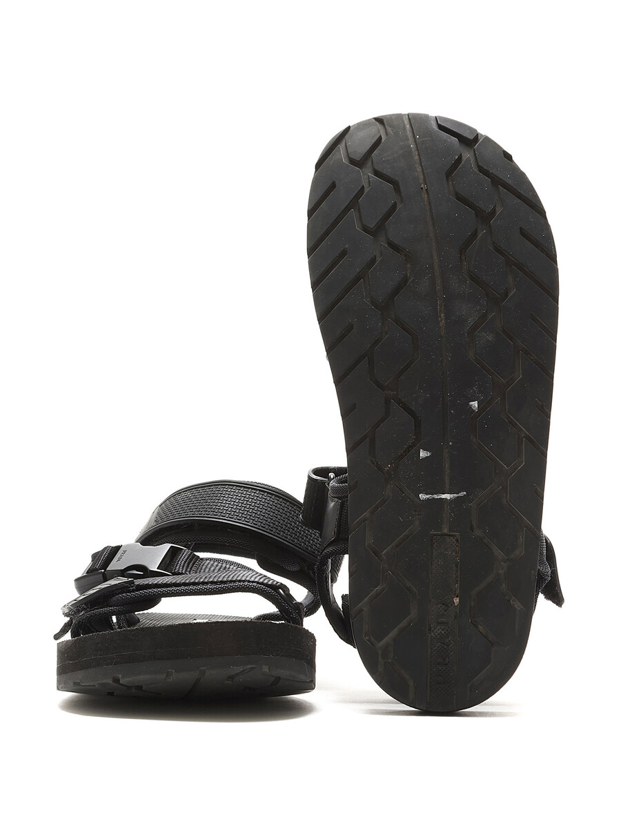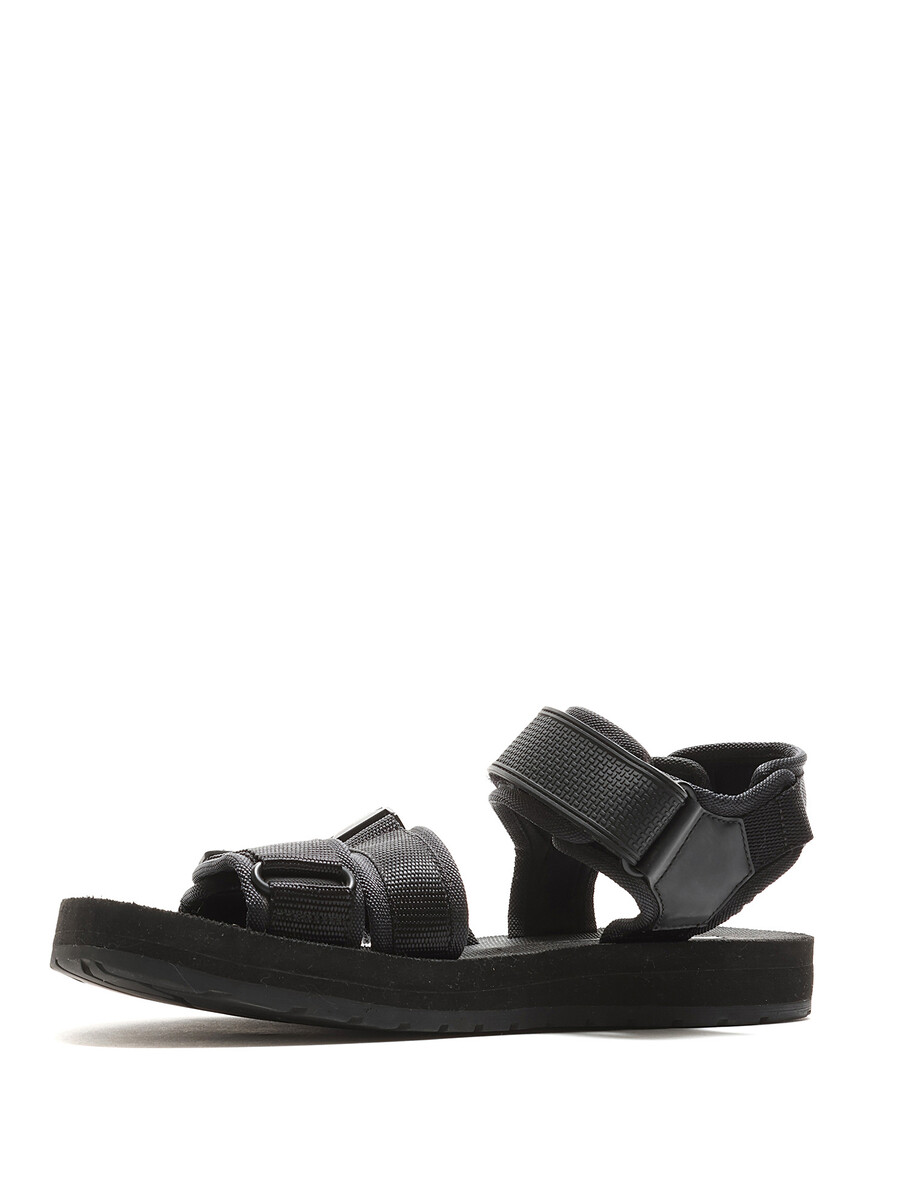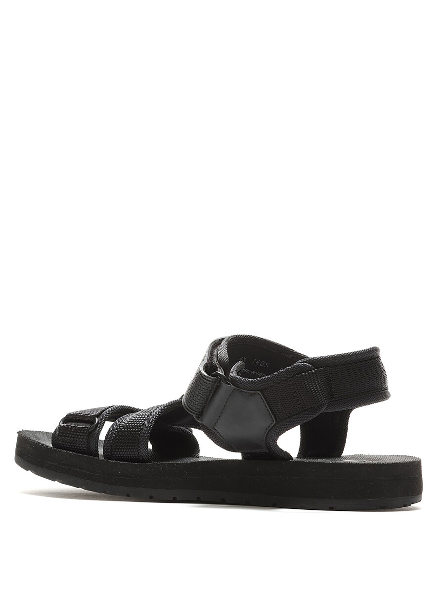 Black nylon sandals featuring adjustable Velcro straps and open toe design.