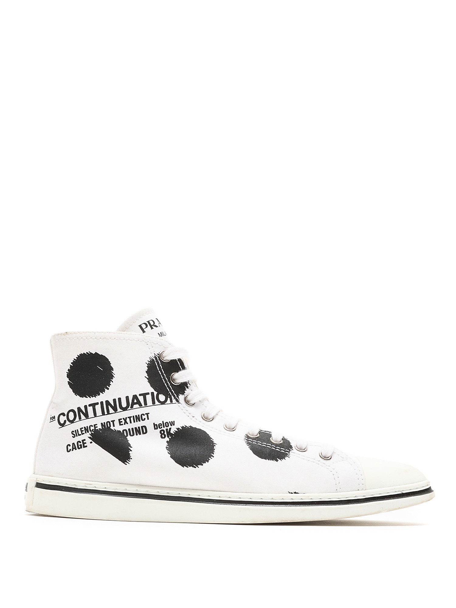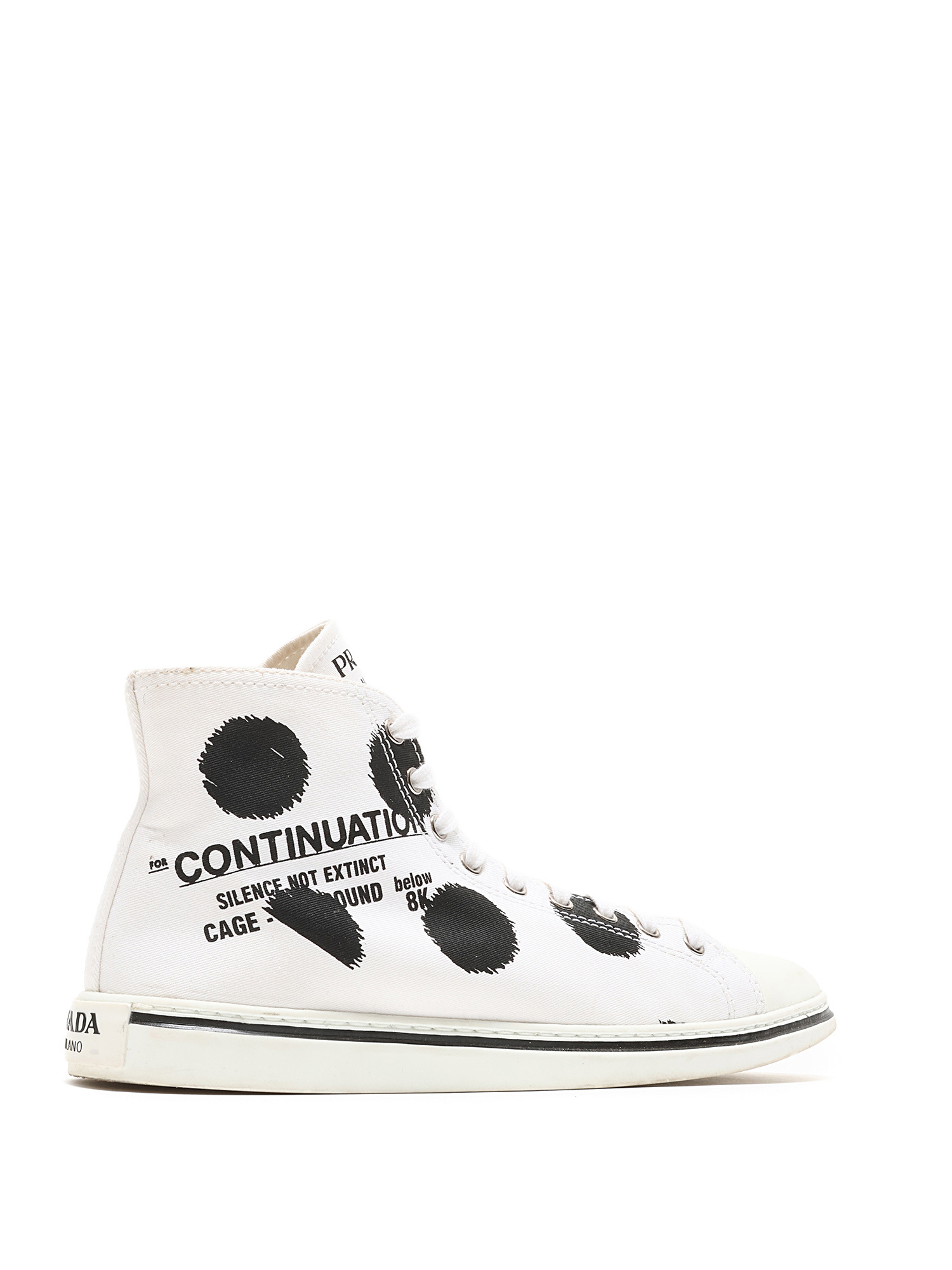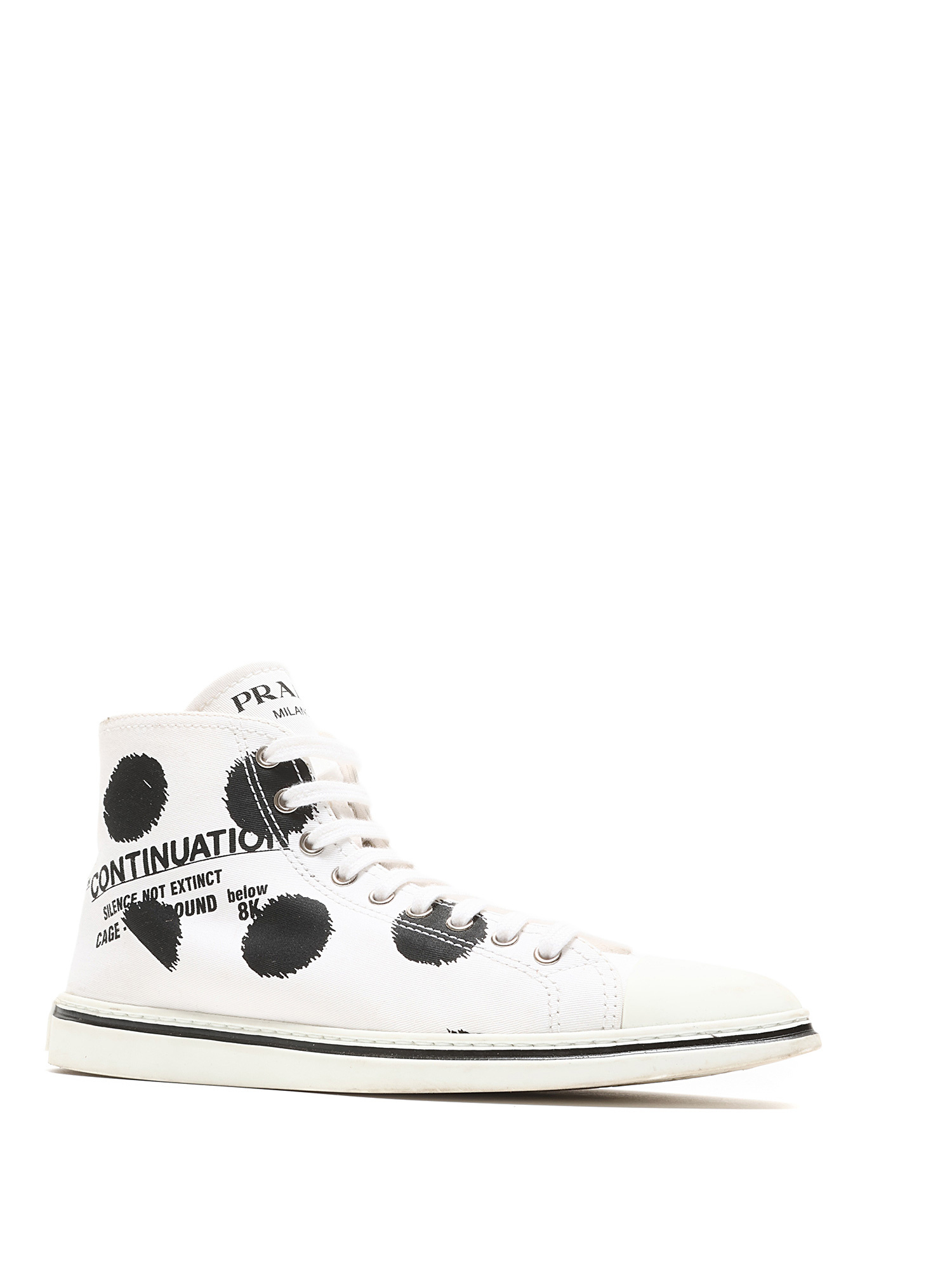 High top sneakers in white and black canvas with polka dot and script lateral print. Logo detail at tongue and embossed logo at soles. Pointed toes and tonal rubber soles.