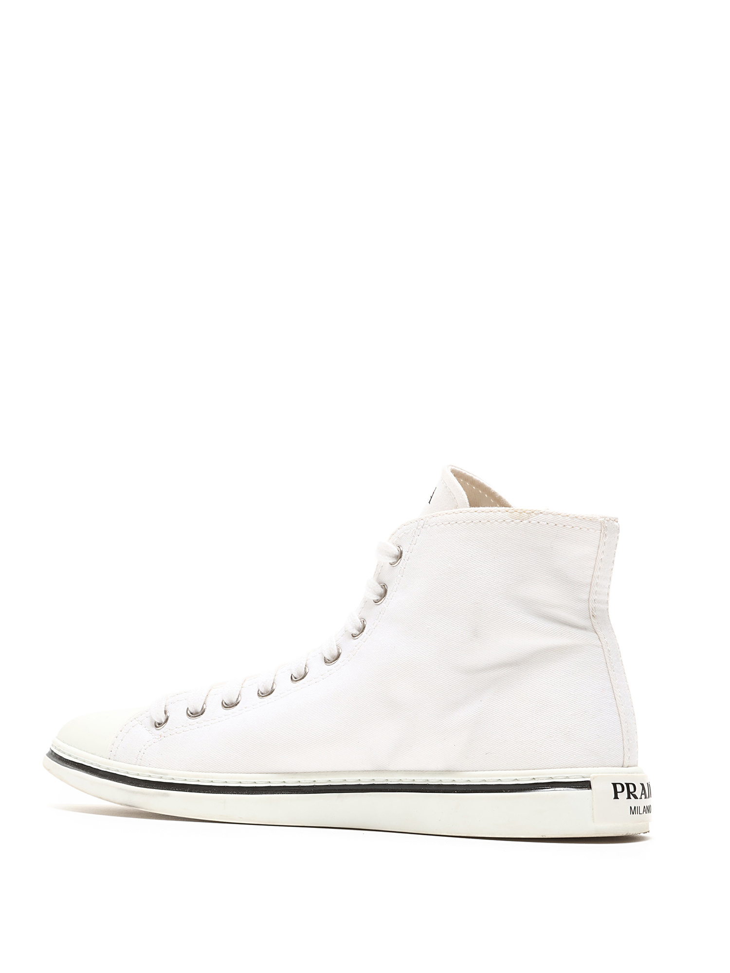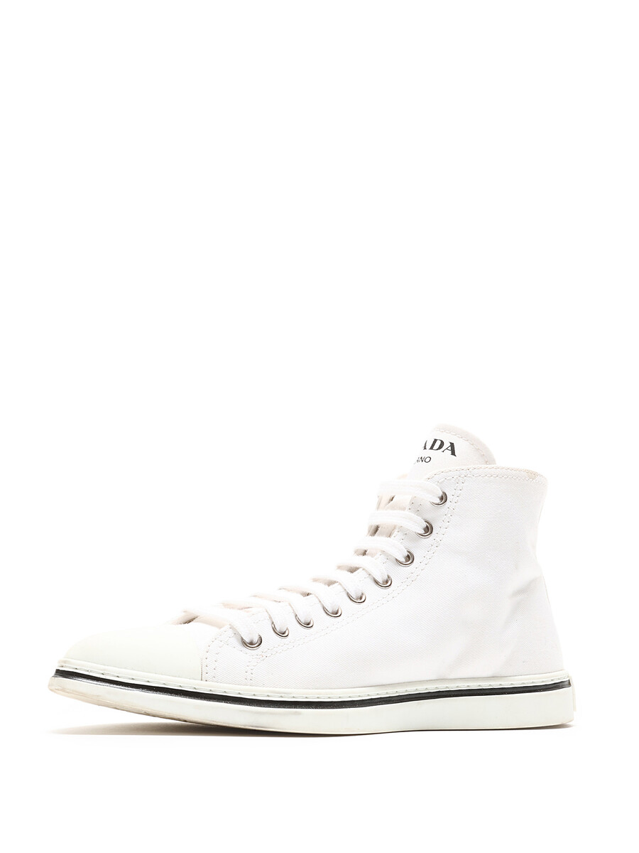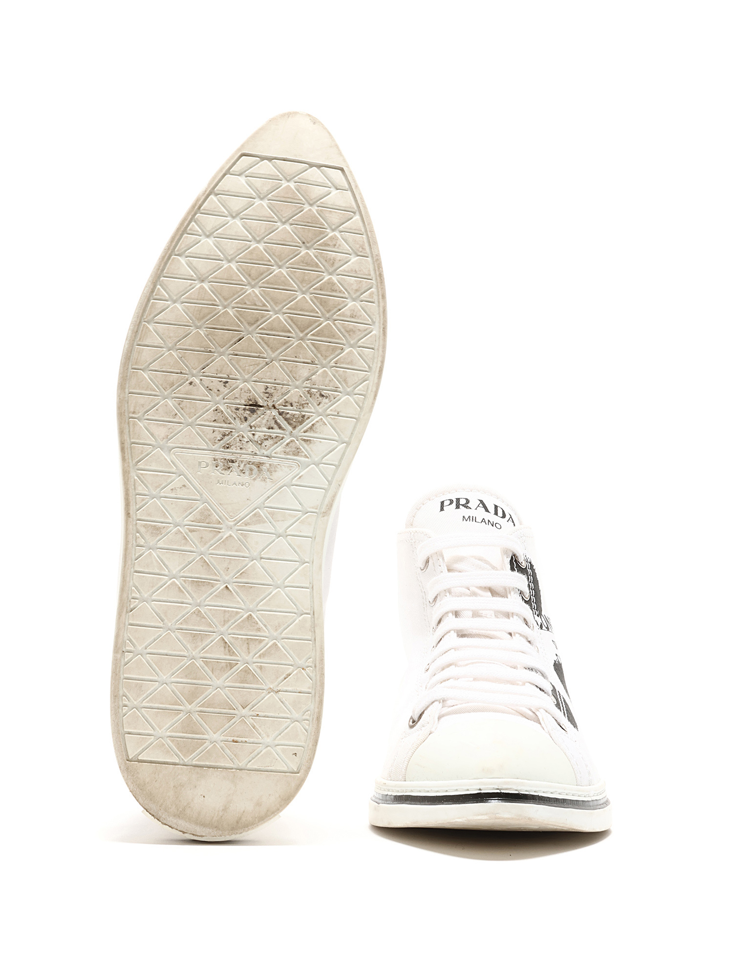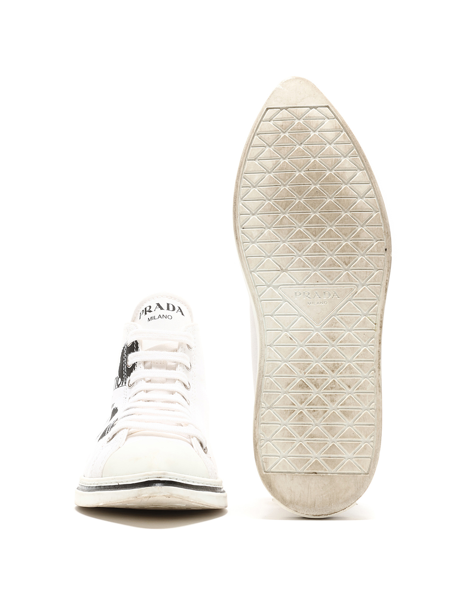 High top sneakers in white and black canvas with polka dot and script lateral print. Logo detail at tongue and embossed logo at soles. Pointed toes and tonal rubber soles.