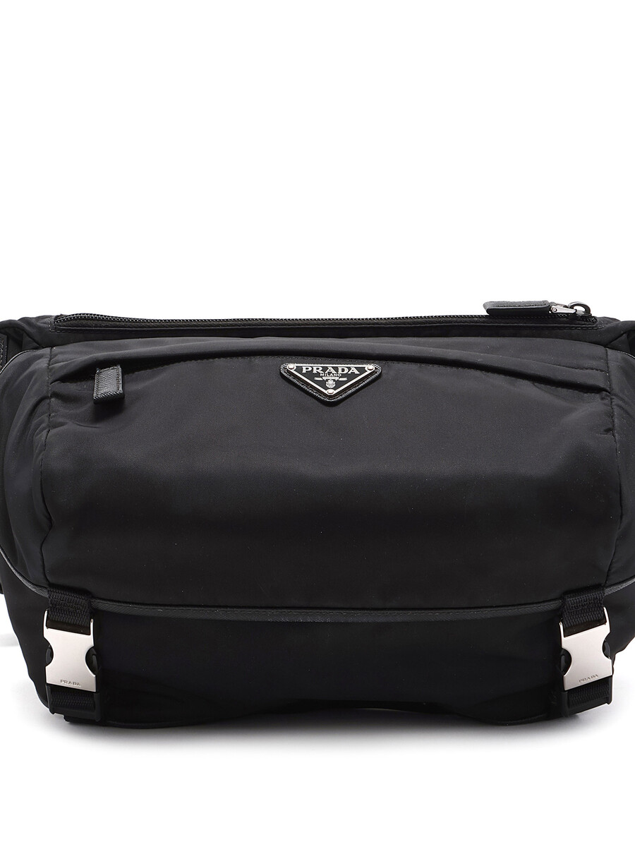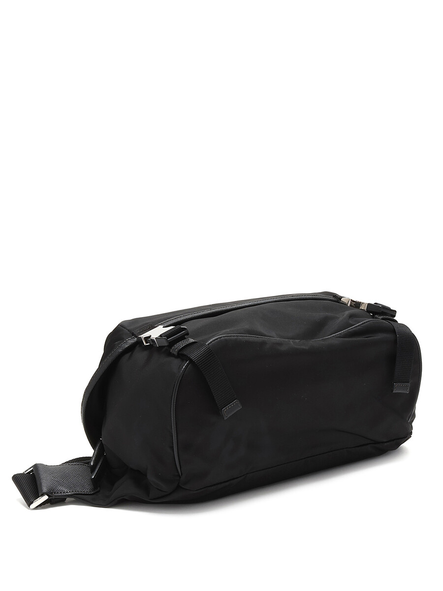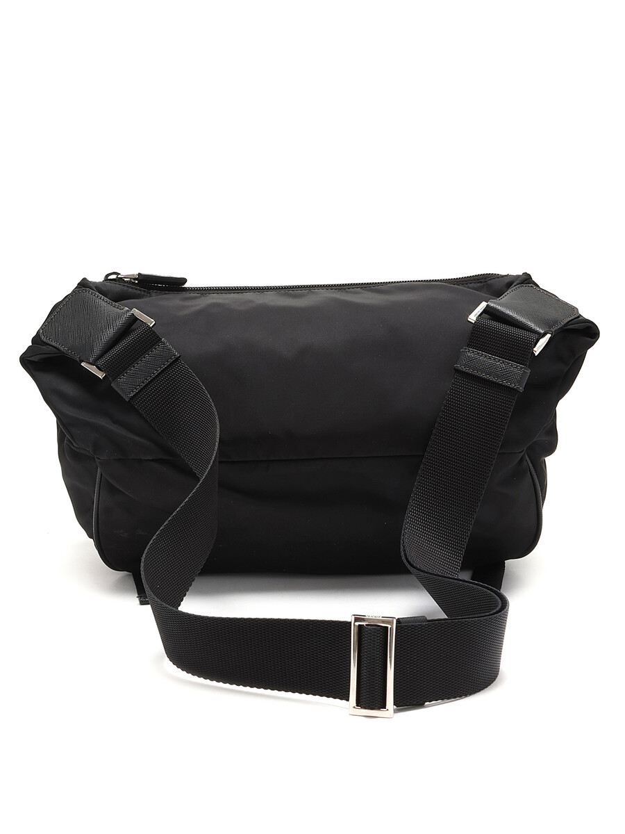 Black nylon crossbody bag featuring a zipper closure and engraved pressure clasp. Adjustable webbing strap with silver-tone hardware. Comes with a dustbag.