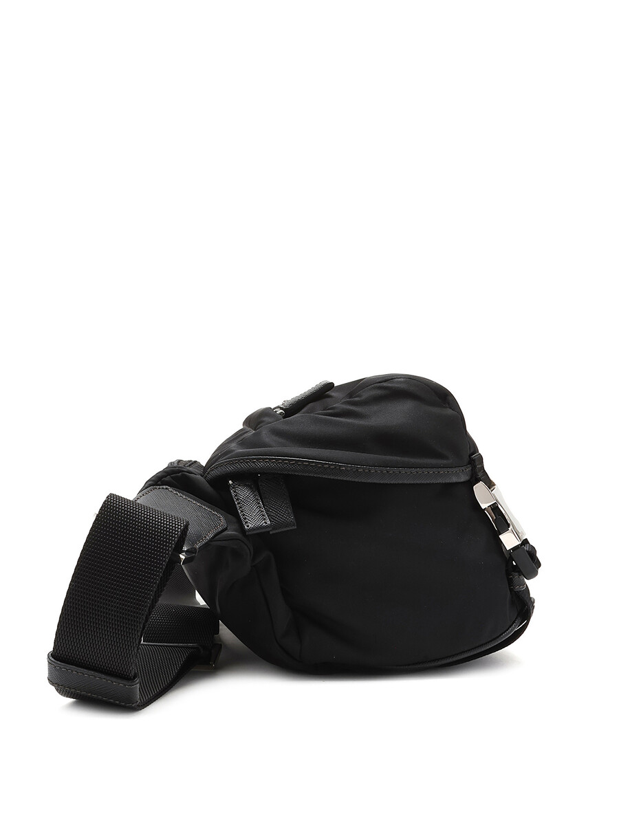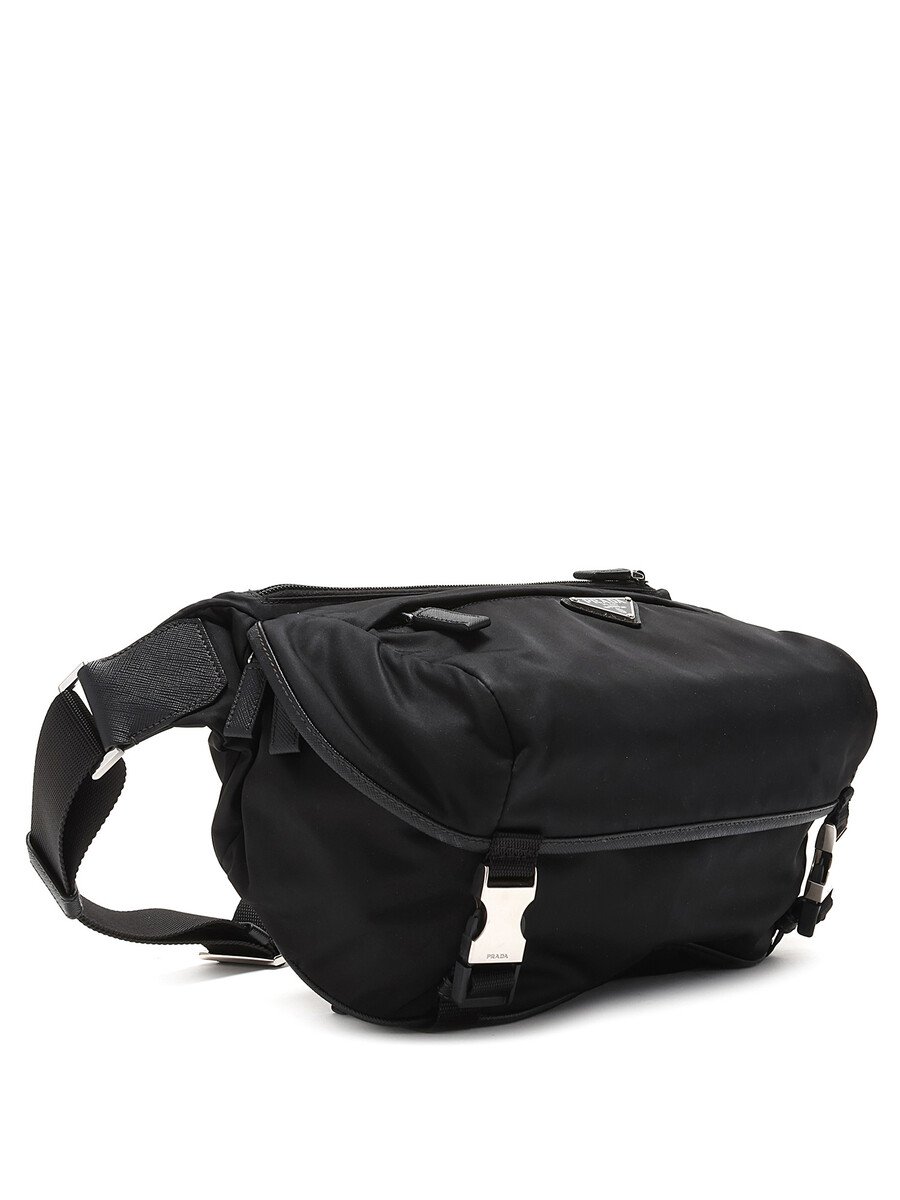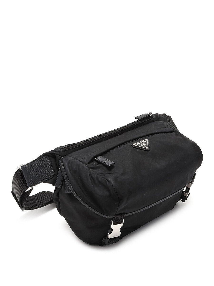 Black nylon crossbody bag featuring a zipper closure and engraved pressure clasp. Adjustable webbing strap with silver-tone hardware. Comes with a dustbag.