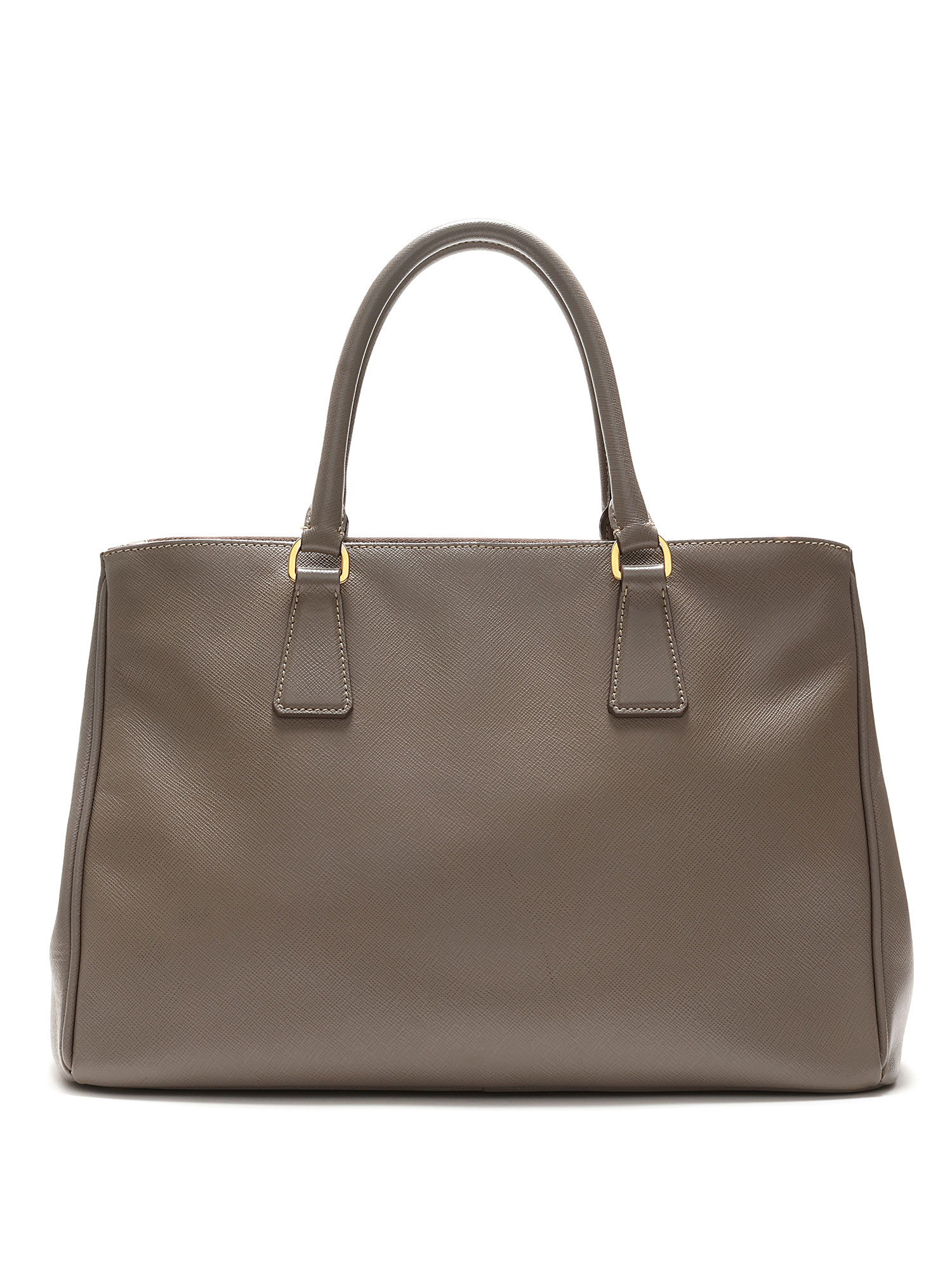 Medium-sized Saffiano leather tote bag in grey. Gold-tone hardware. Magnetic and zip closures. Double rolled handles with a detachable shoulder strap. Three main compartments for organized storage.