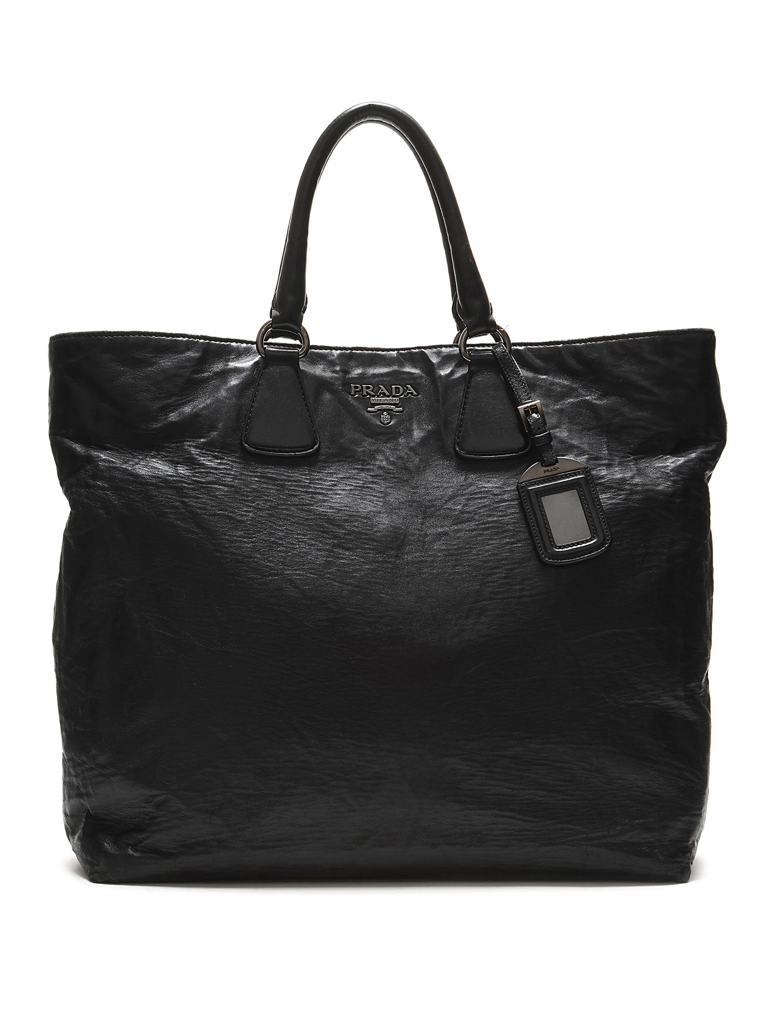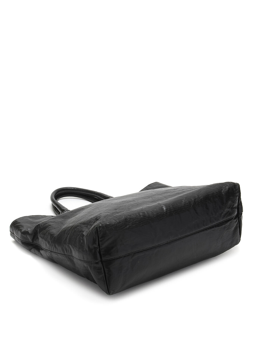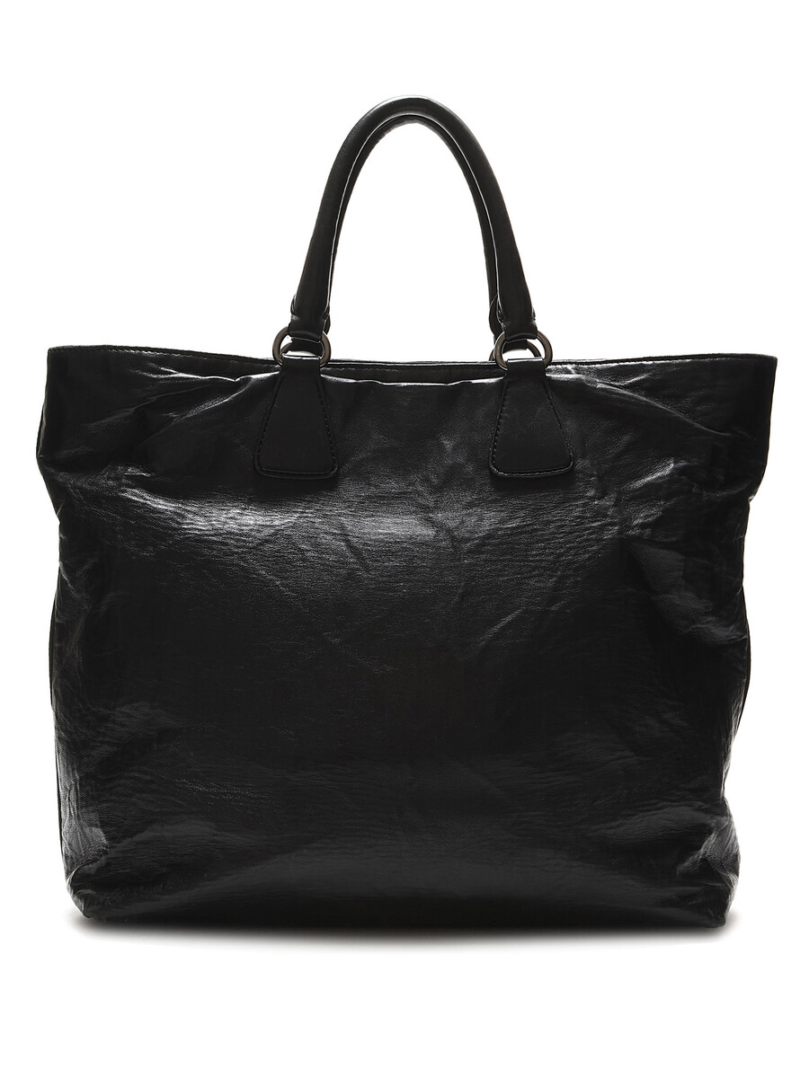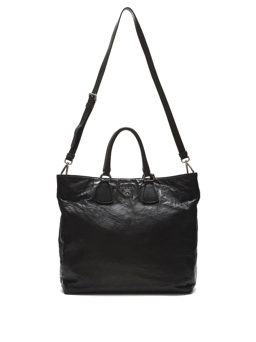 Grained leather tote bag in black. Zipper closure on top. Leather handles with detachable shoulder strap. Silver-tone hardware.