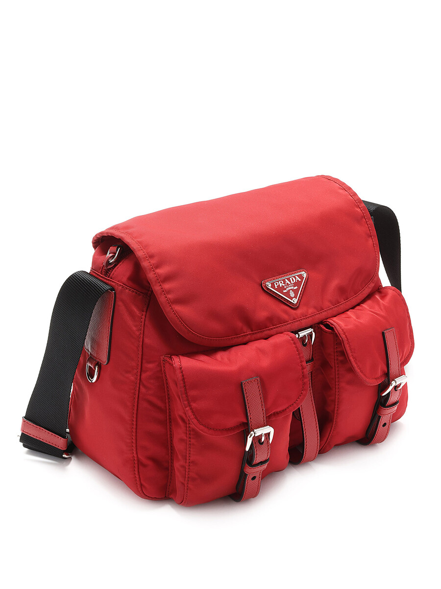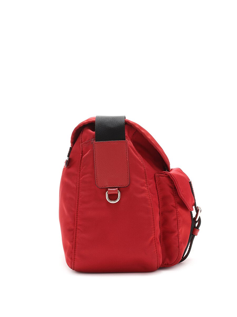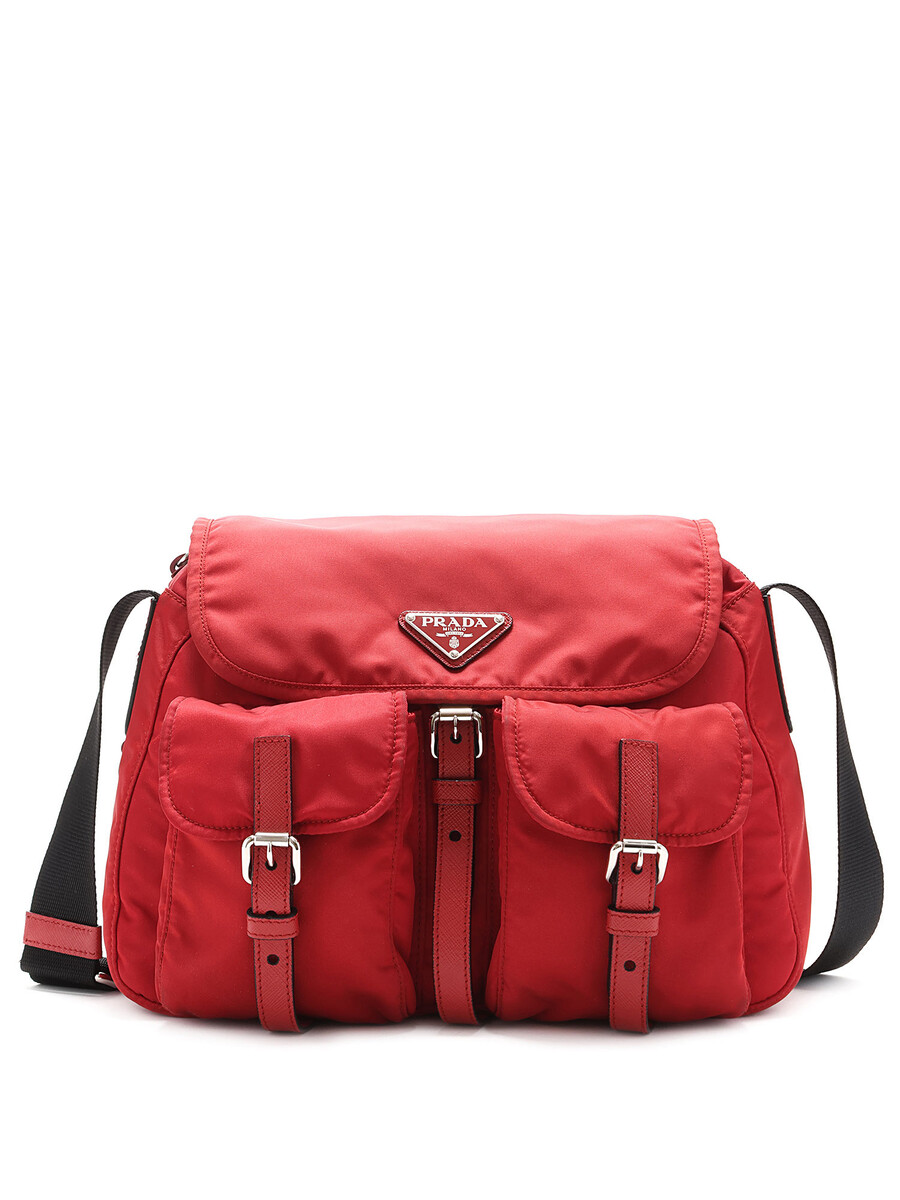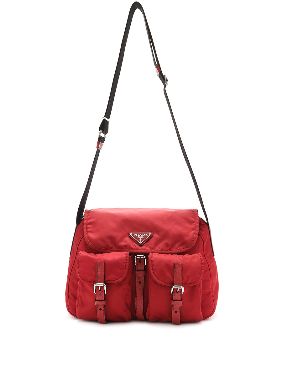 Red nylon shoulder bag featuring buckle closures and adjustable fabric strap. Flap with buckle fastenings. Saffiano leather trims. Silver-tone hardware.