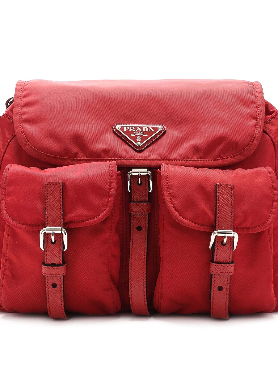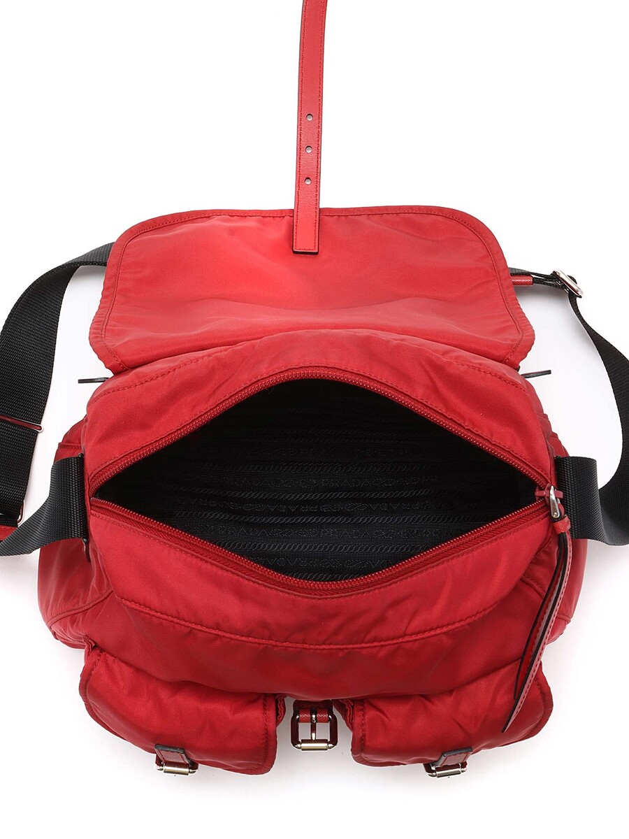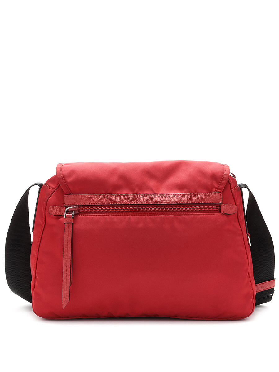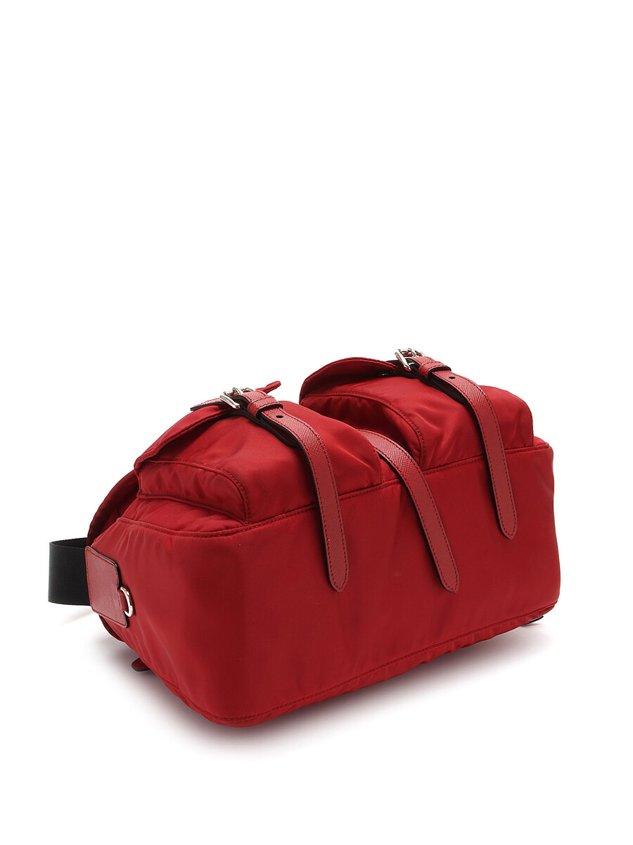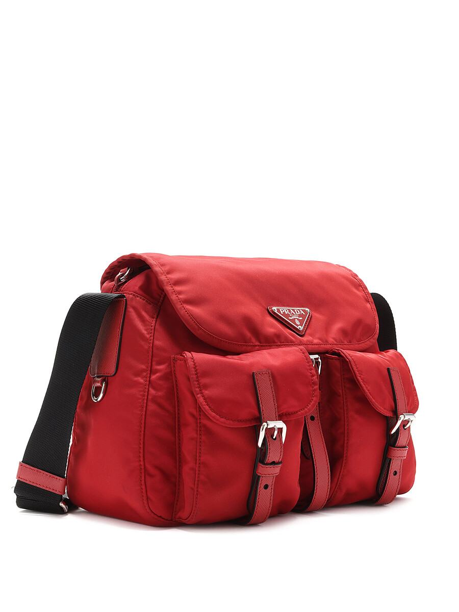 Red nylon shoulder bag featuring buckle closures and adjustable fabric strap. Flap with buckle fastenings. Saffiano leather trims. Silver-tone hardware.