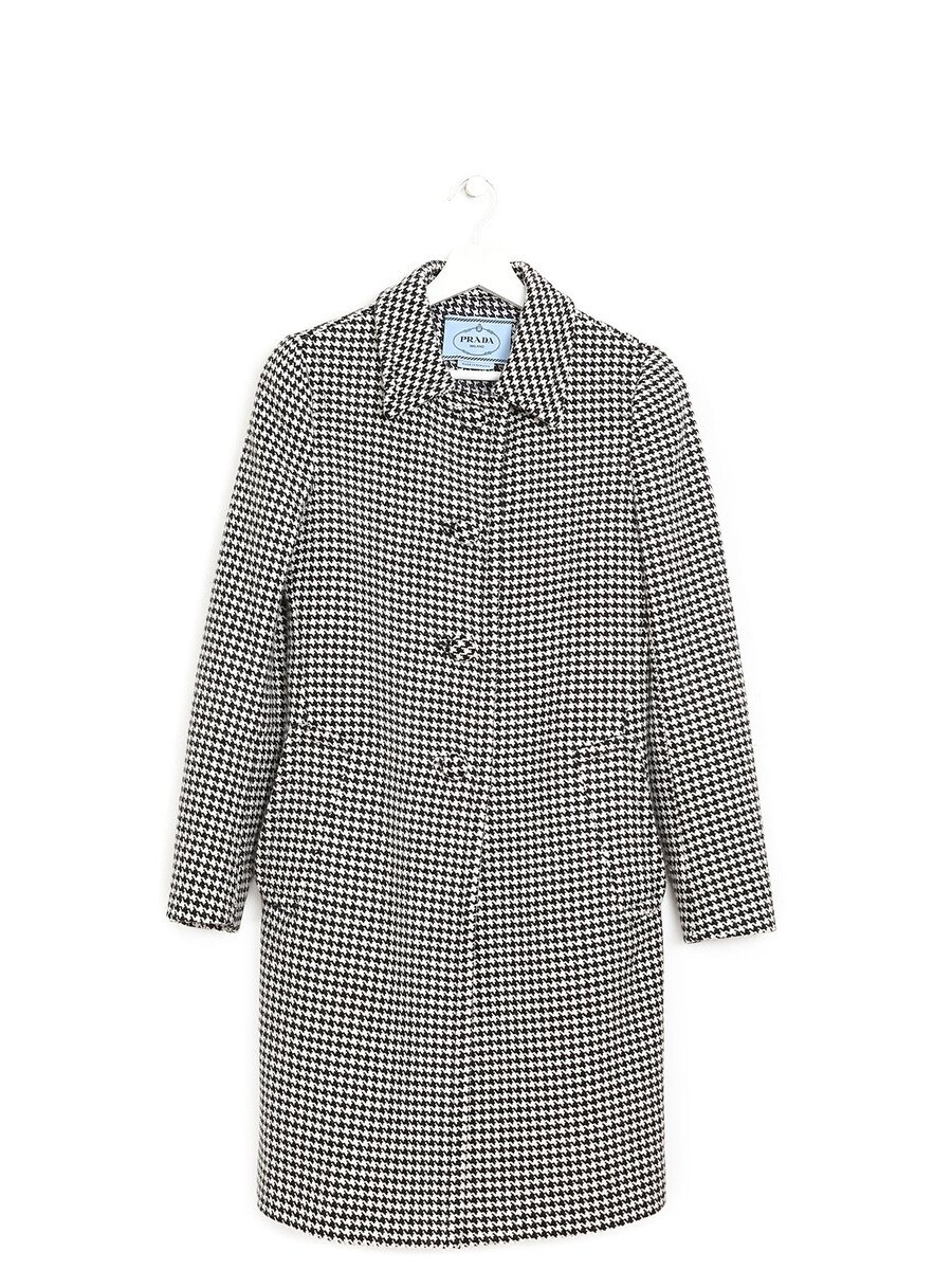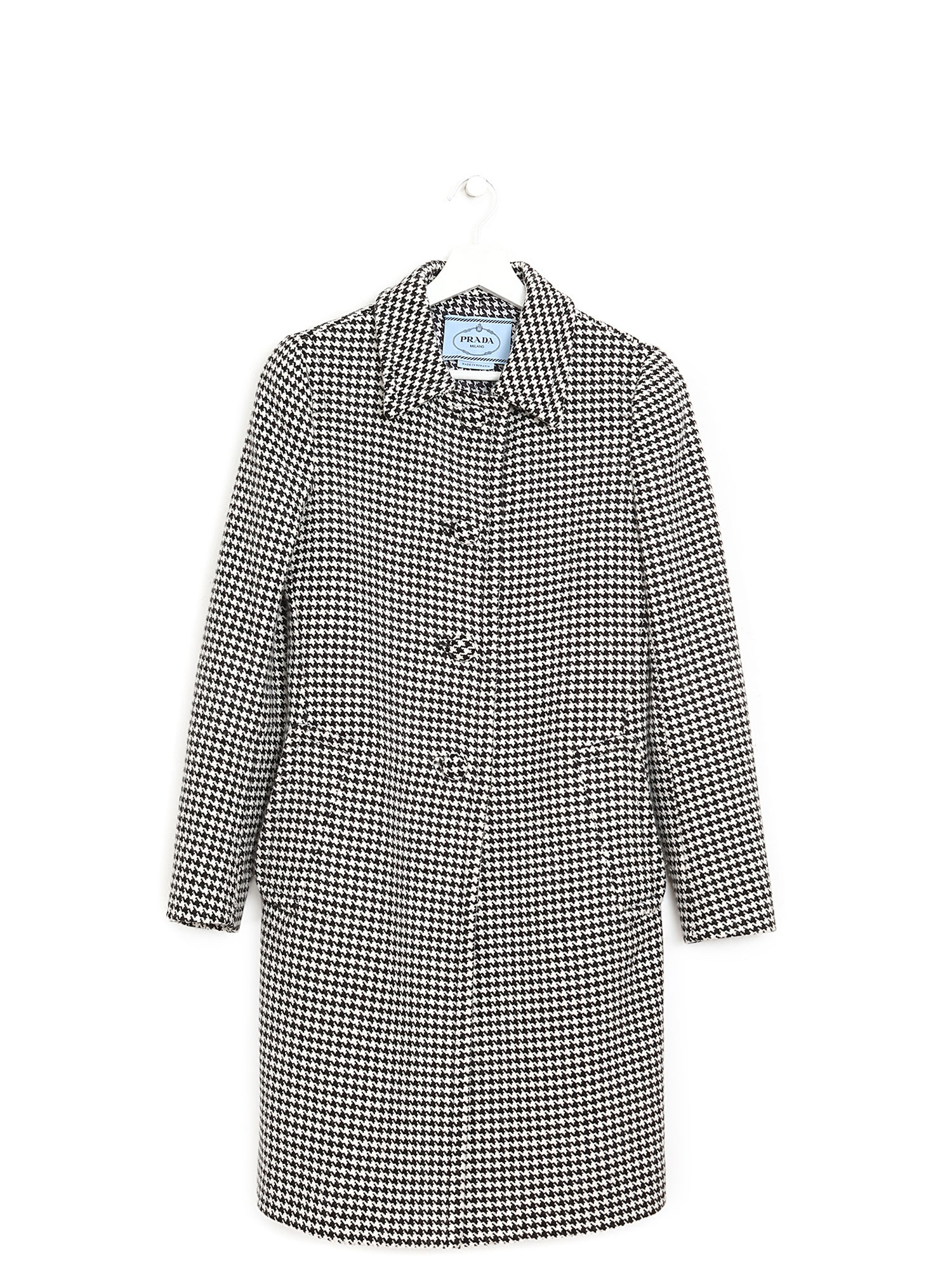 Black and white houndstooth patterned long sleeve coat. Button-front closure with shirt collar. Flap pockets. Made from a luxurious wool blend.