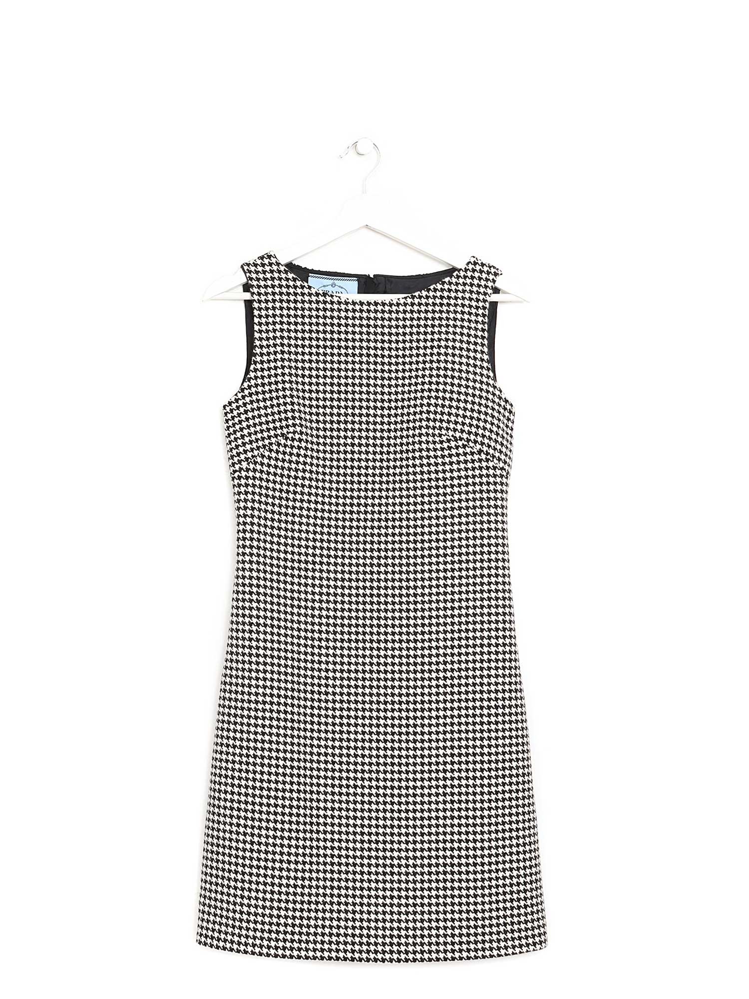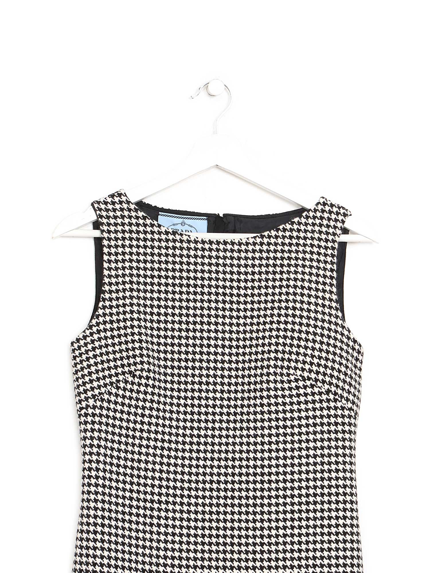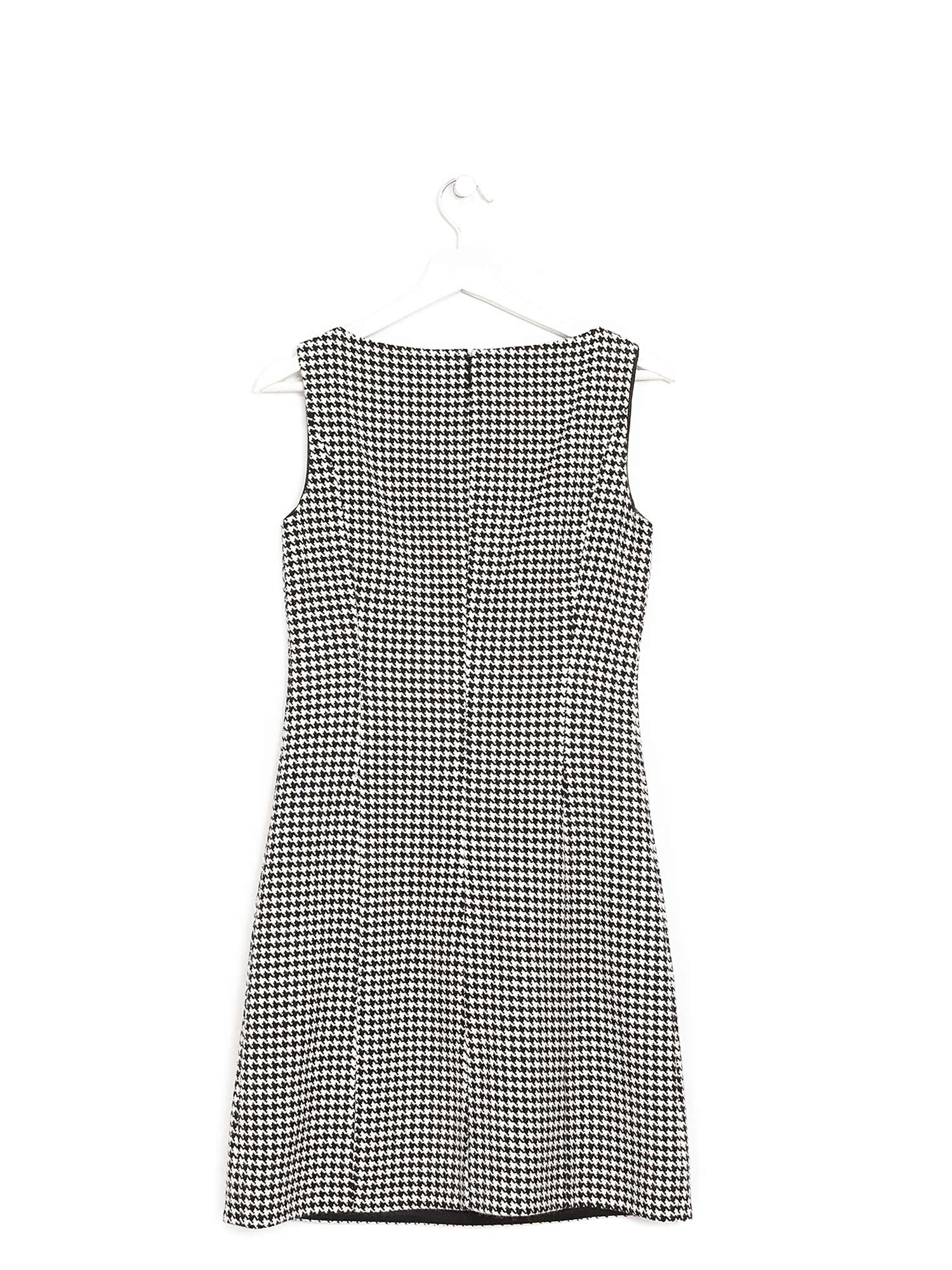 Sleeveless dress with a classic houndstooth pattern in black and white. Features a fitted silhouette.