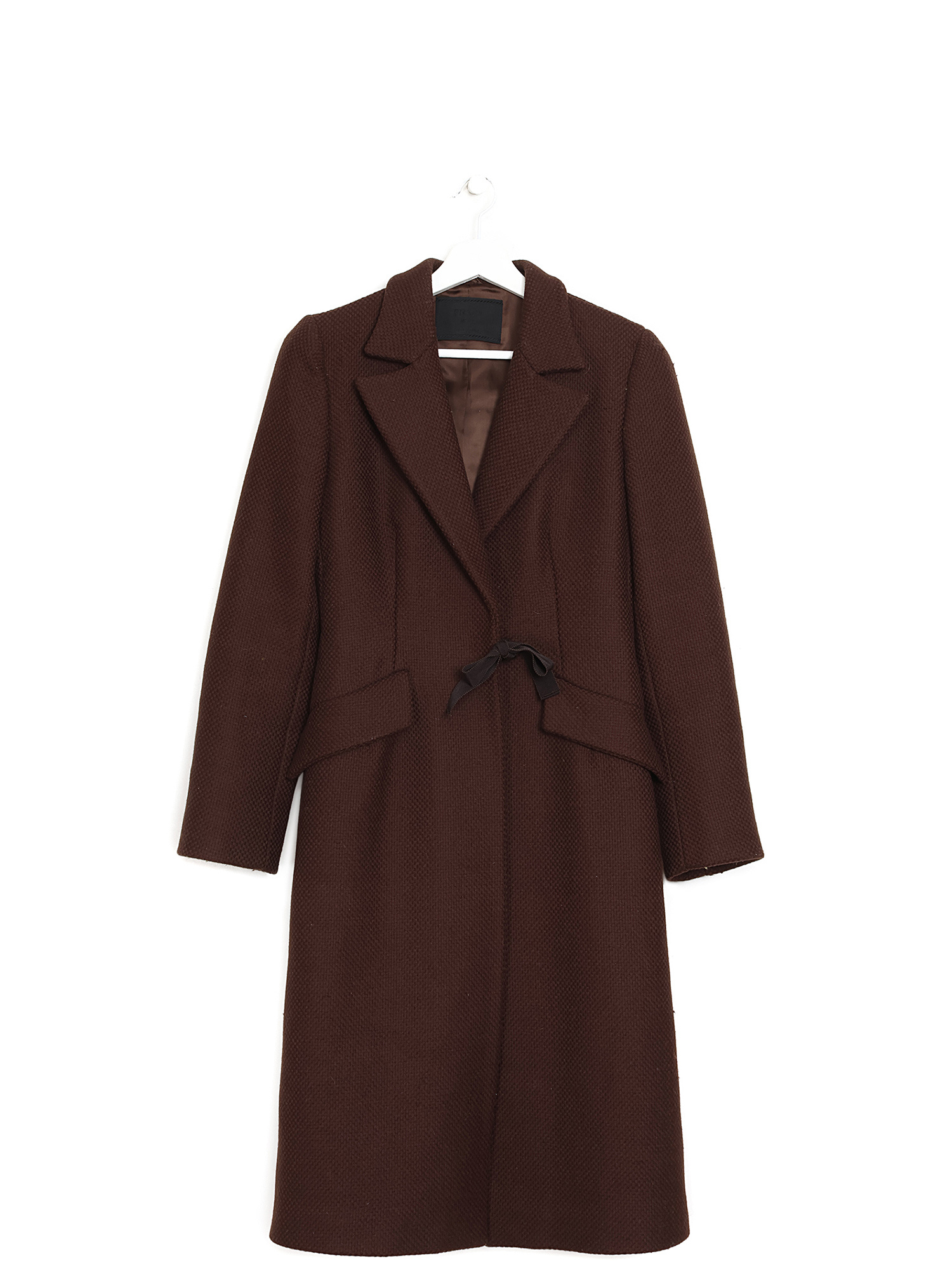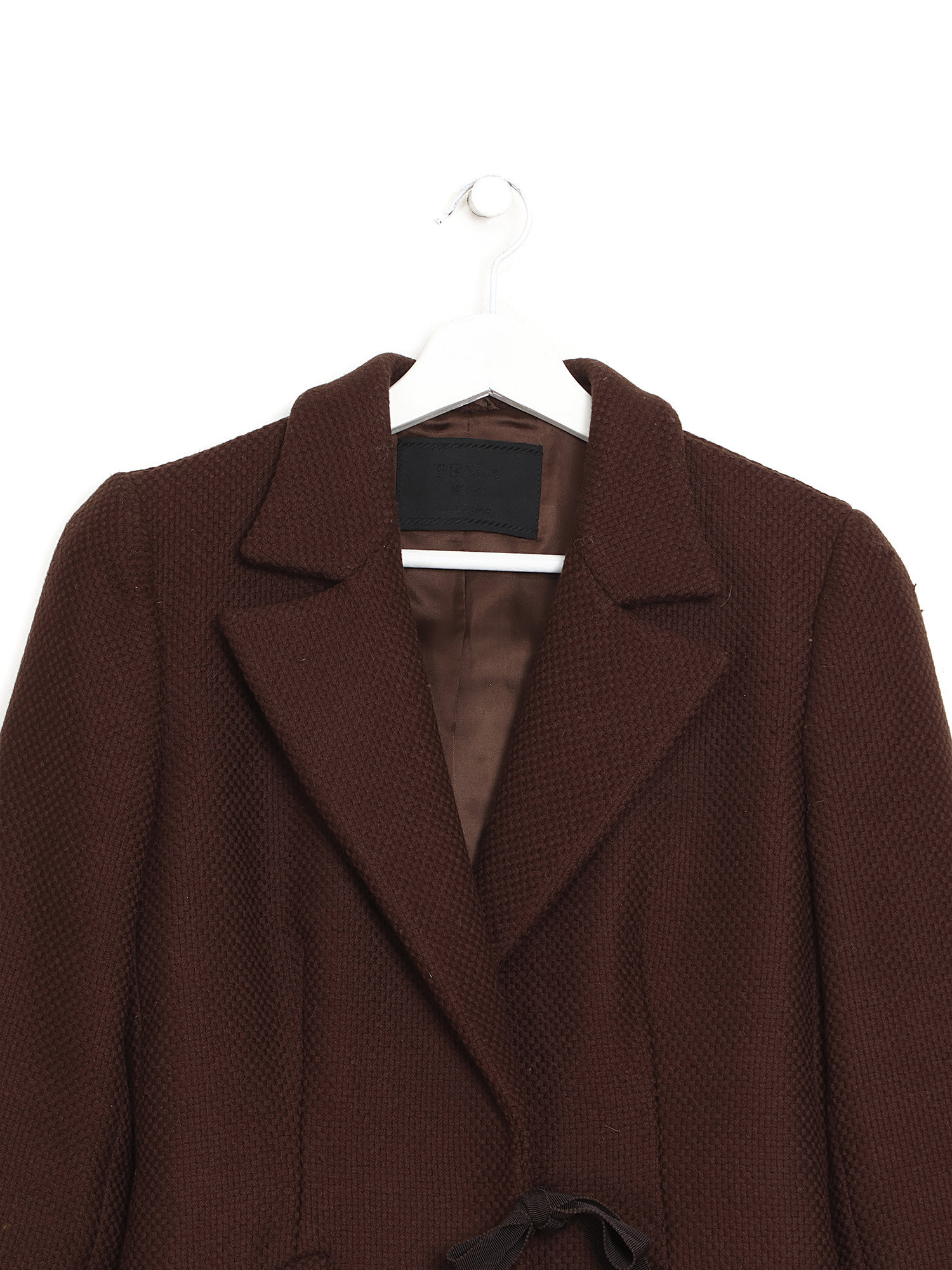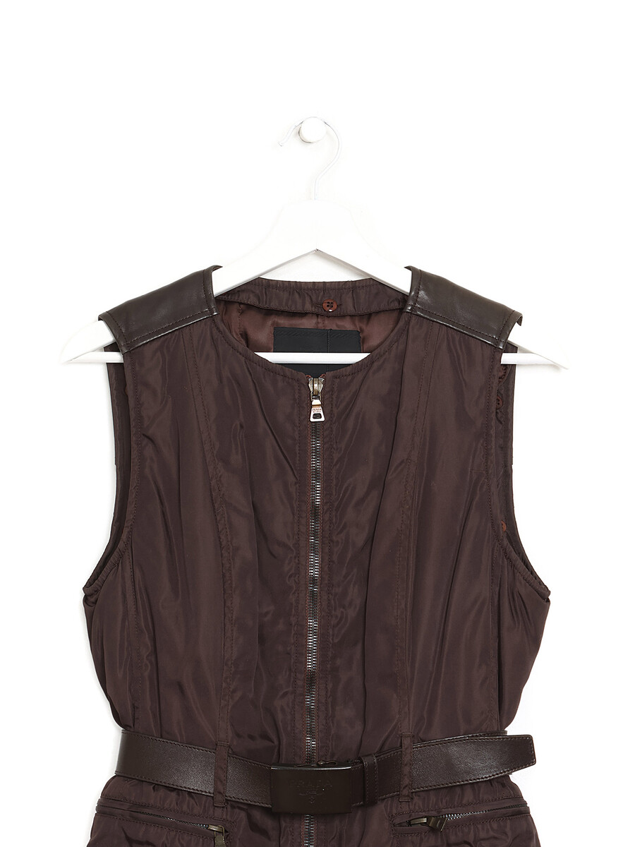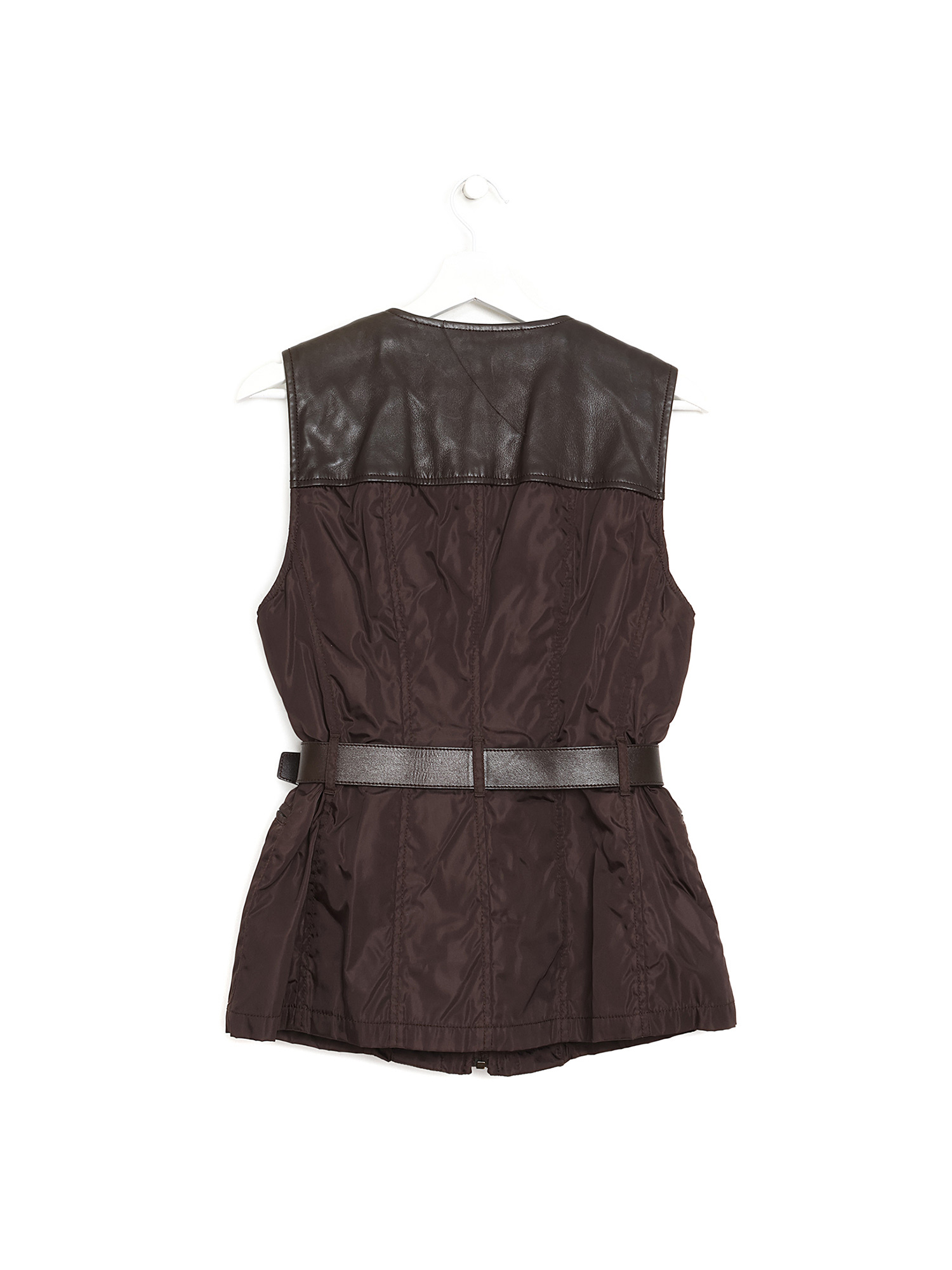 Two-piece set featuring a long sleeve wool coat in brown with a notch collar, button closure, flap pockets, and waist tie. Comes with a brown nylon sleeveless vest with branded belt and leather trims.