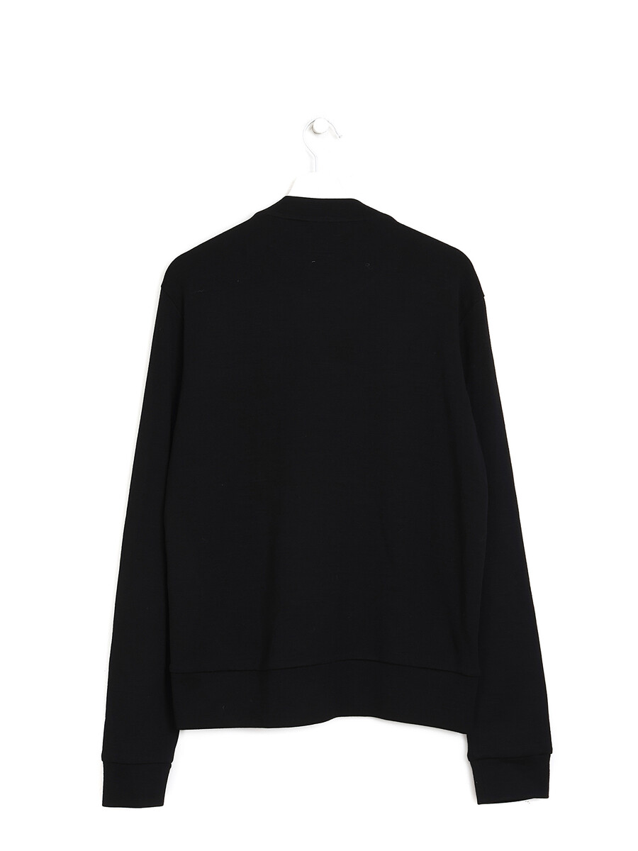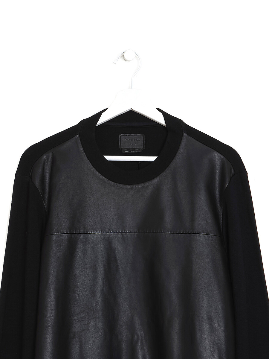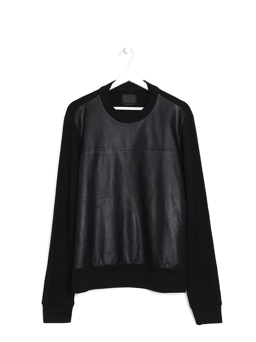 Long sleeve shirt in black featuring a leather panel at the front. Round collar.