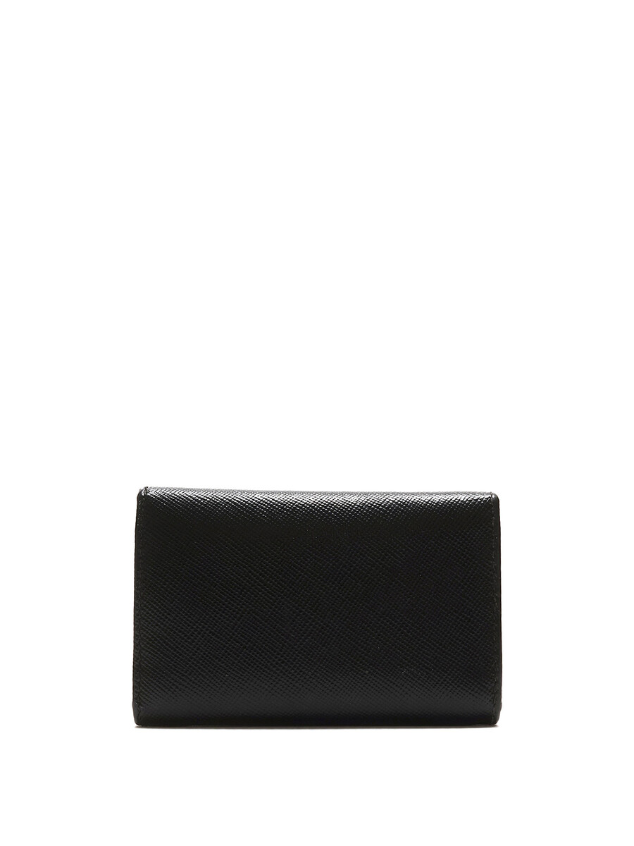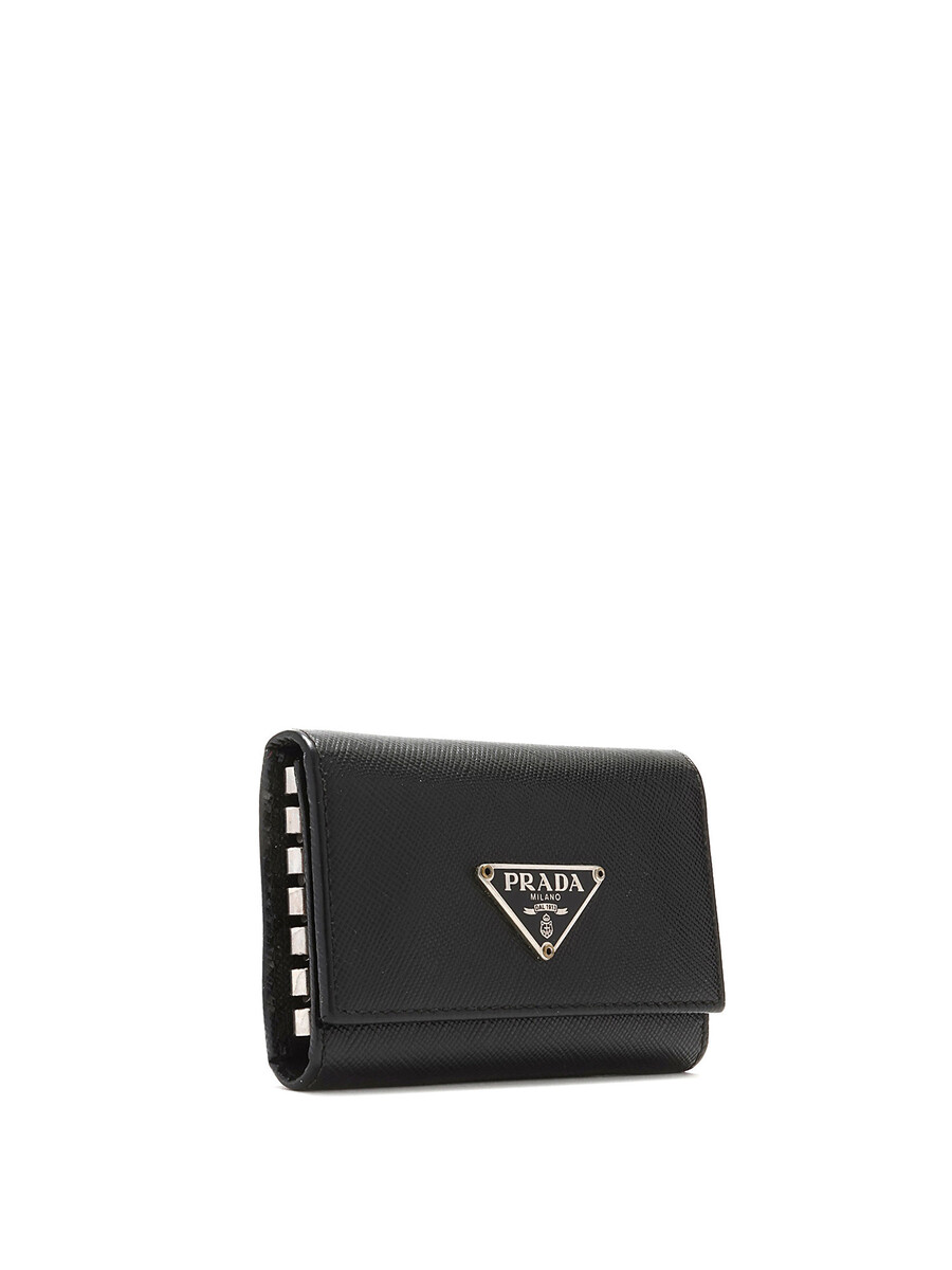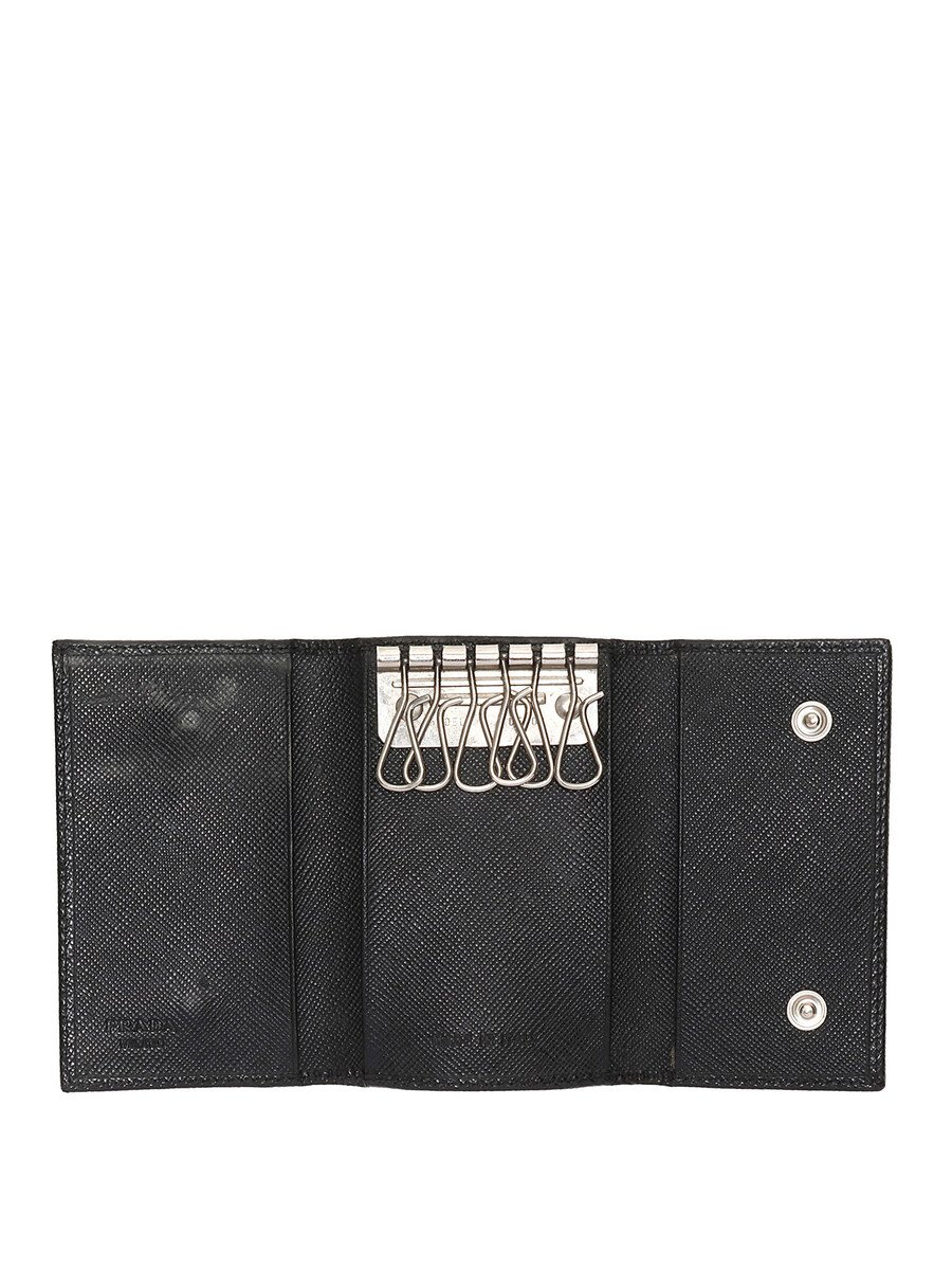 Textured Saffiano leather key holder in black. Snap closure. Silver-tone hardware featuring Prada logo plaque.