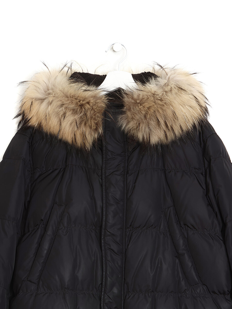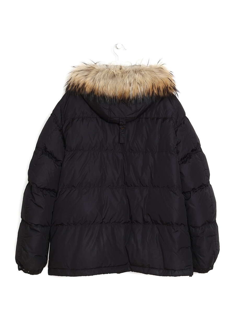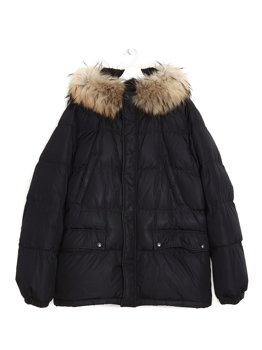 Down filled black puffer coat with racoon fur hood. Front zip closure. Front flap pockets.