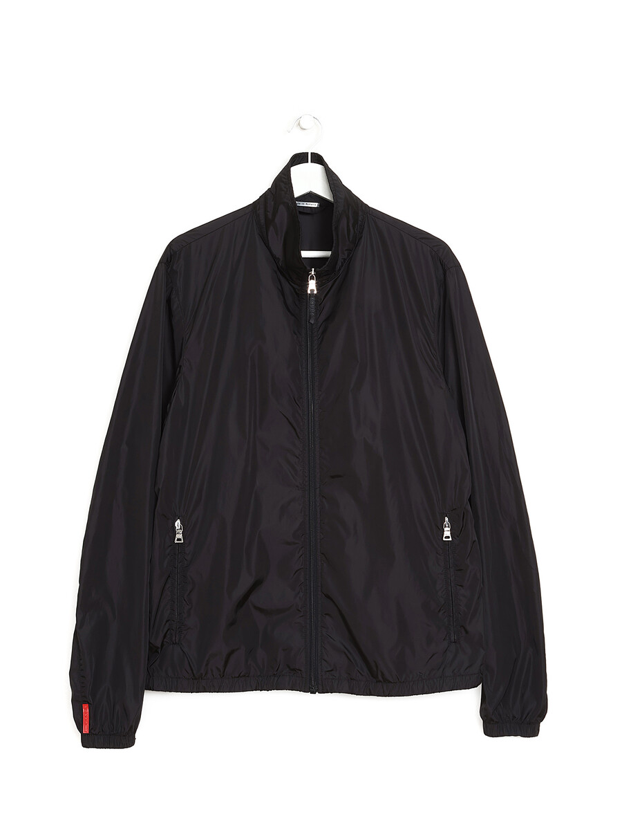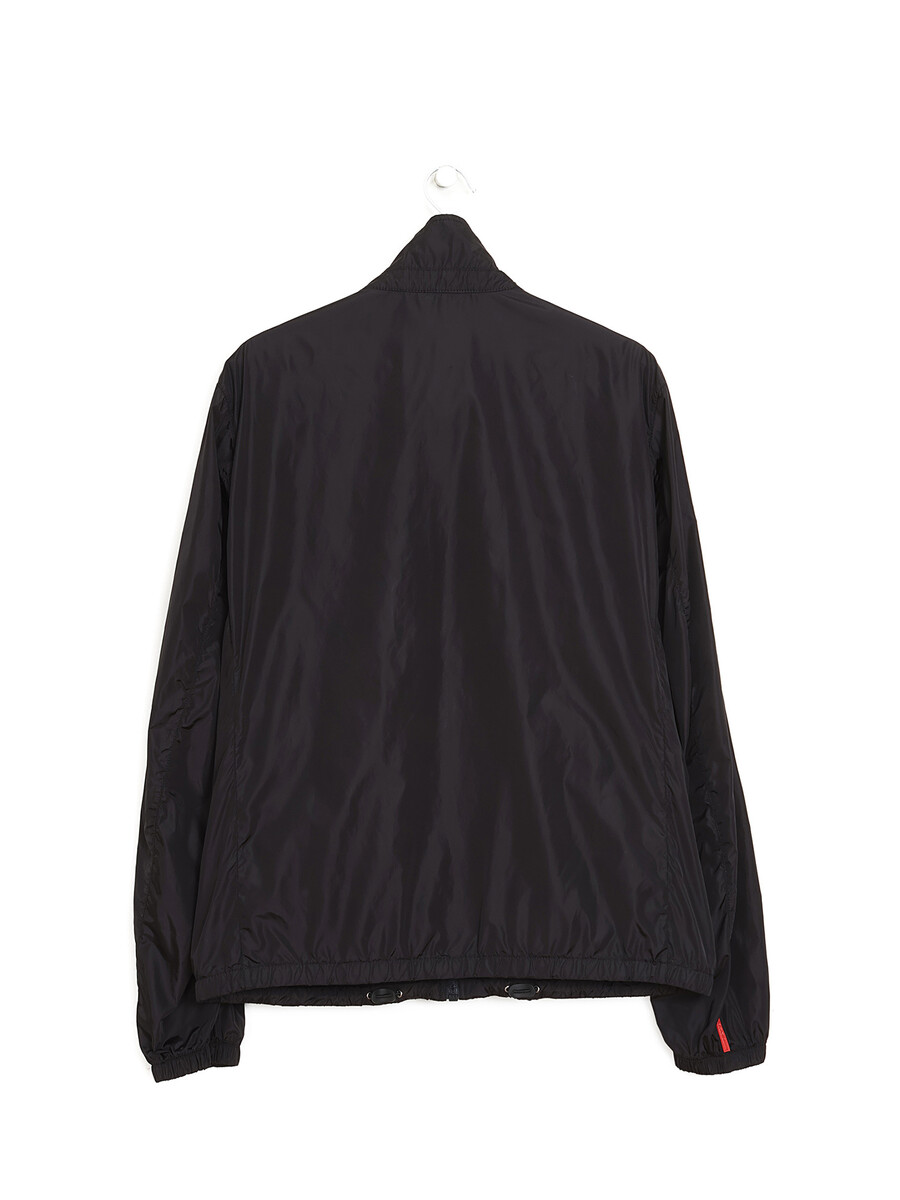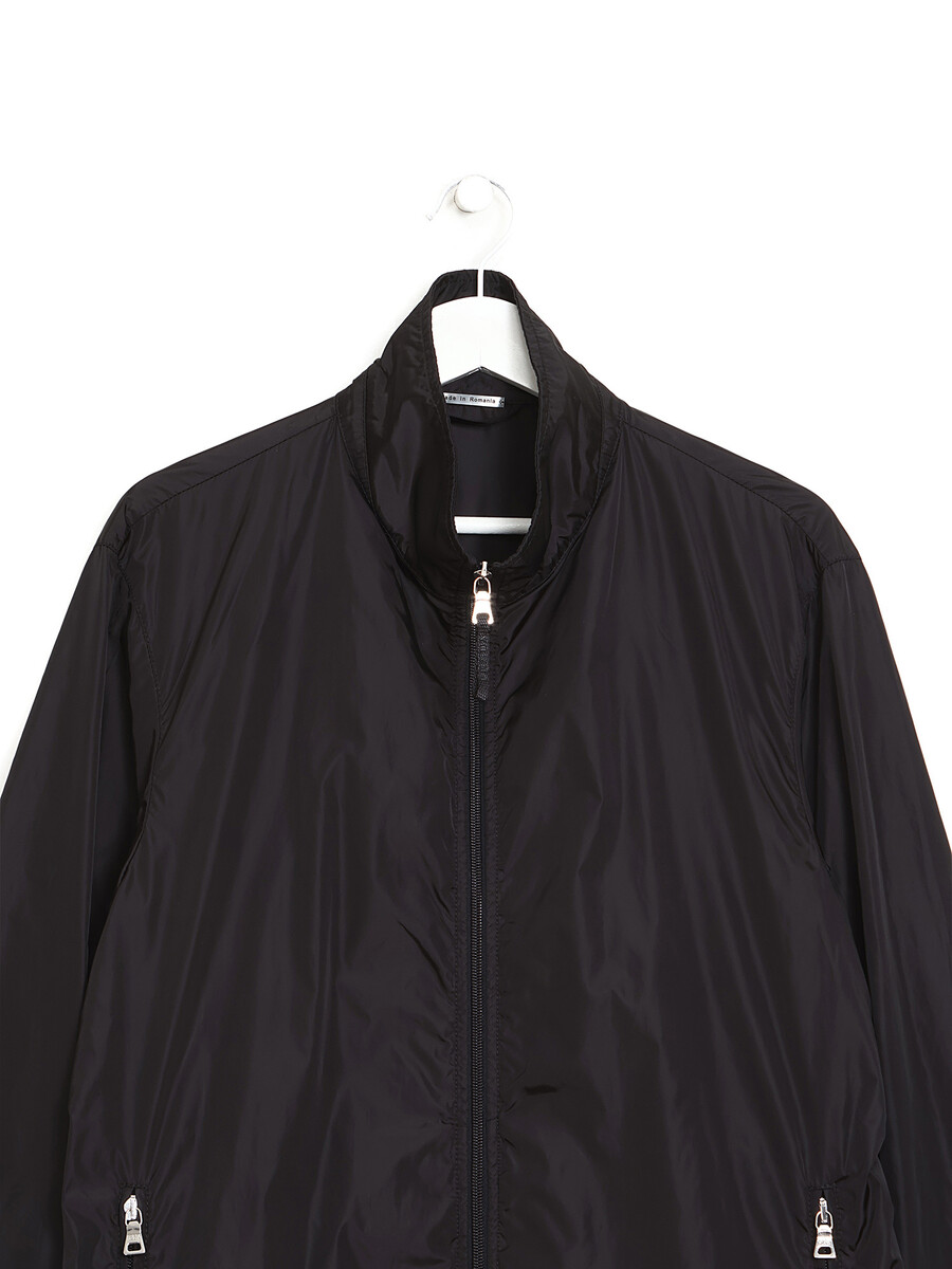 Long sleeve jacket in black. High collar. Zip closure at front. Equipped with two front pockets.