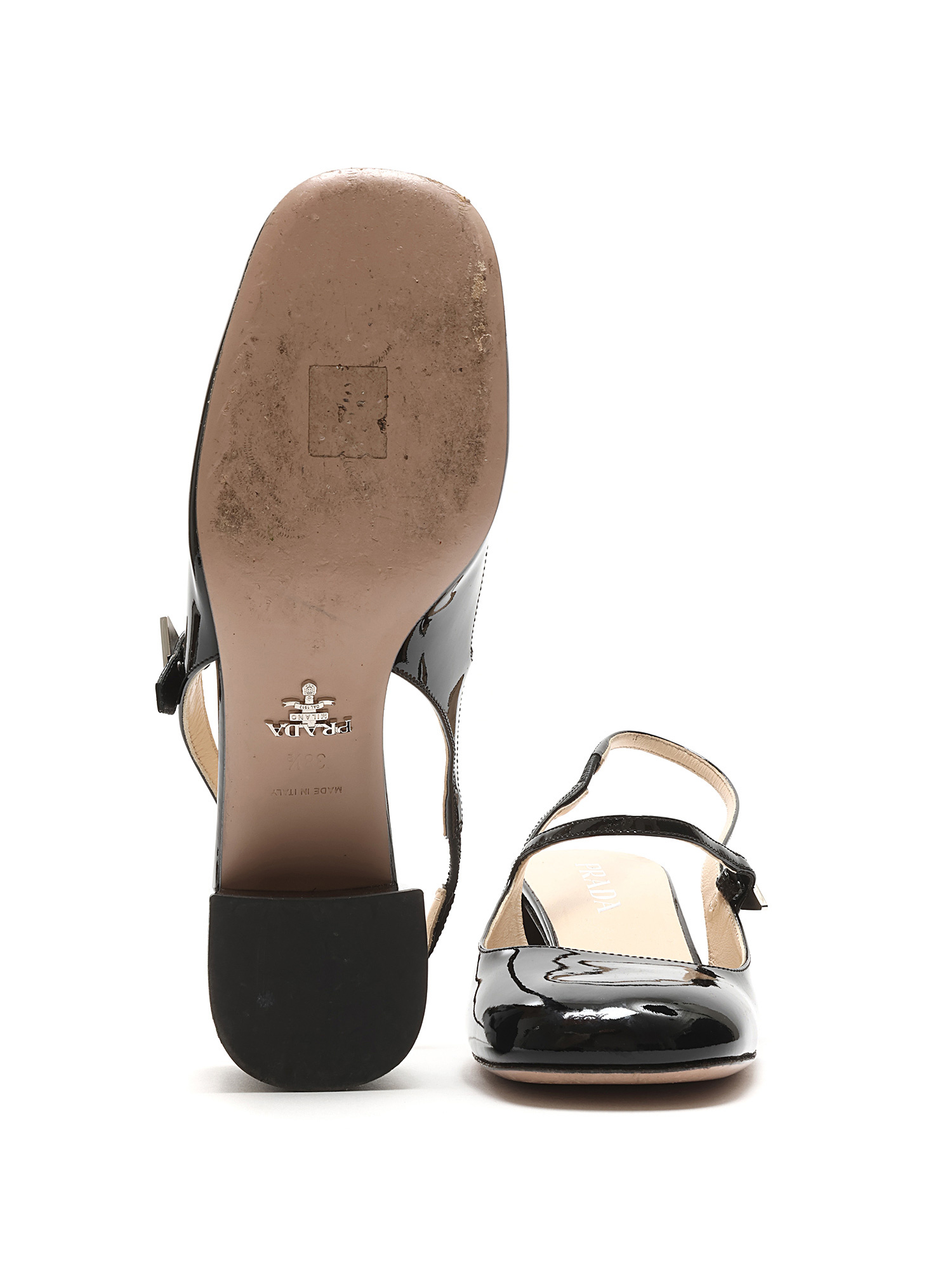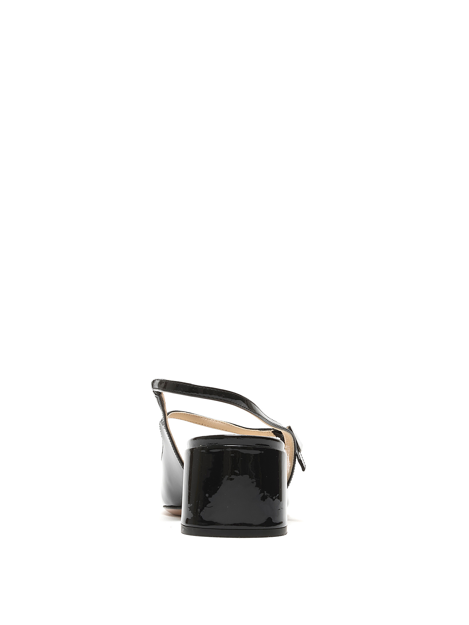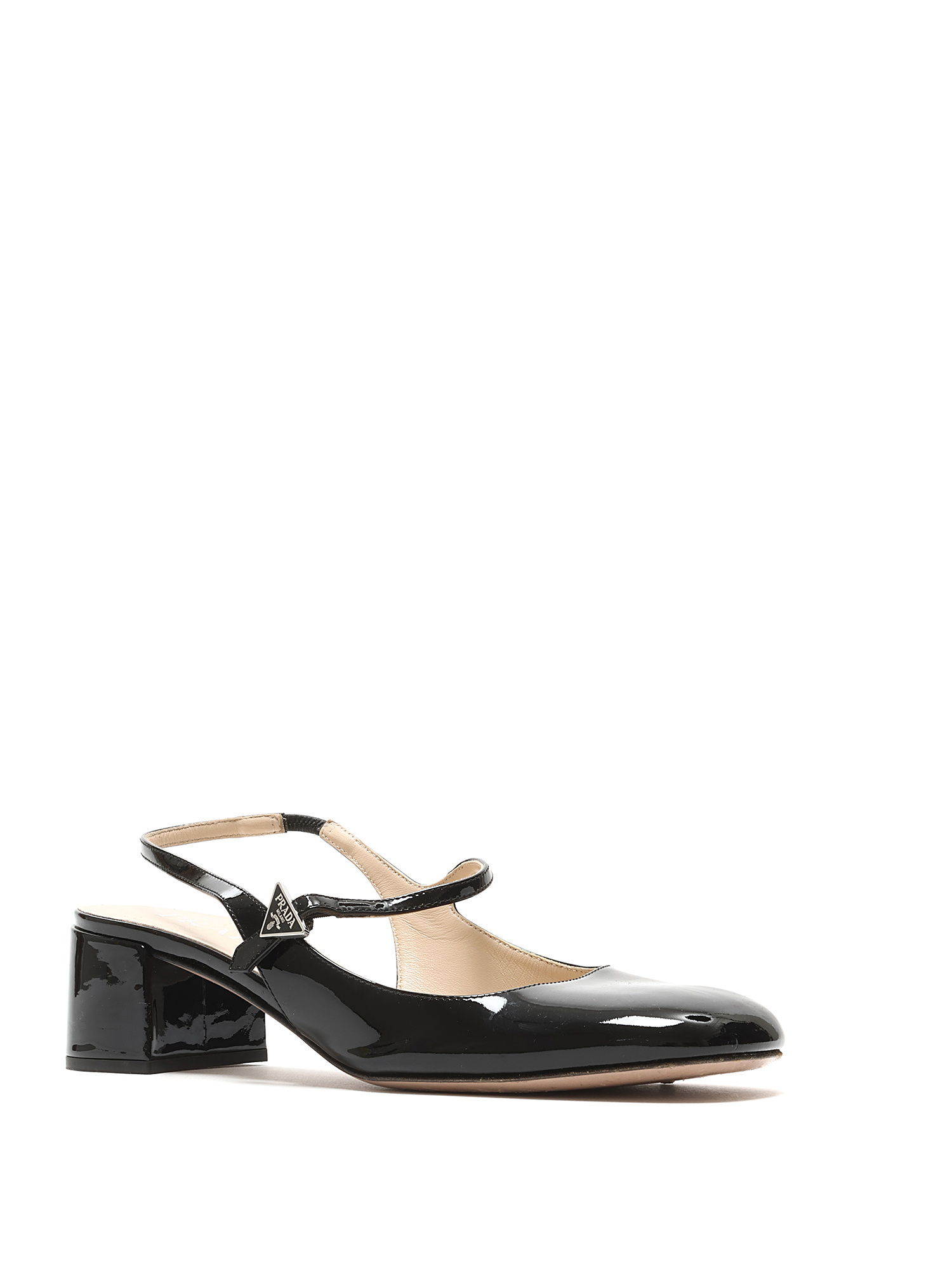 Classic black patent leather heeled pumps. Buckle closure and leather sole.