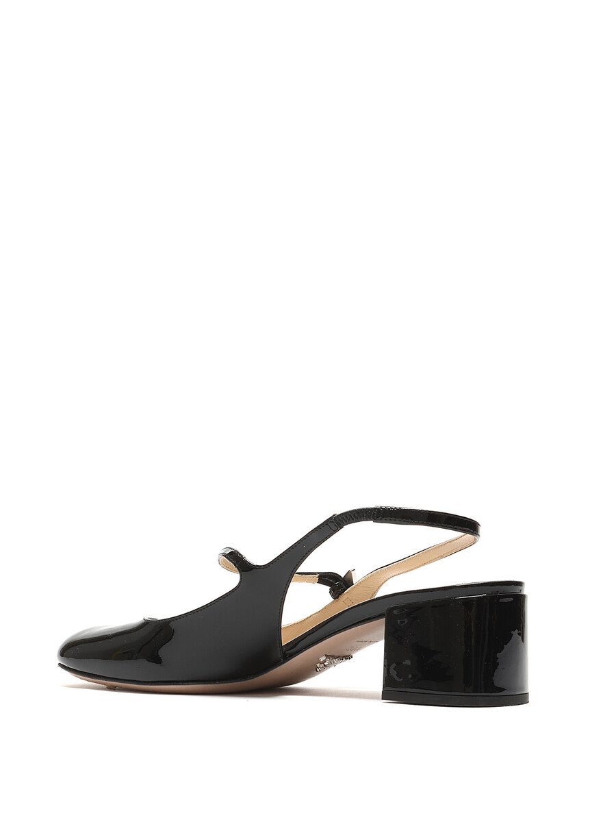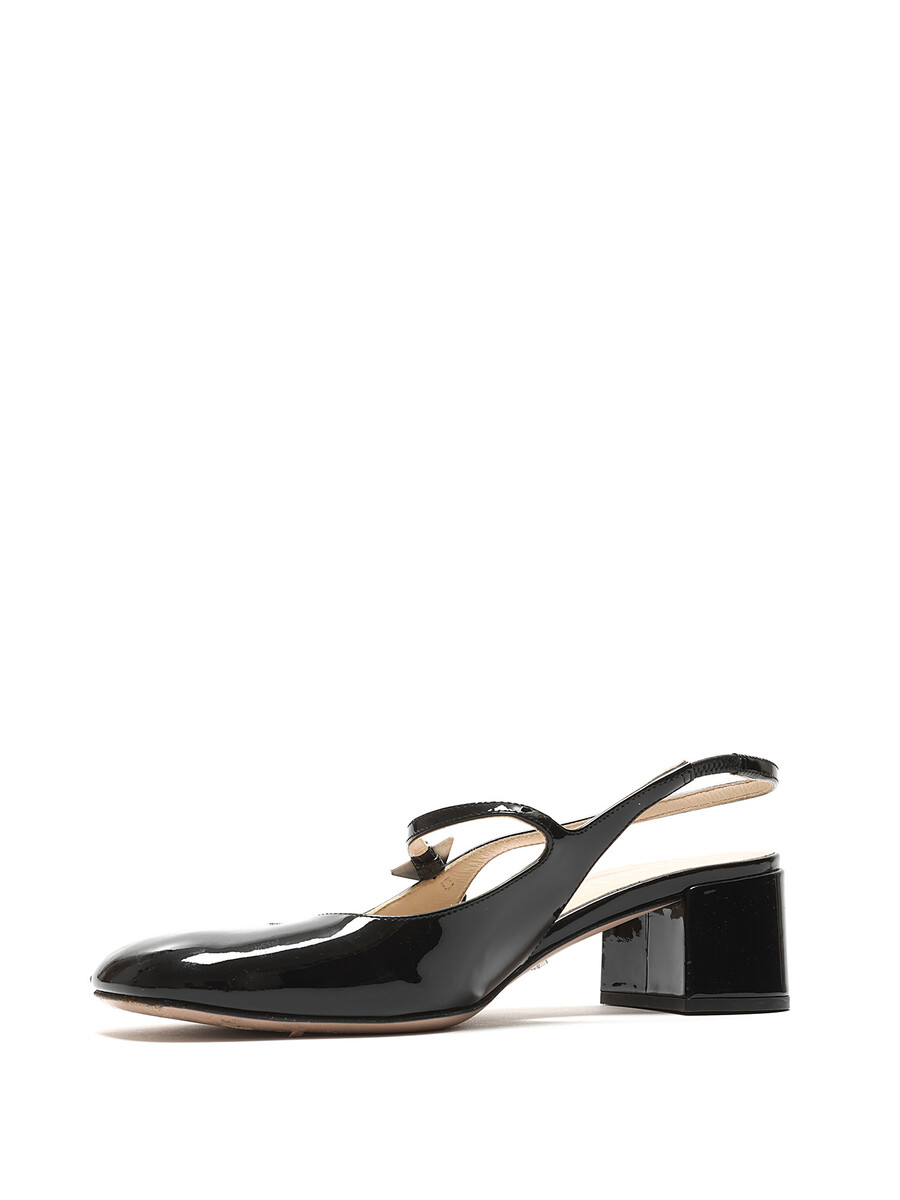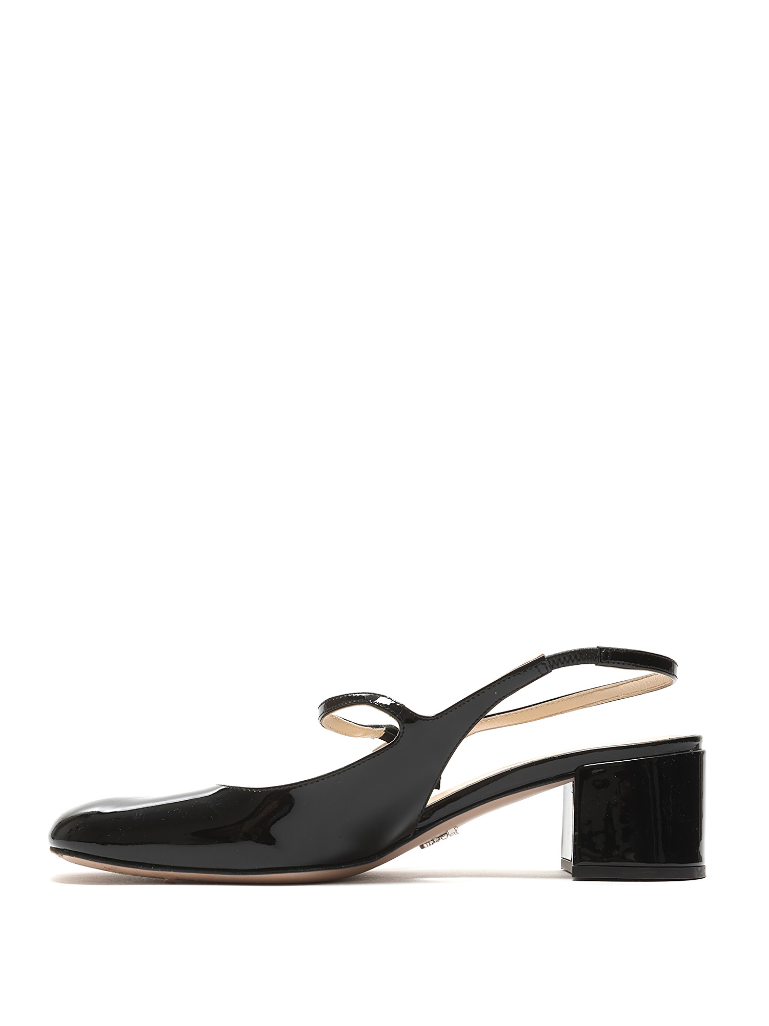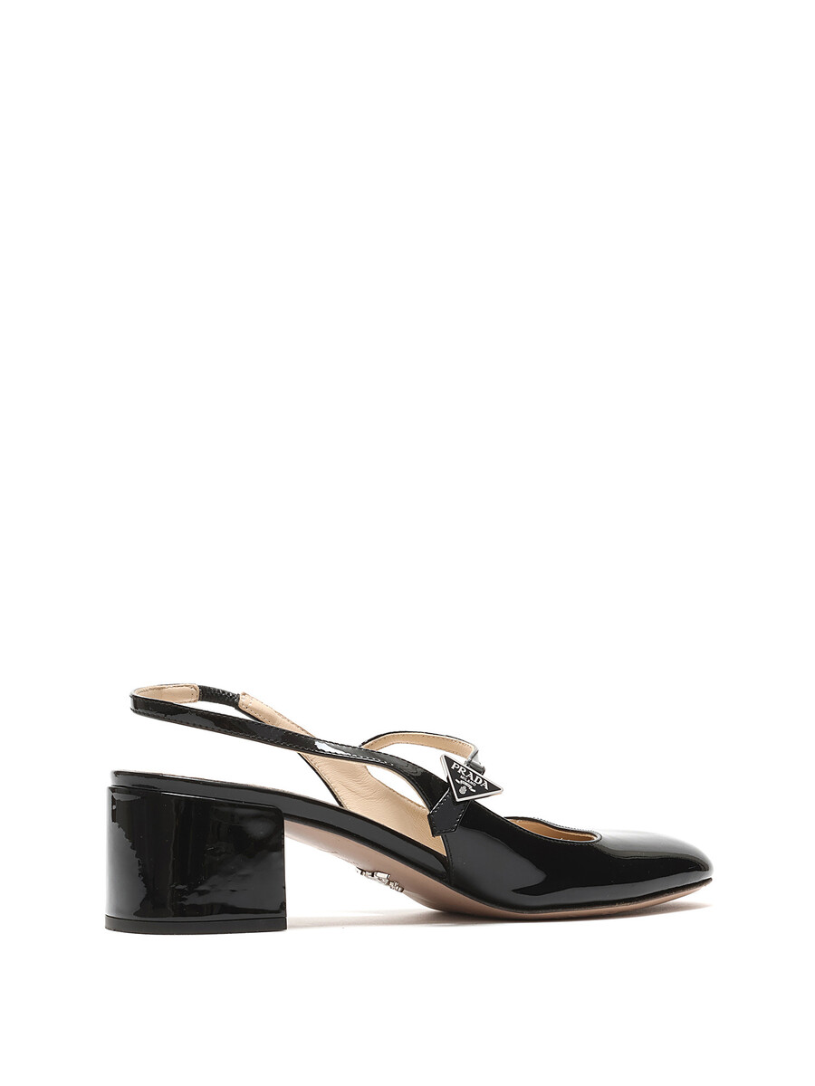 Classic black patent leather heeled pumps. Buckle closure and leather sole.