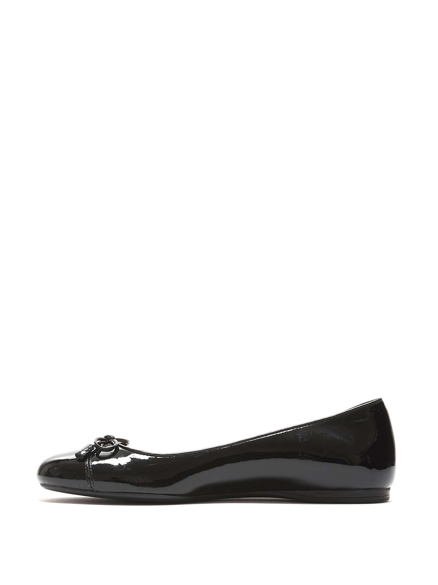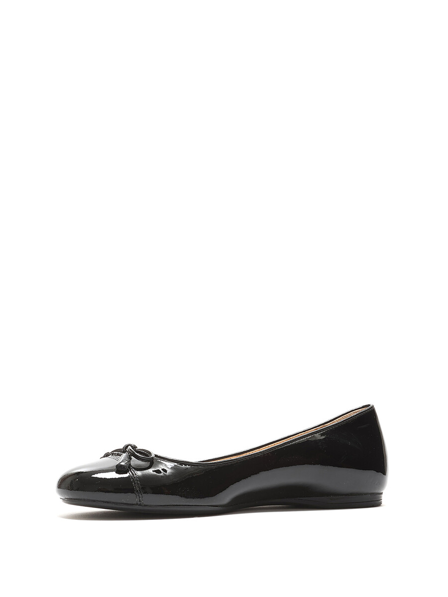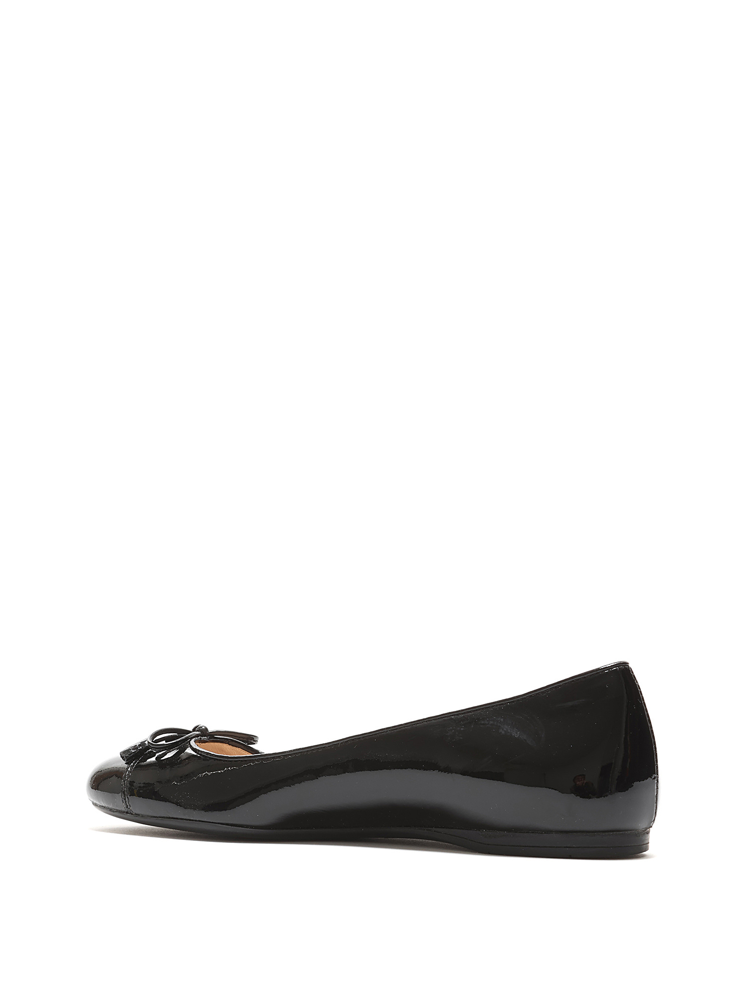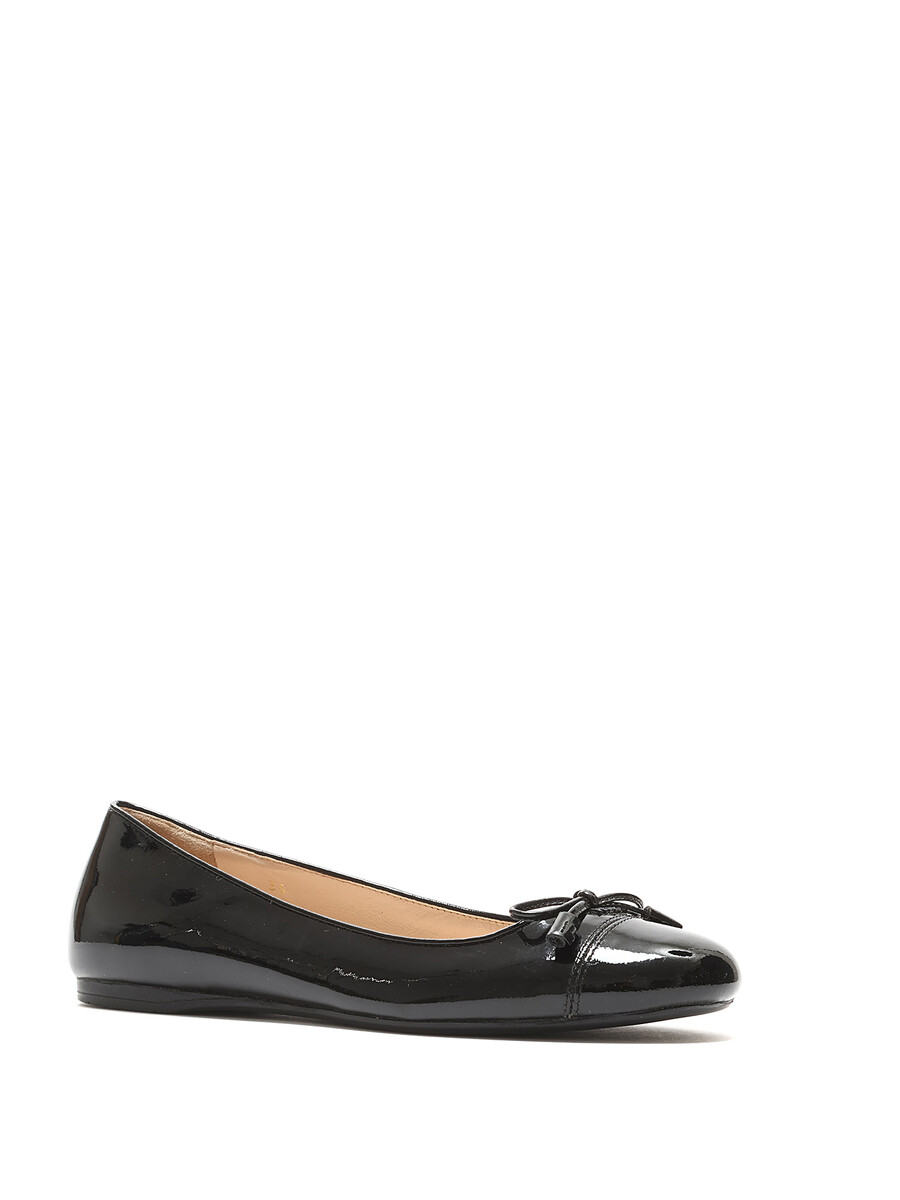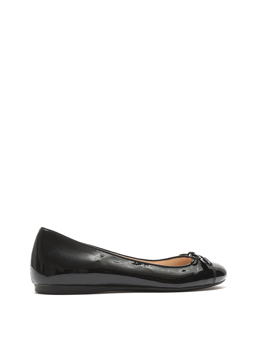 Patent leather ballet flats in black featuring a bow detail. Rounded toe. Flat rubber sole.