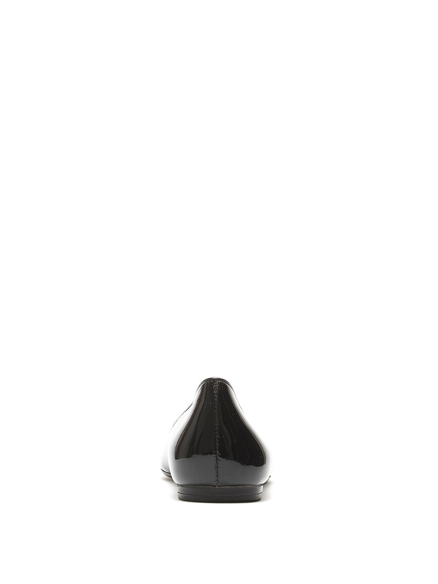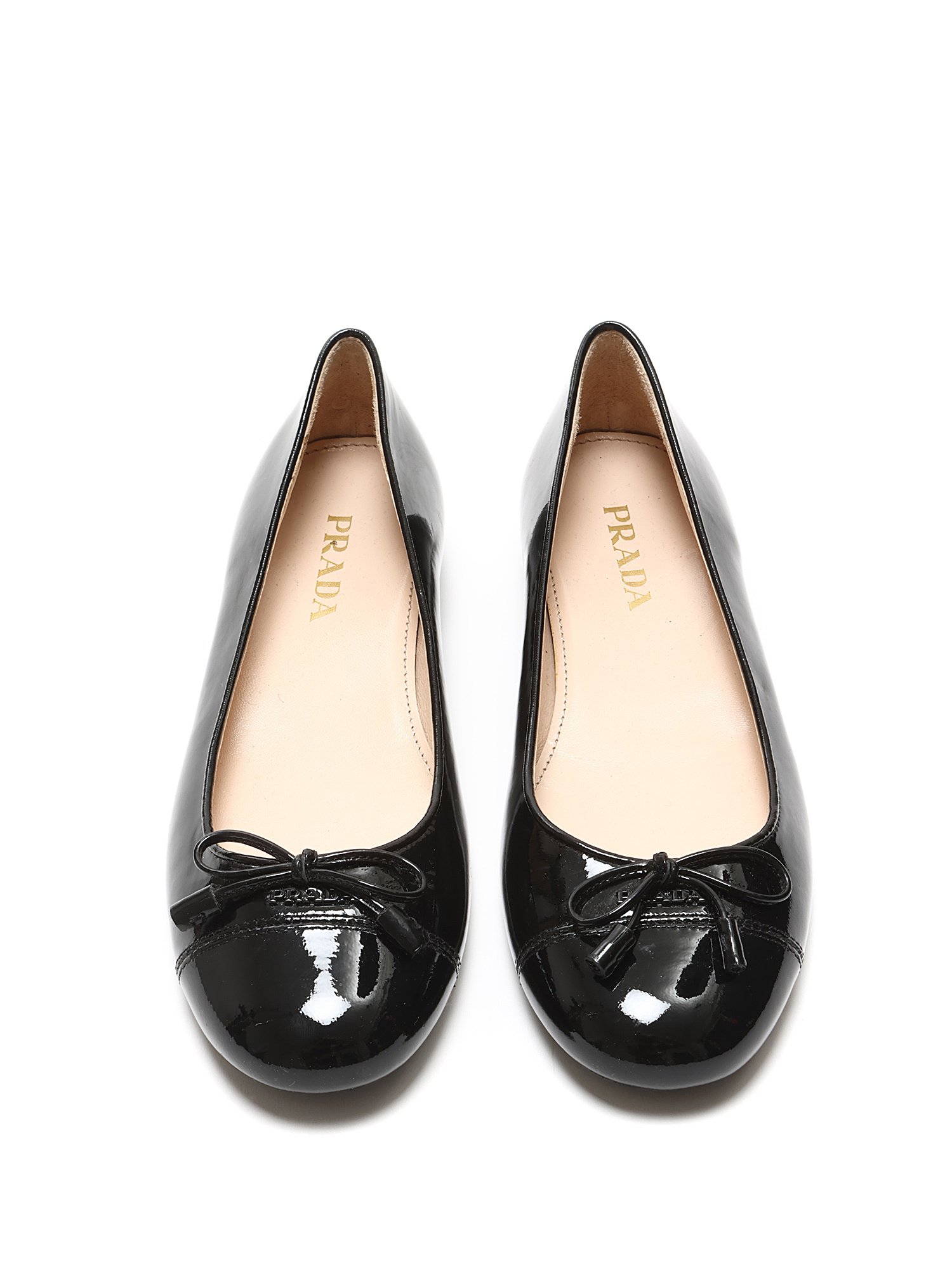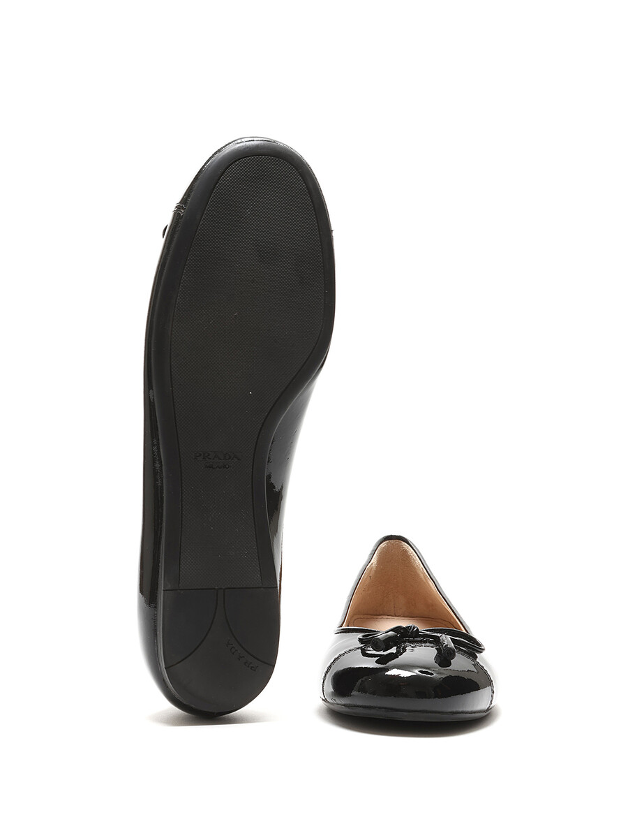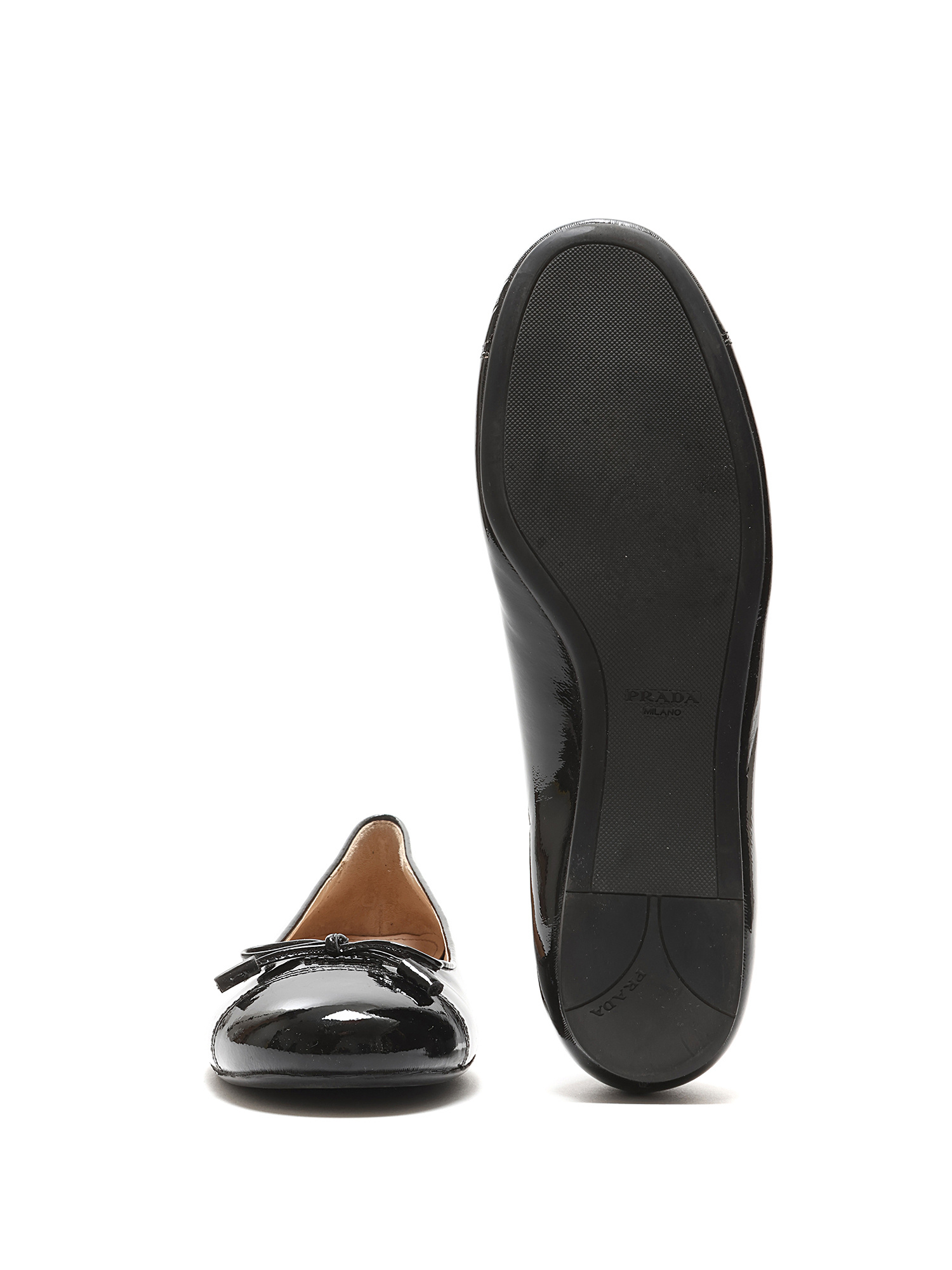 Patent leather ballet flats in black featuring a bow detail. Rounded toe. Flat rubber sole.