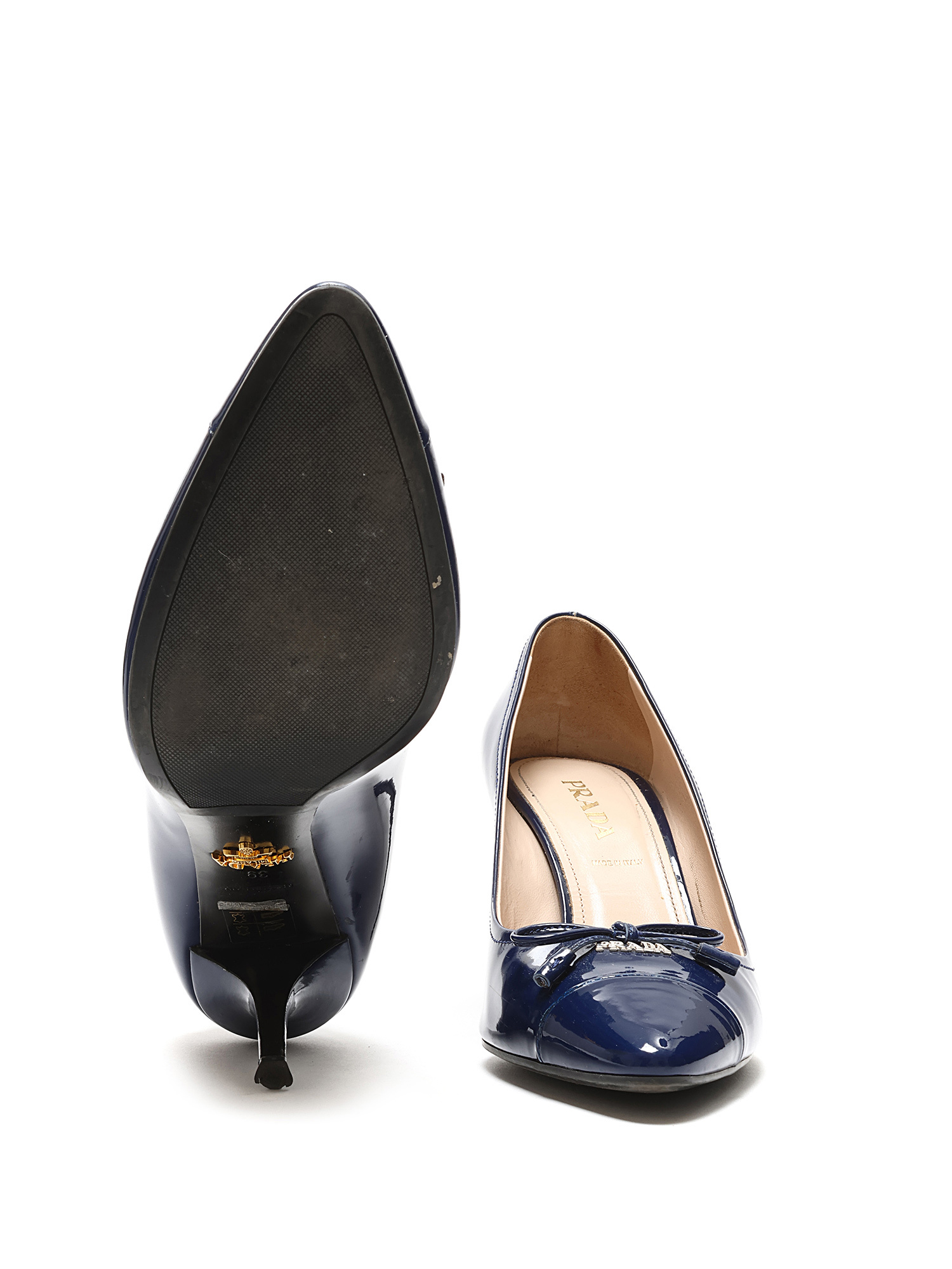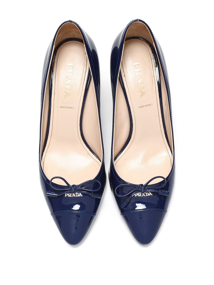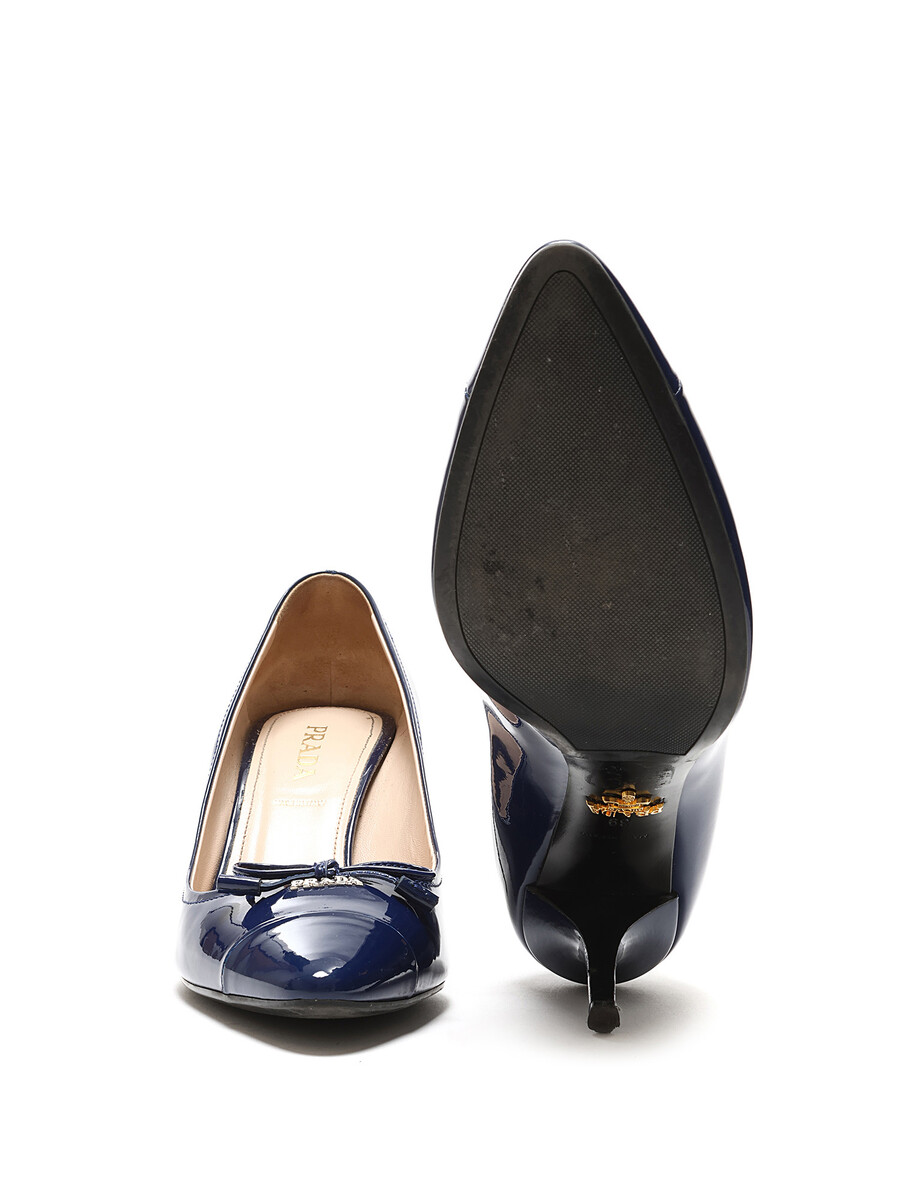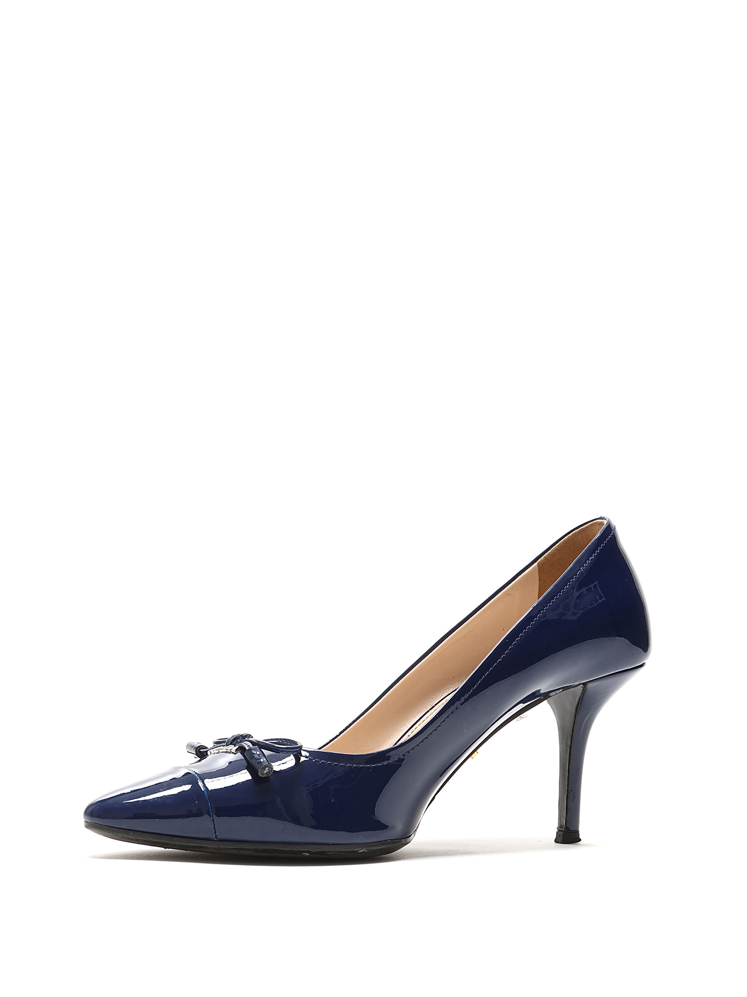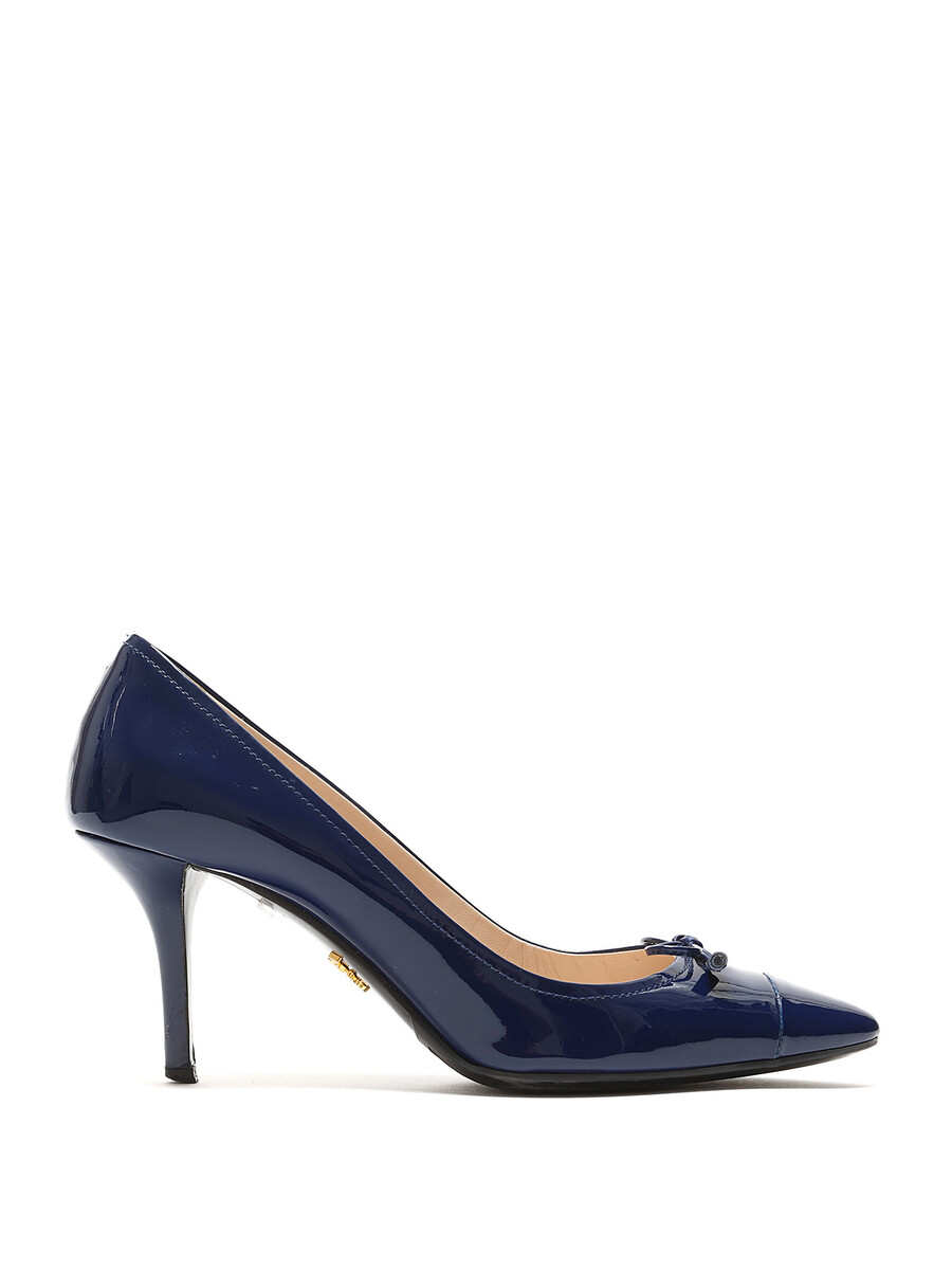 Navy blue patent leather pumps with decorative bow. Pointed toe. Lace-up closure. Leather sole.