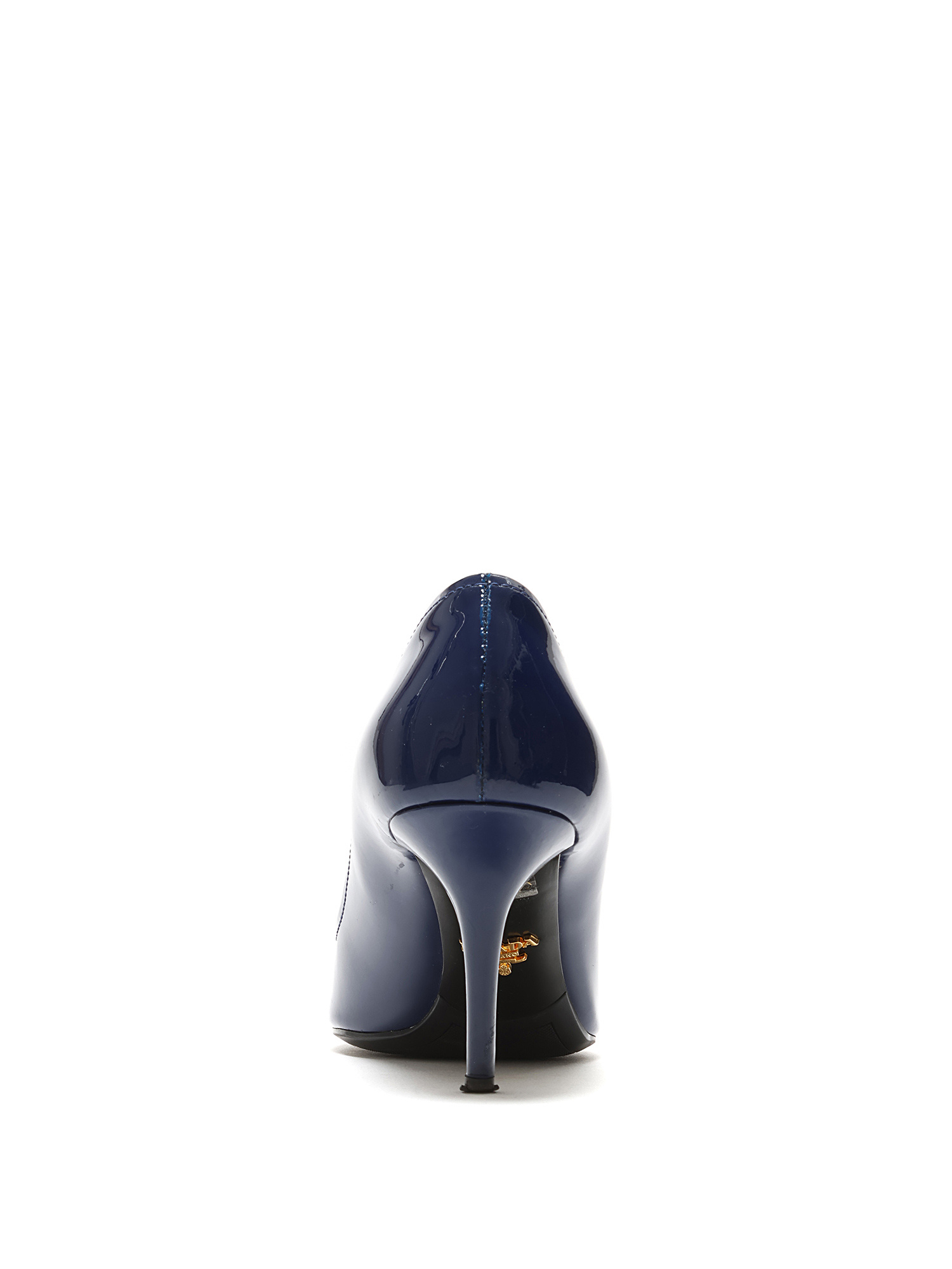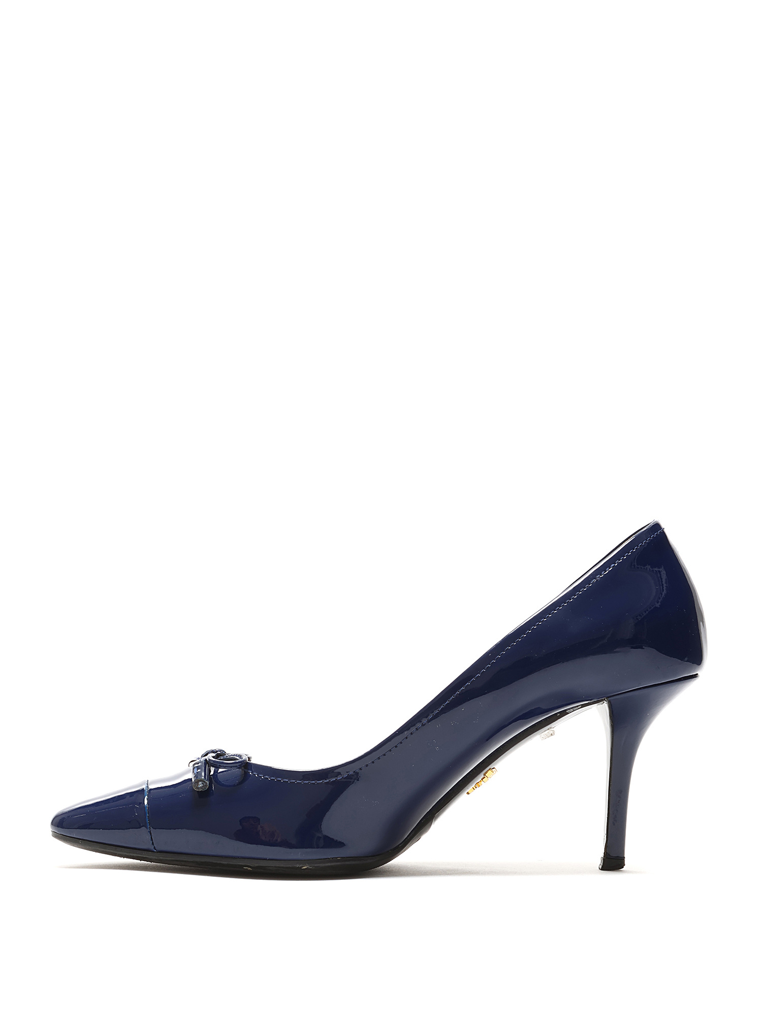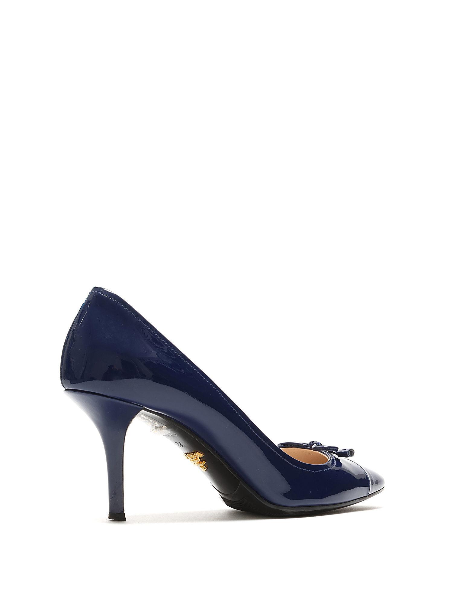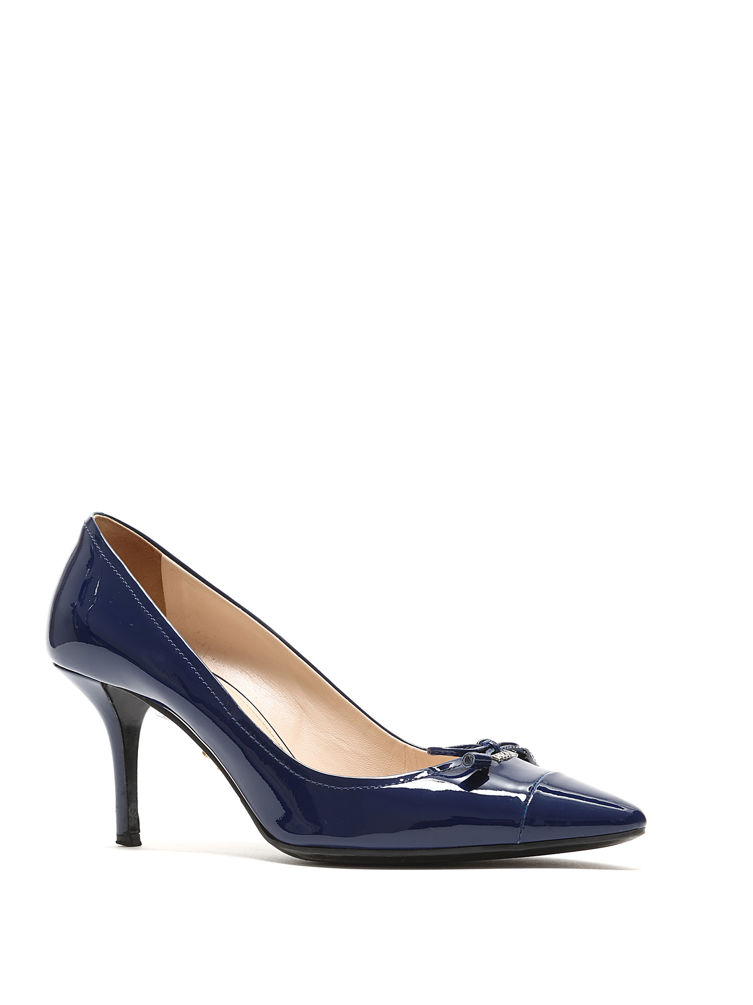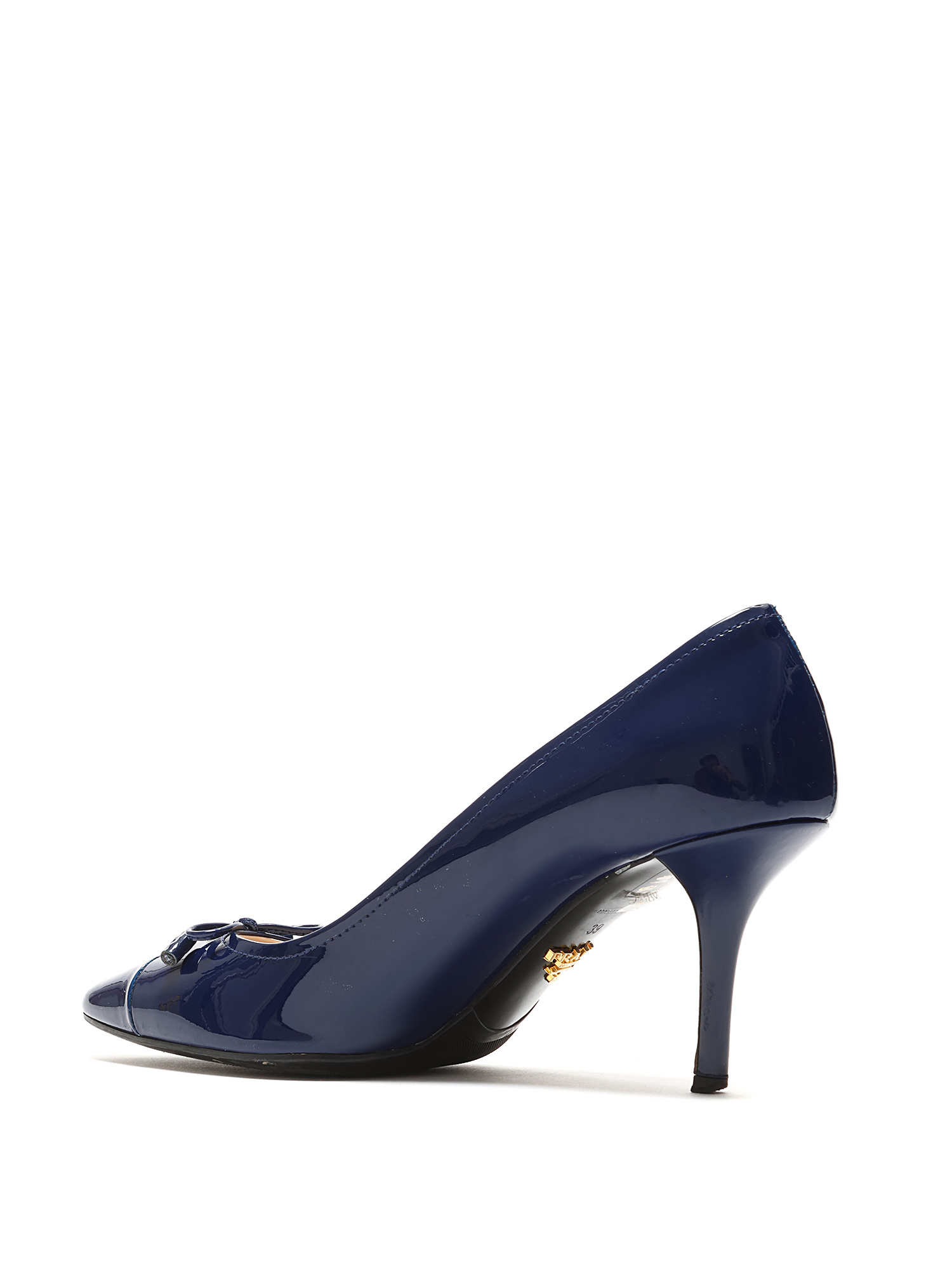 Navy blue patent leather pumps with decorative bow. Pointed toe. Lace-up closure. Leather sole.