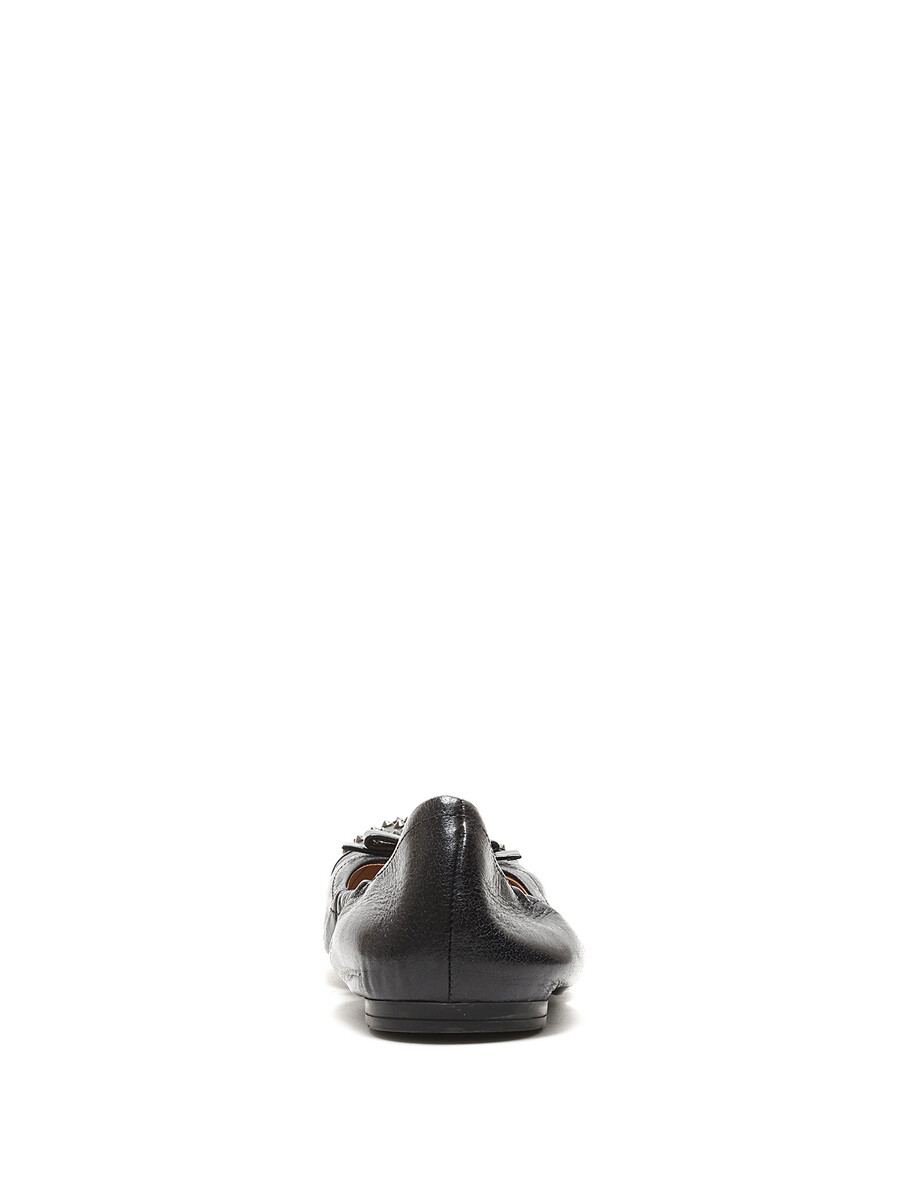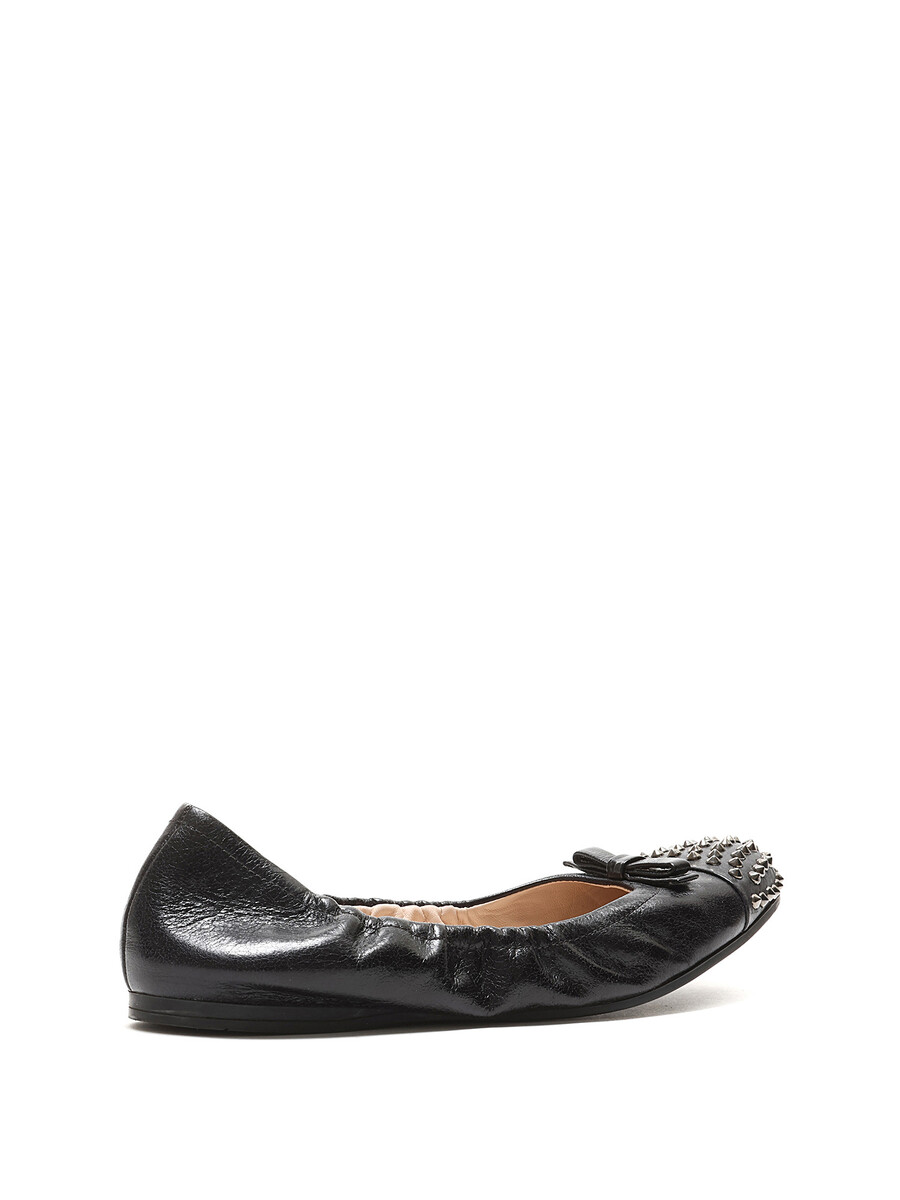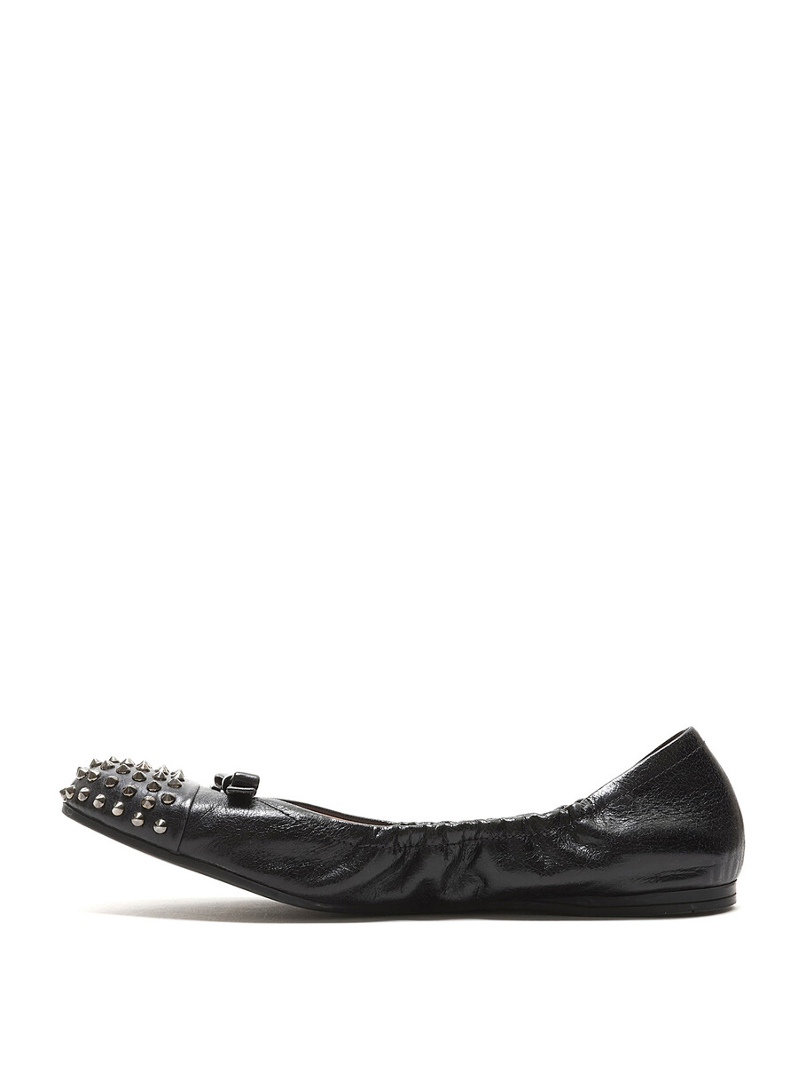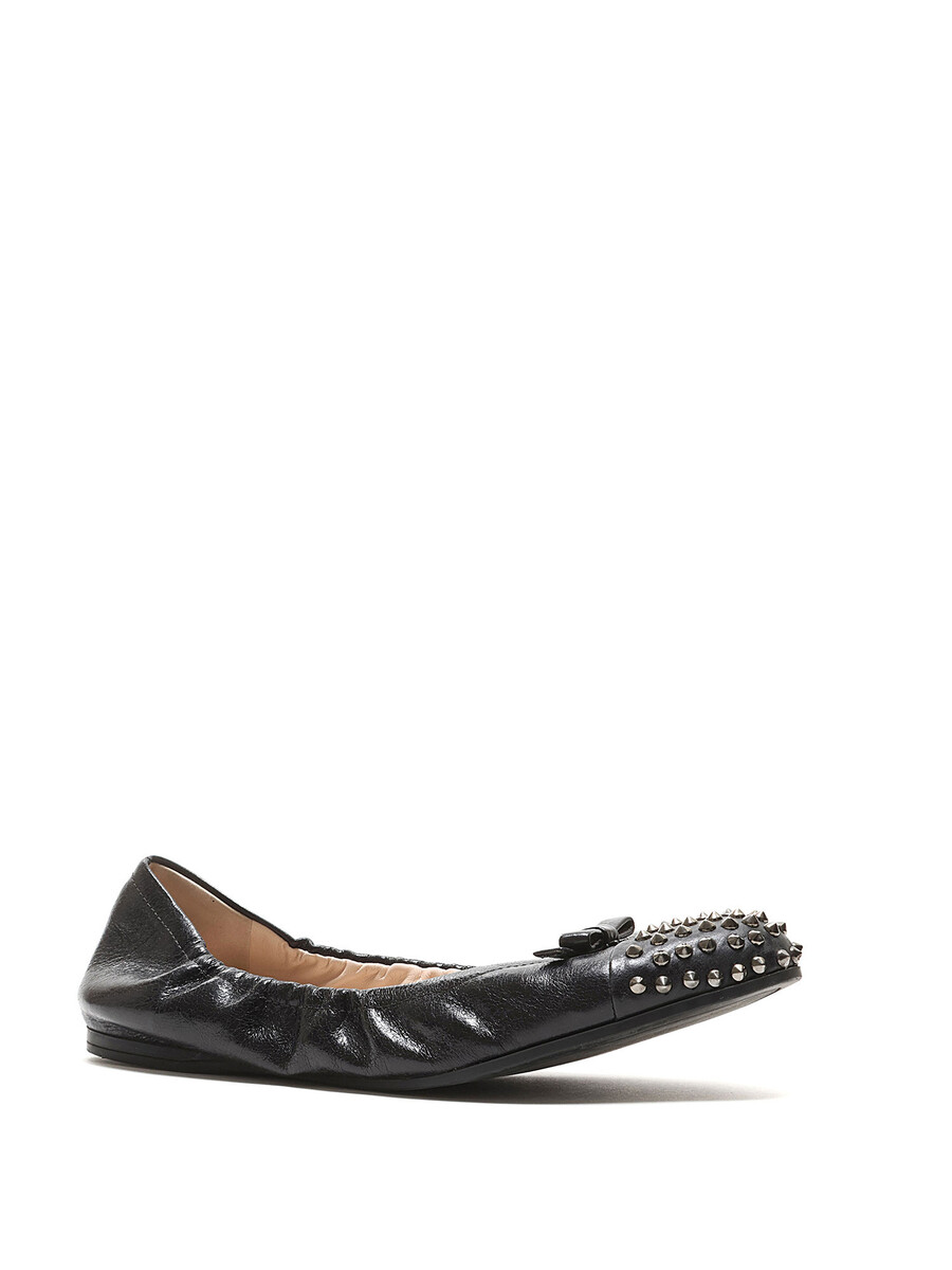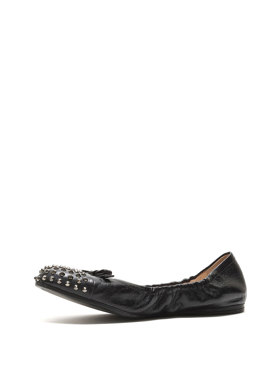 Grained leather ballet flats in black featuring decorative metal studs at the toe. Slip-on style with a round toe and durable rubber sole.