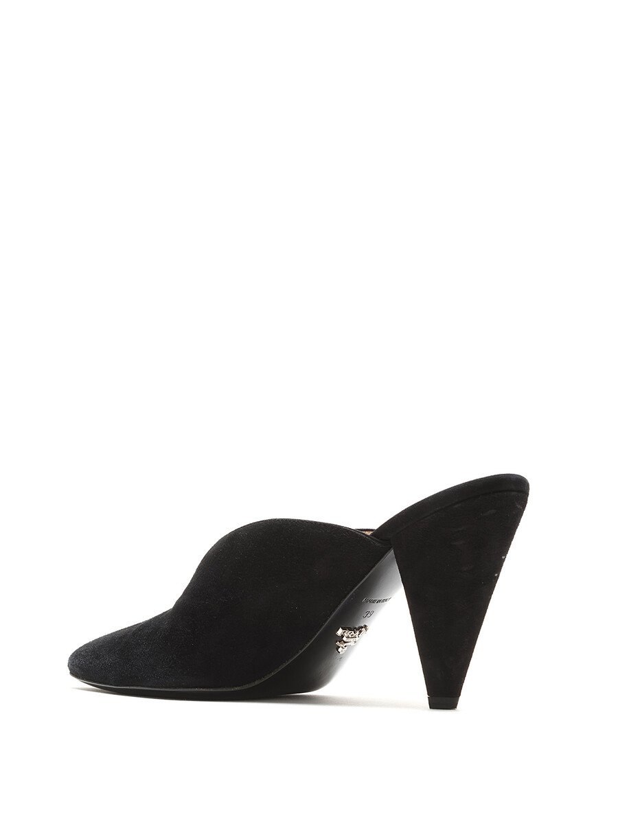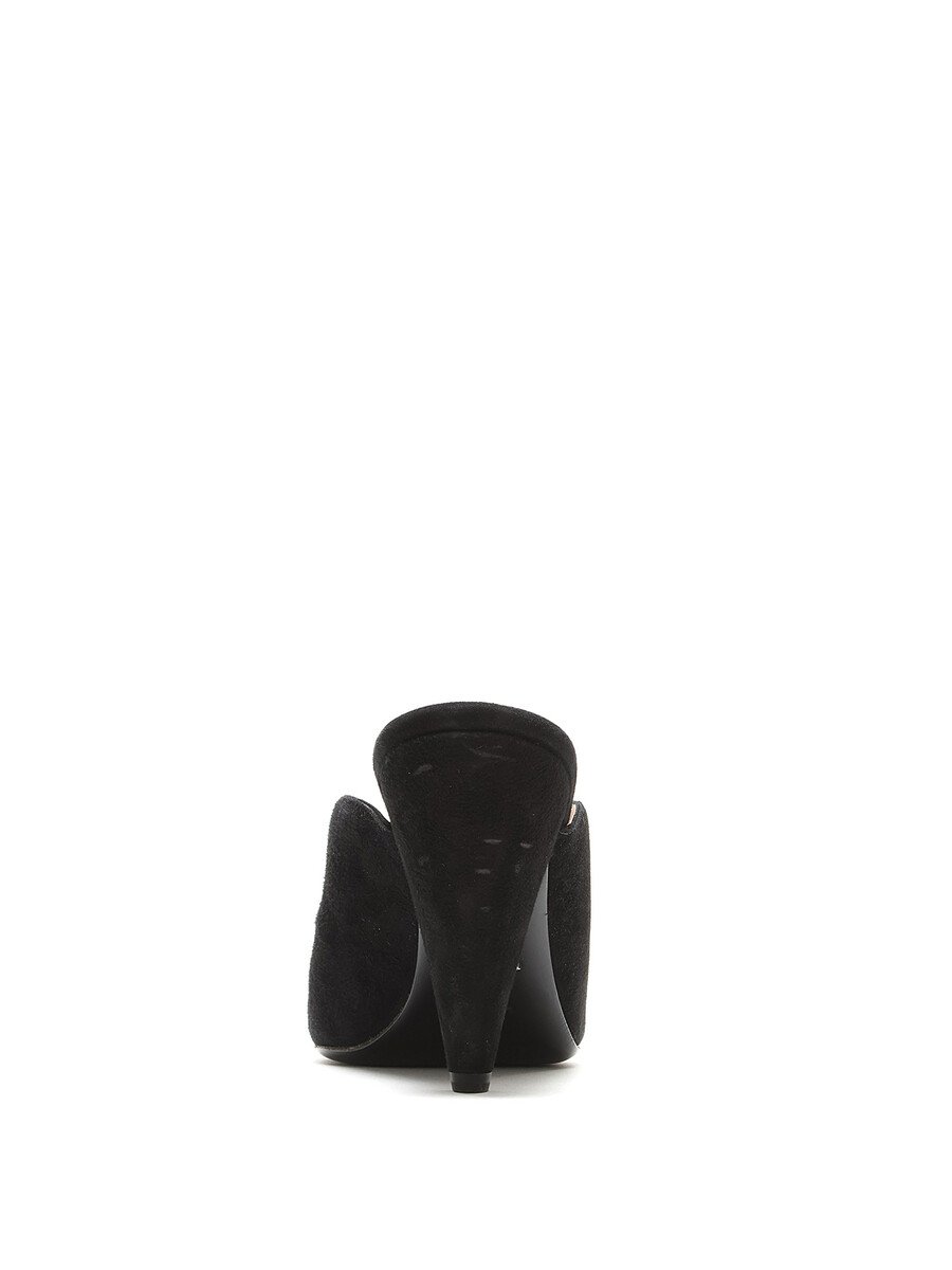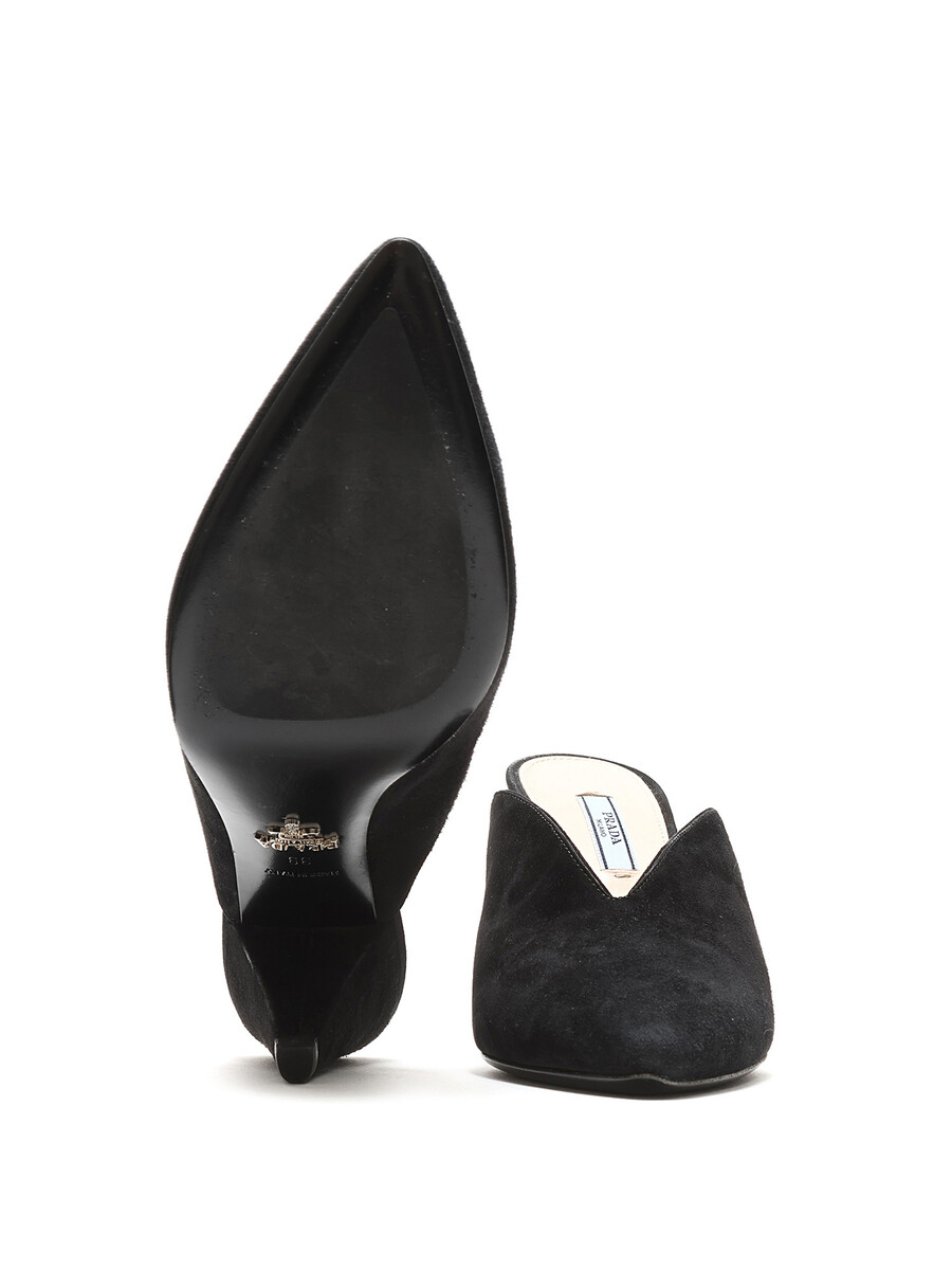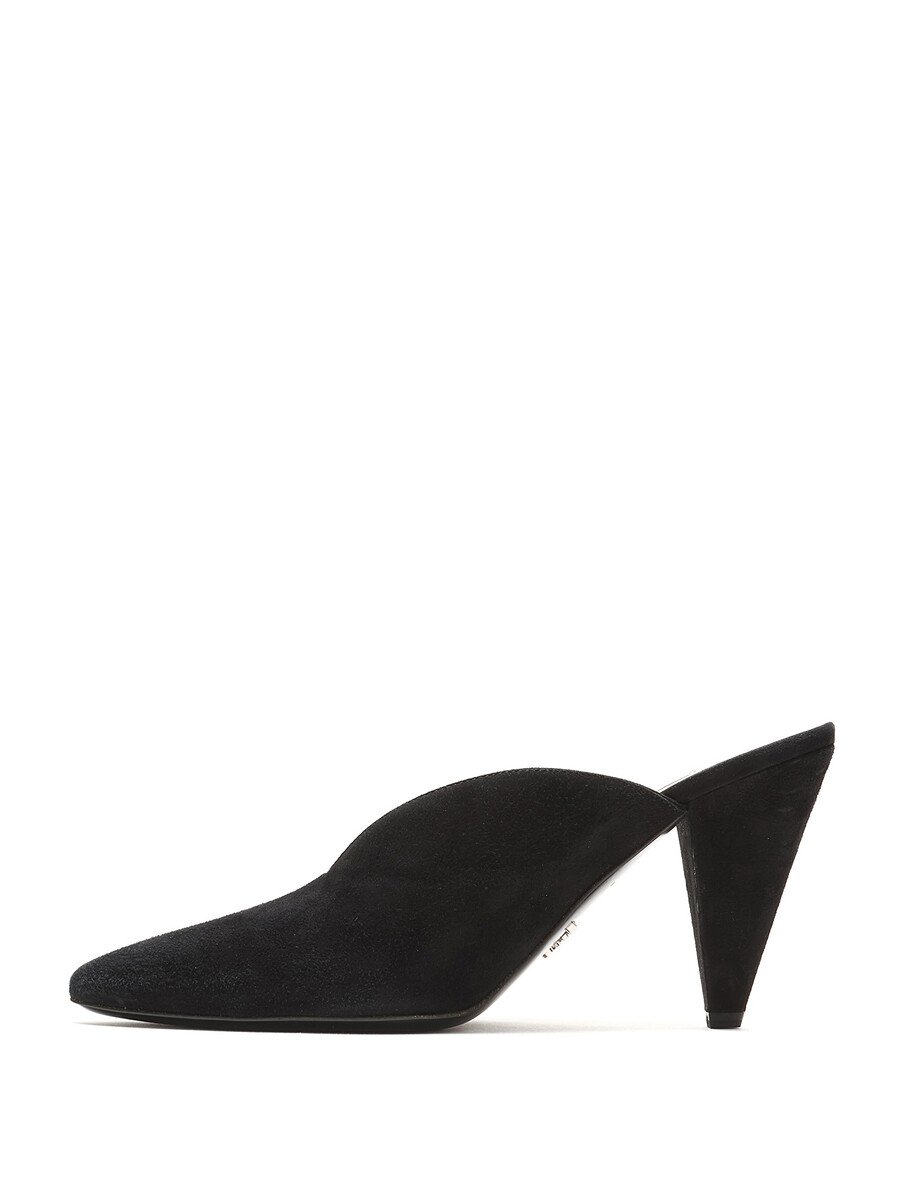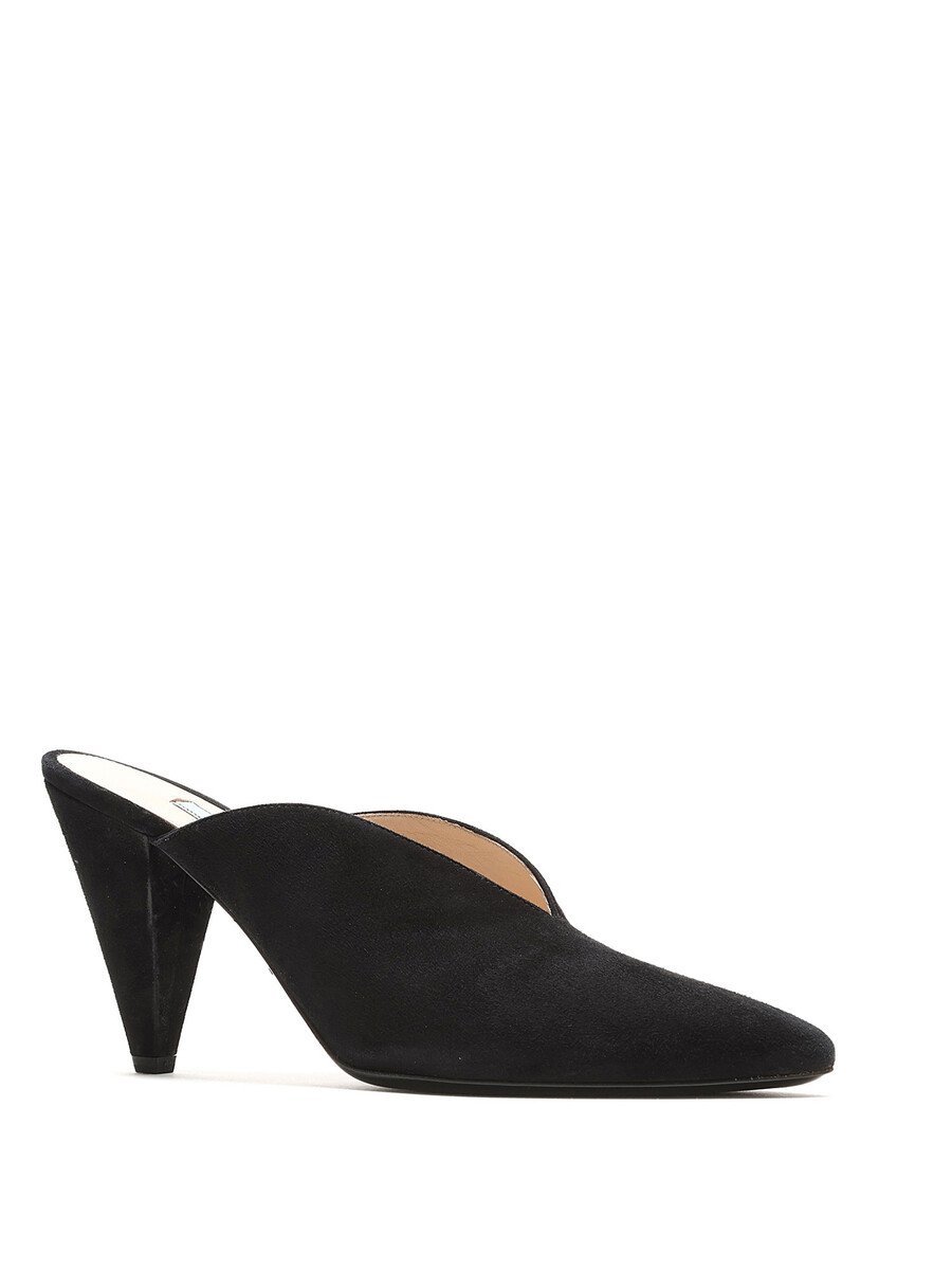 Suede pointed toe mules in black. Sleek silhouette with a sophisticated pointed toe. Leather sole.