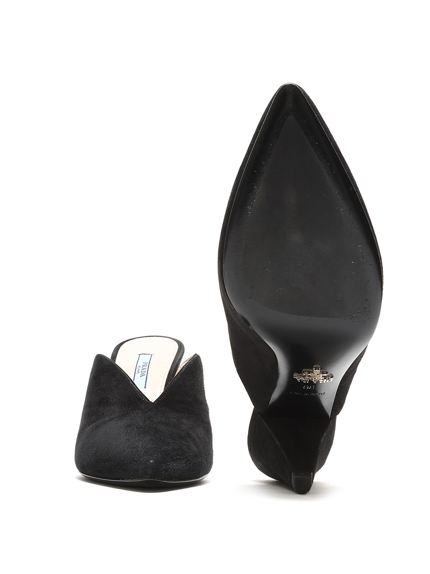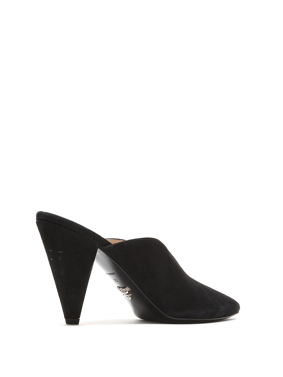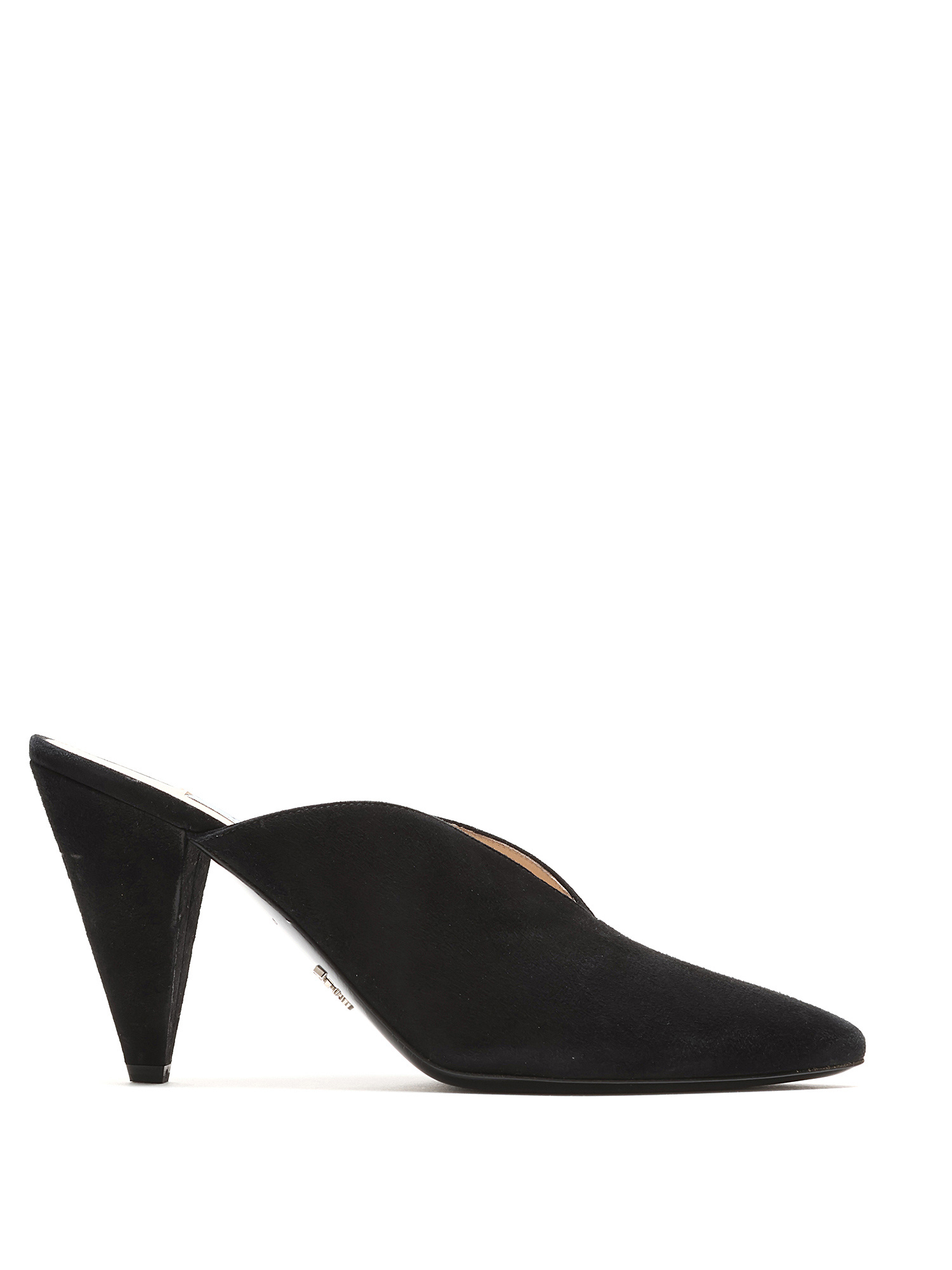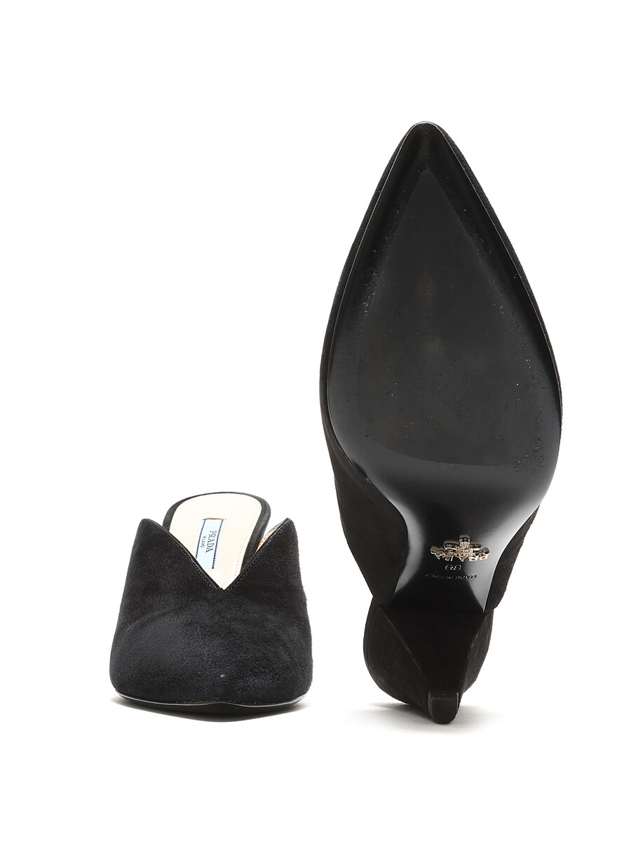 Suede pointed toe mules in black. Sleek silhouette with a sophisticated pointed toe. Leather sole.