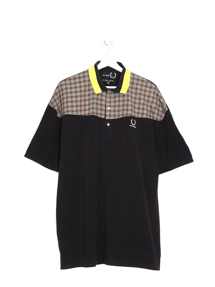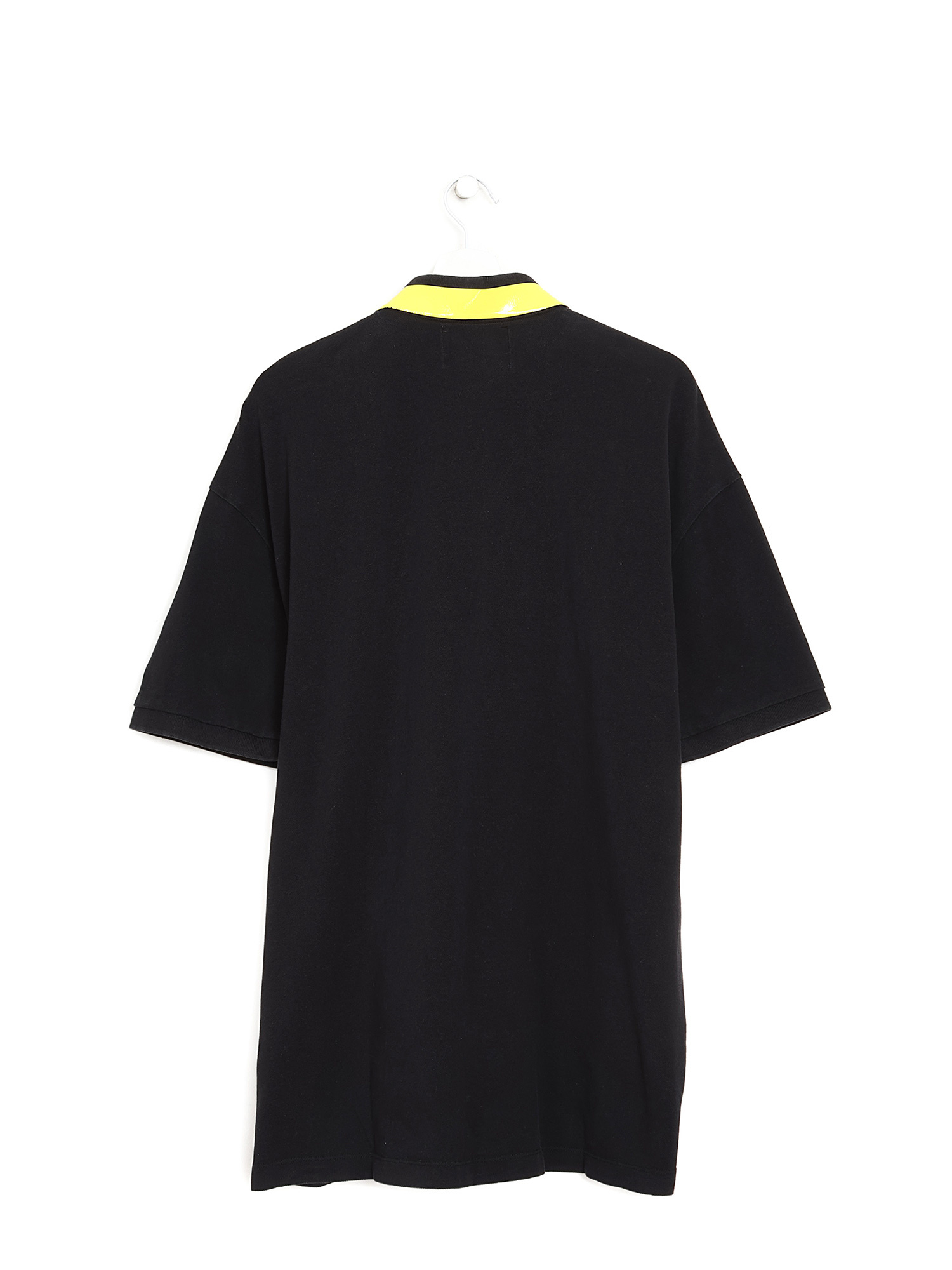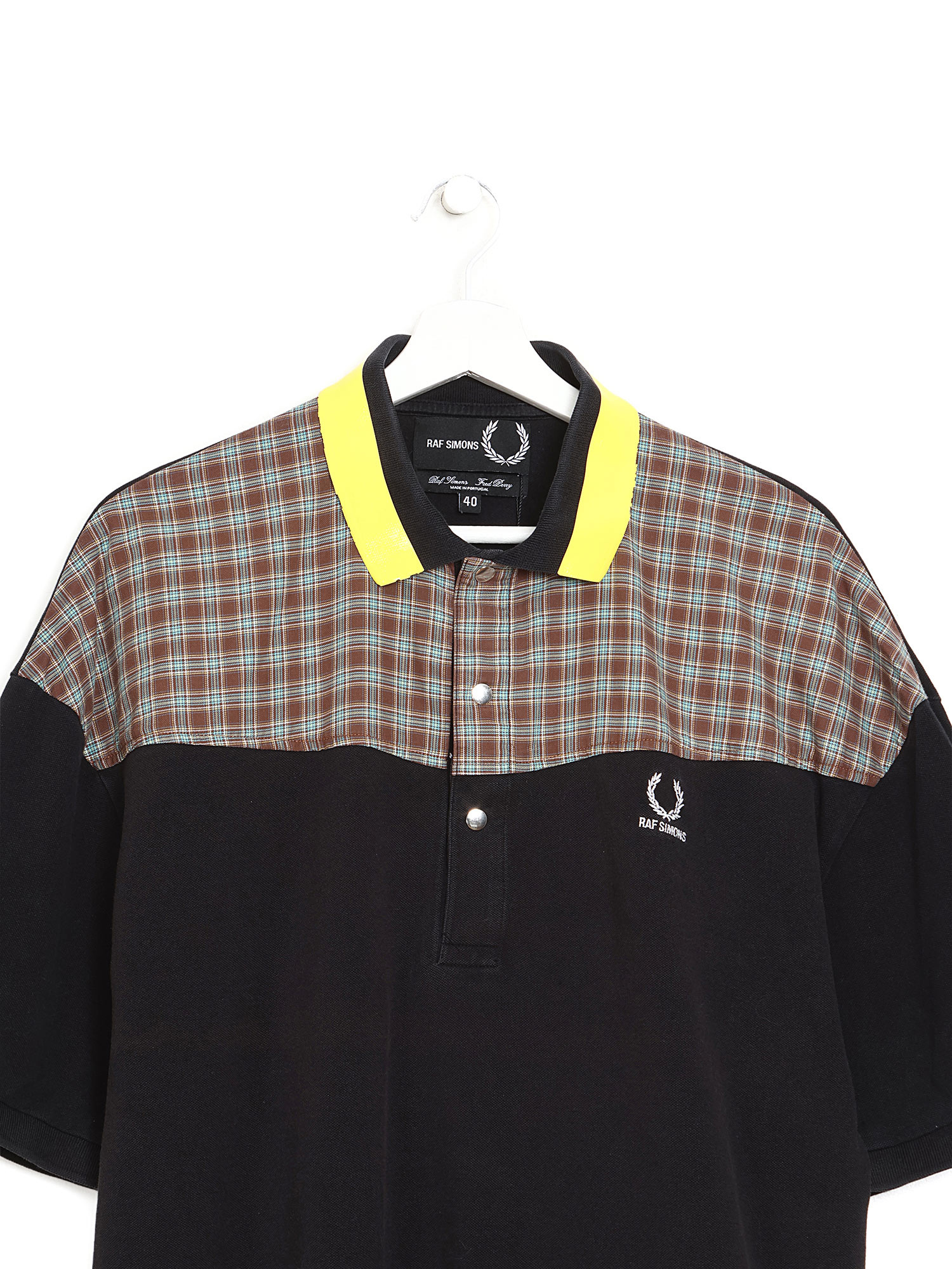 Long sleeve polo in black featuring plaid panel. Classic collar with yellow trim.