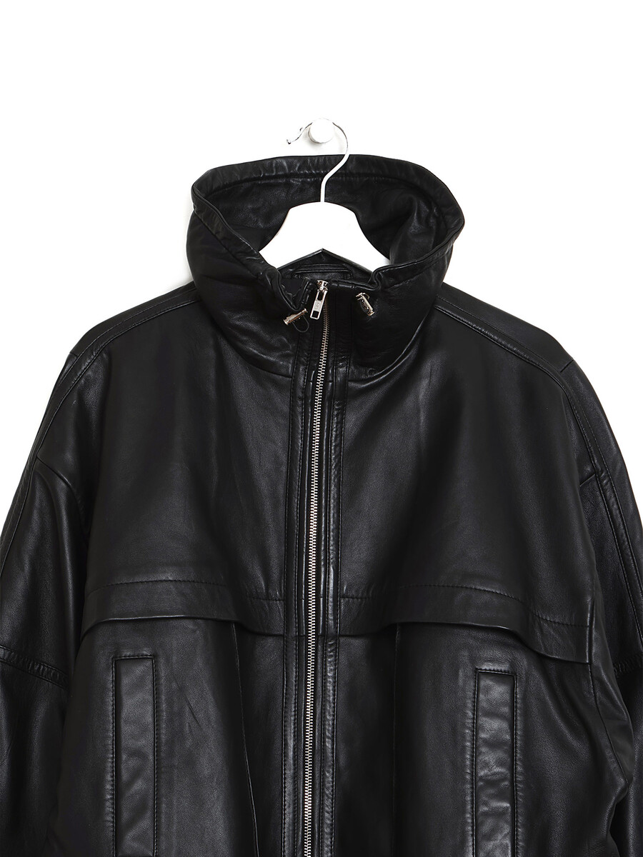 Grained leather jacket in black with a stand collar and a front zipper closure.