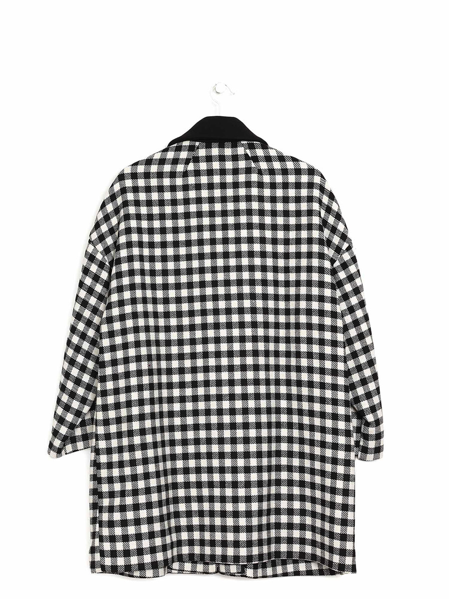Mid-length long sleeve jacket with black and white check pattern and embellished collar. Made of a wool blend.