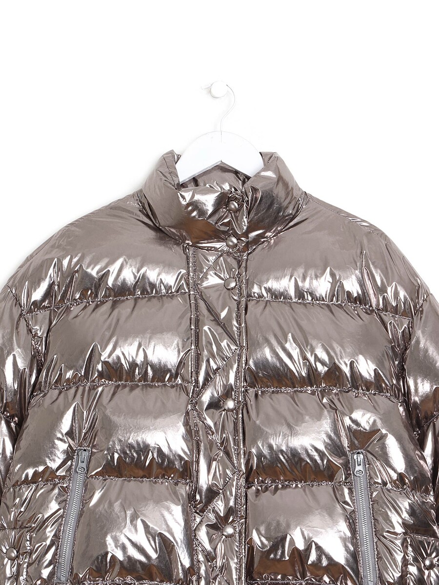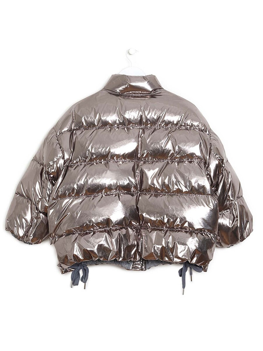 Quilted puffer coat with rose gold shimmer. Hidden zip closure at front with buttons. Two side pockets. High collar with buttons at cuffs and sides. Tie closure at sides.