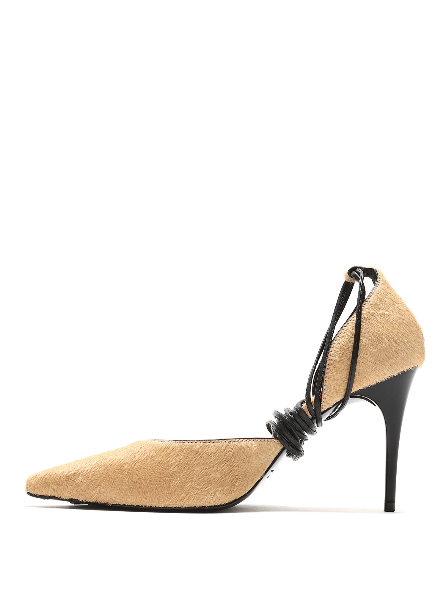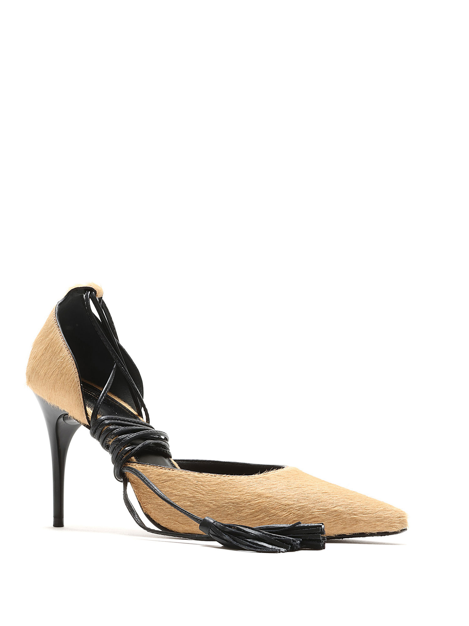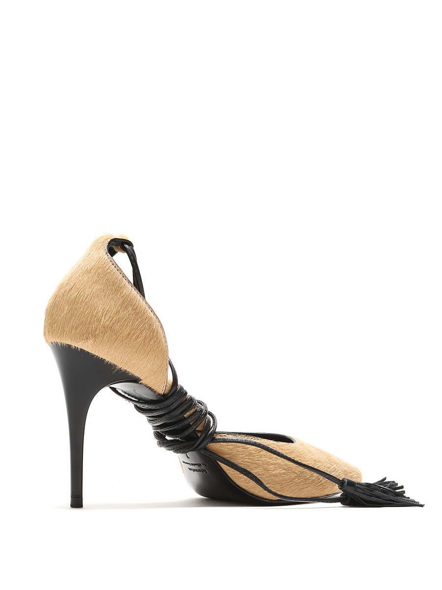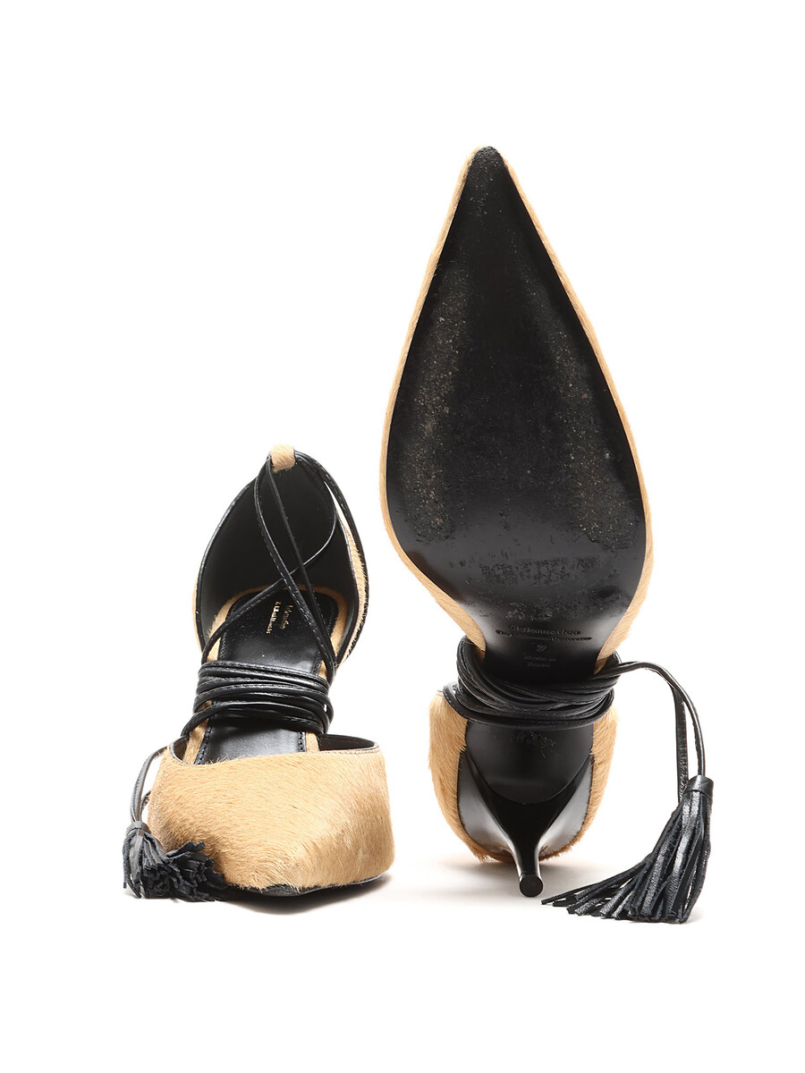 Raffia lace-up heels with tassel detailing in beige and black. Pointed toe style and leather sole.