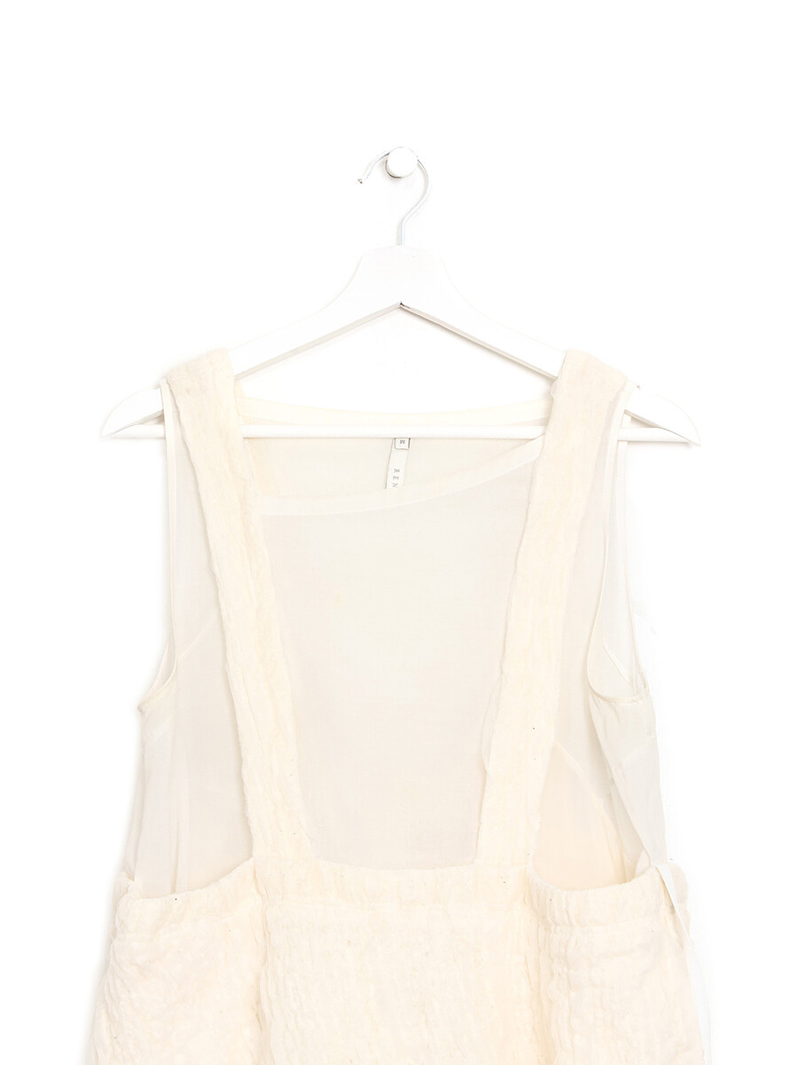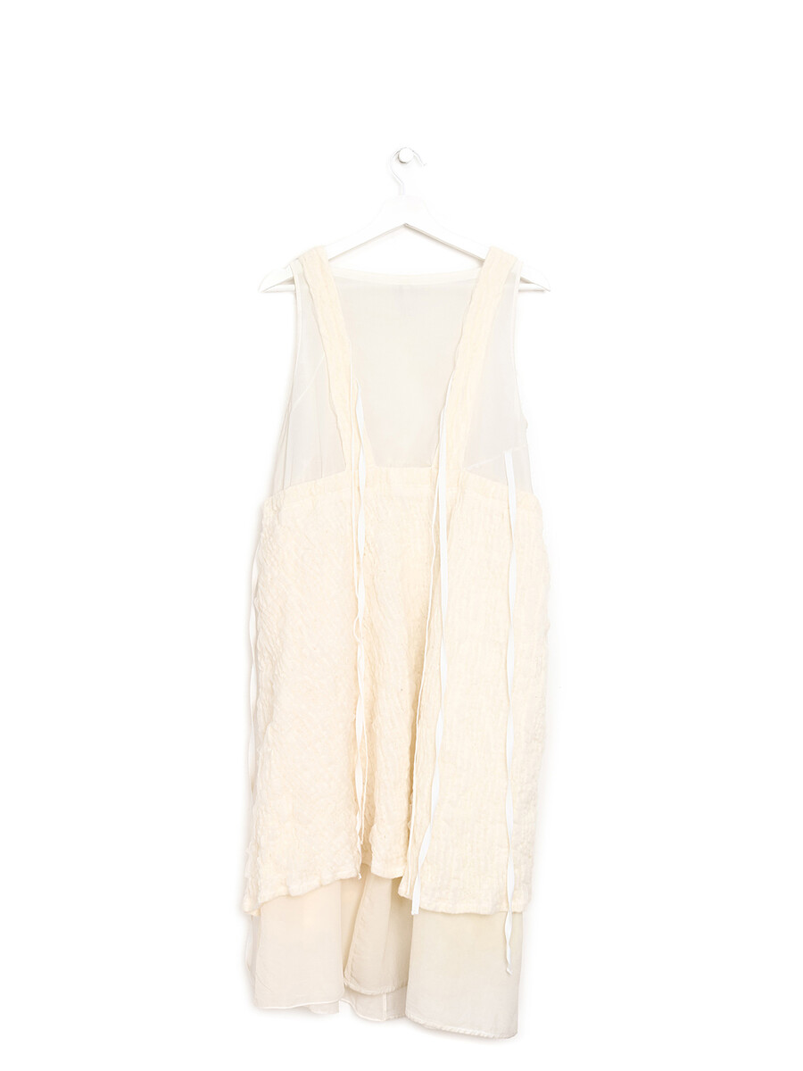 Sleeveless mid-length semi-sheer paneled dress in ivory. Round collar. Featuring subtle textural details and elegant translucent panels.