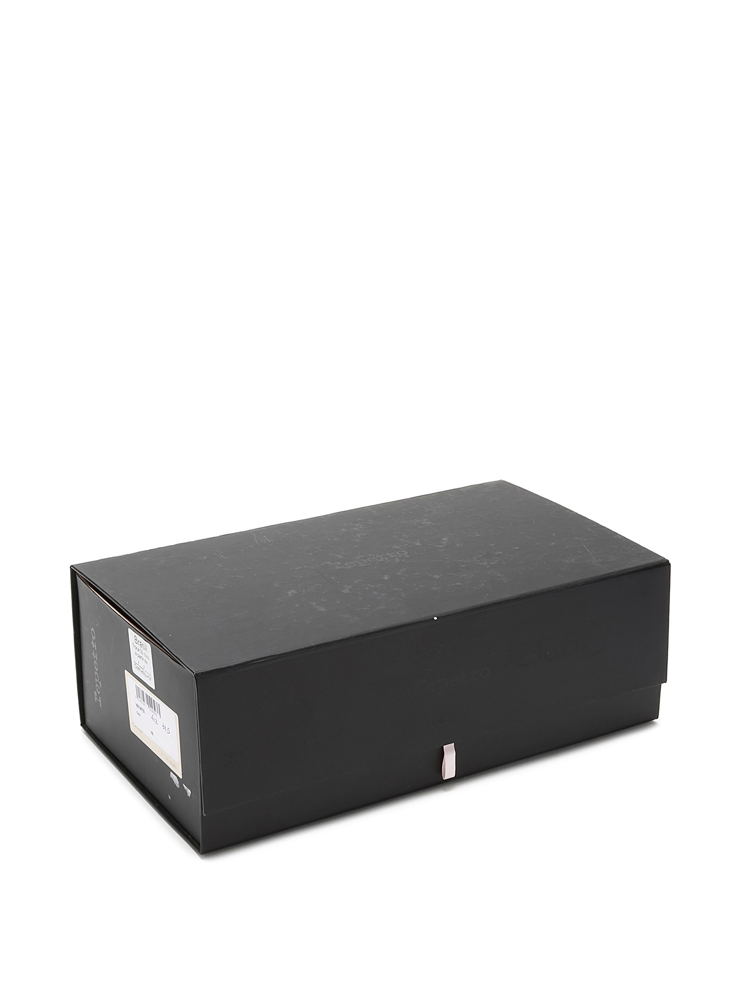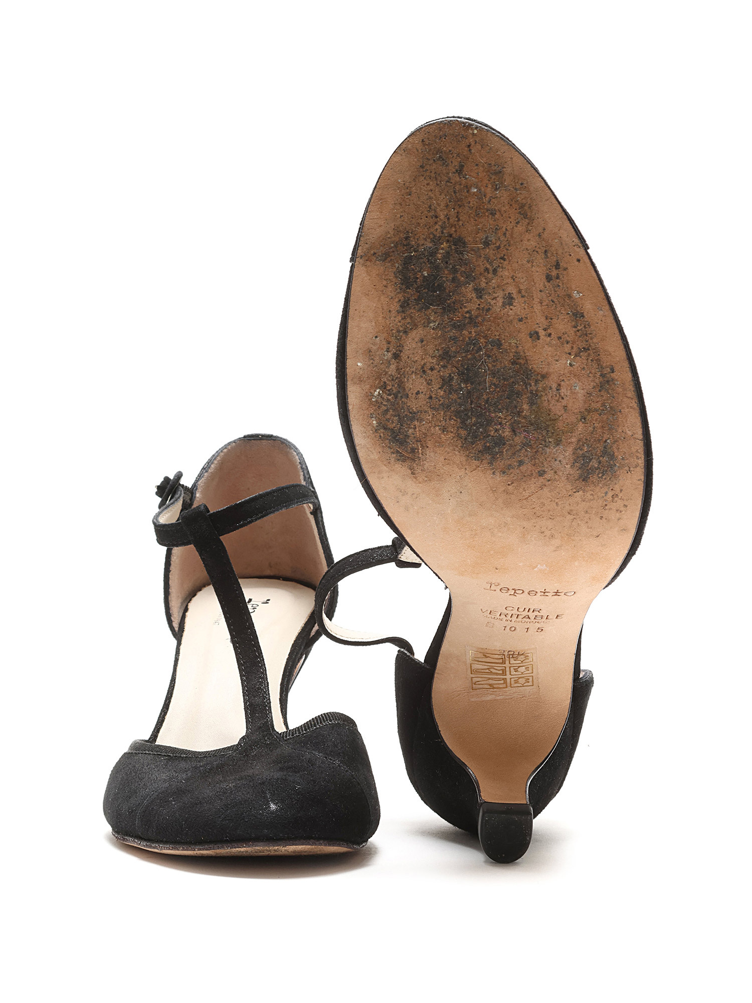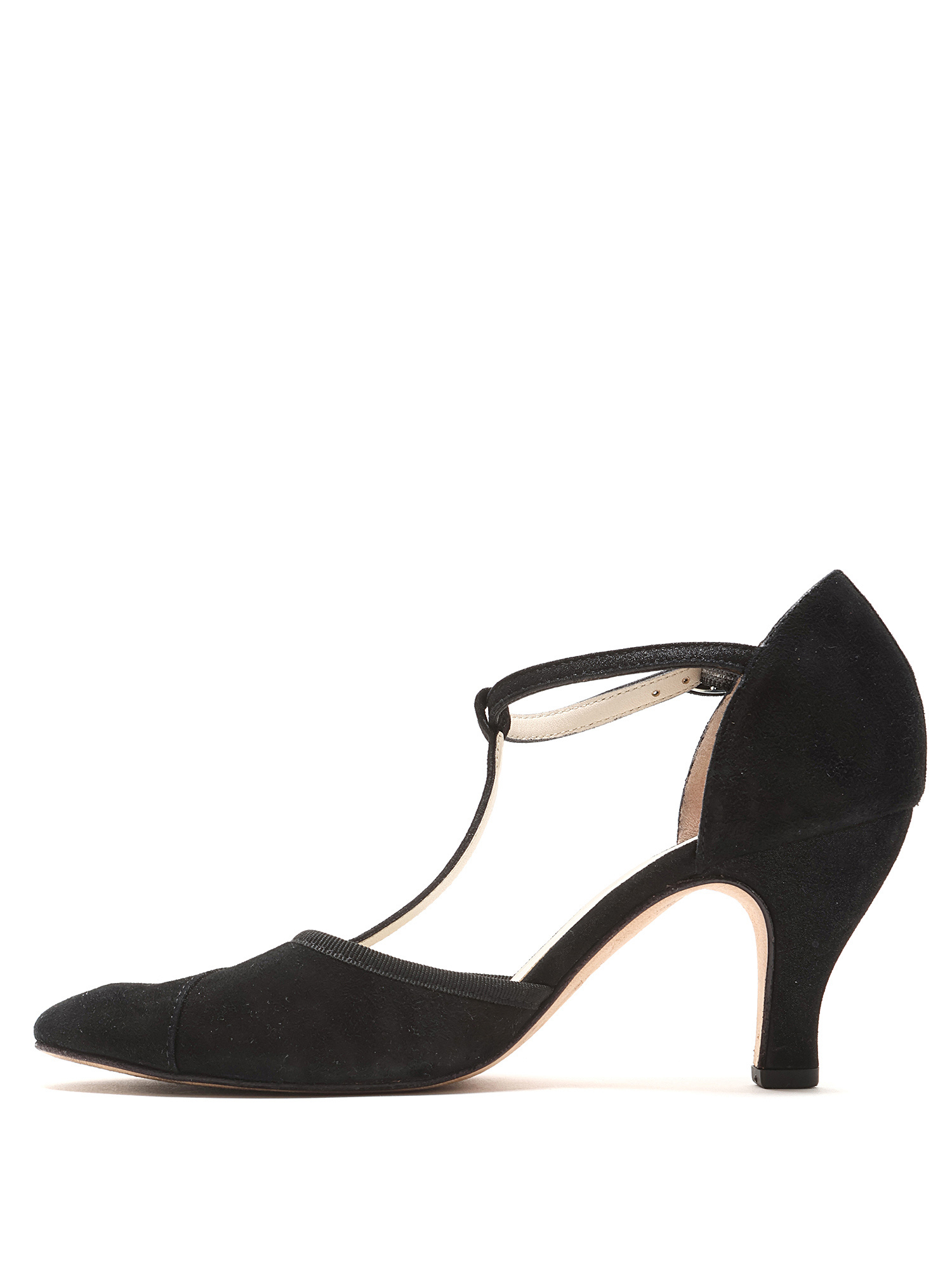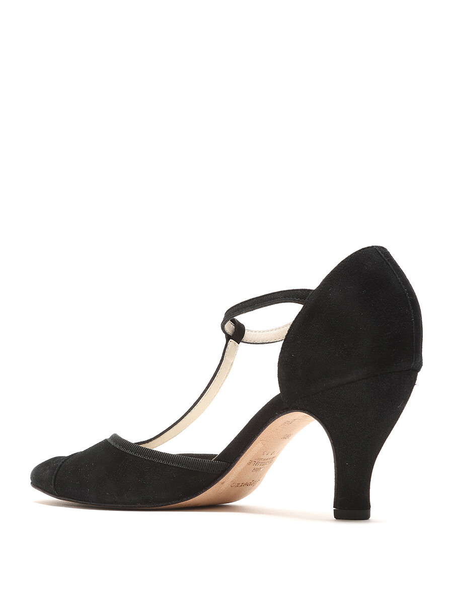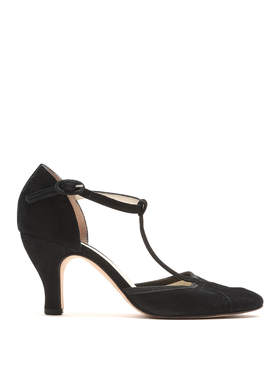 Suede slingback heels with a solid pattern in black. Buckle closure. Closed round toe. Leather sole.