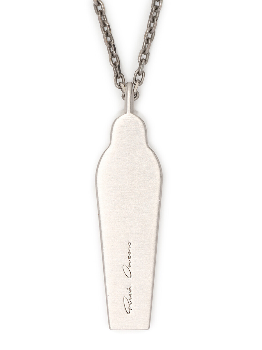 Engraved metal pendant necklace in silver. Lobster clasp closure.