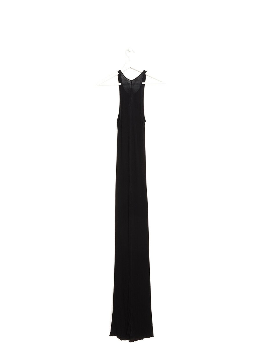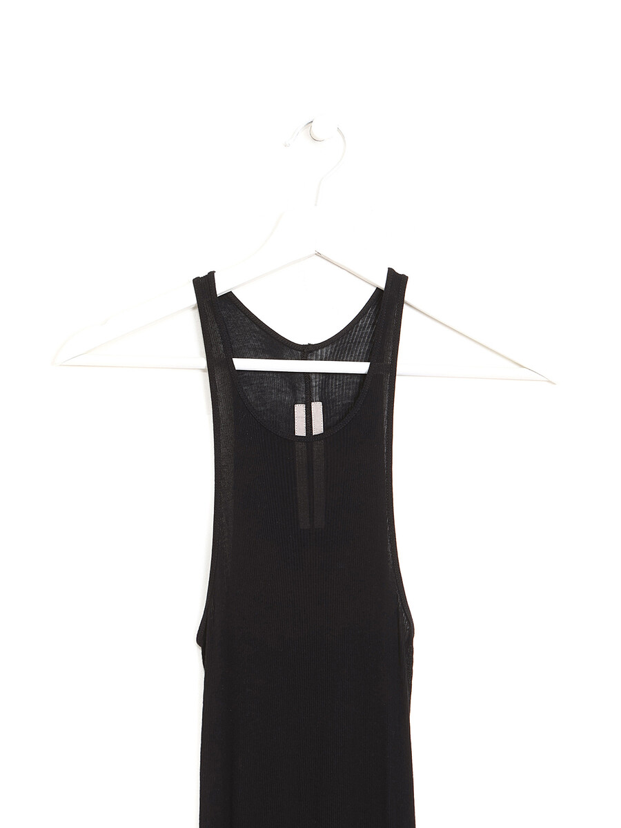 Sheer ribbed knit sleeveless maxi dress in black. Racer back design. Minimalist and lightweight with a body-hugging silhouette.