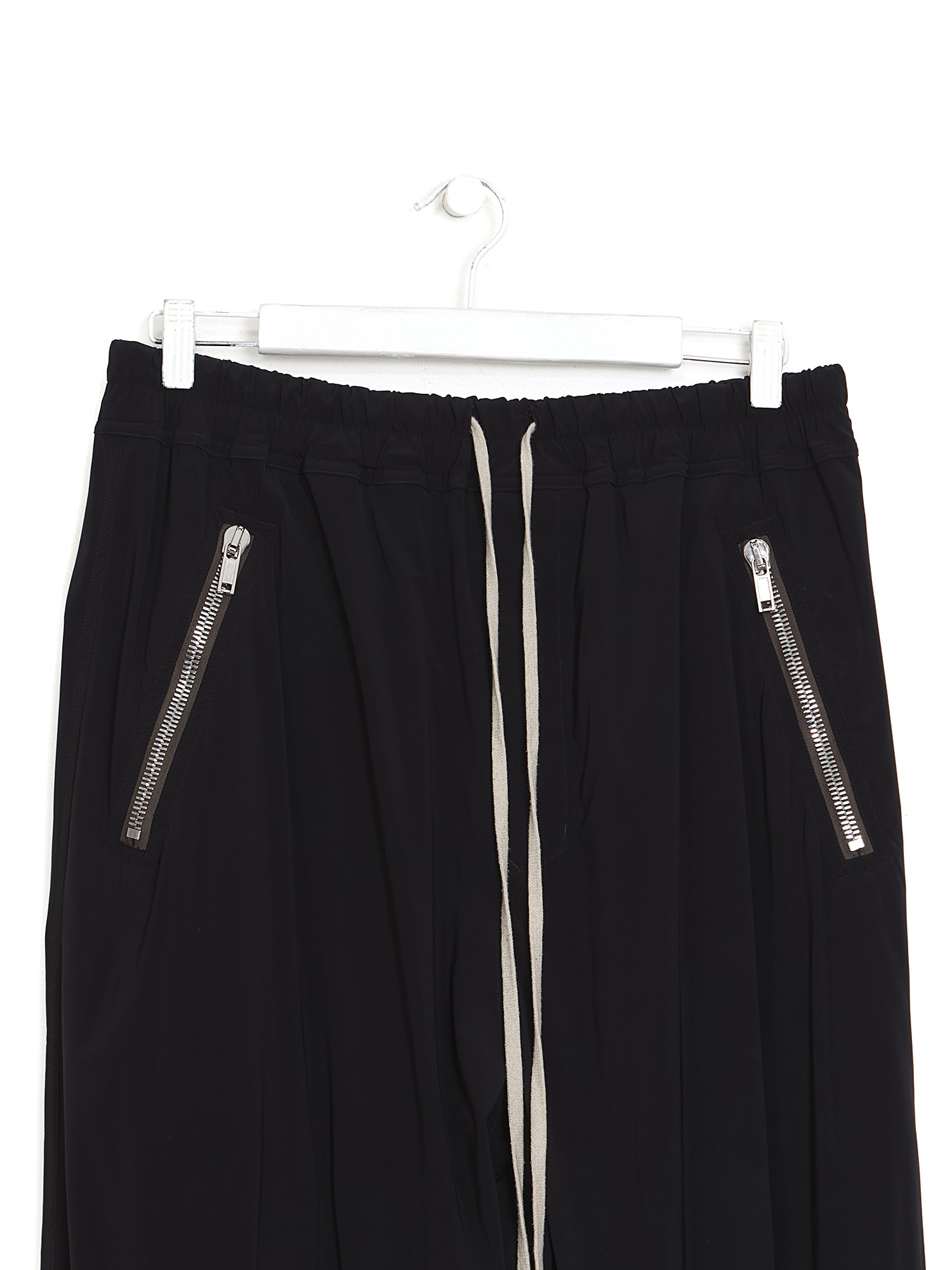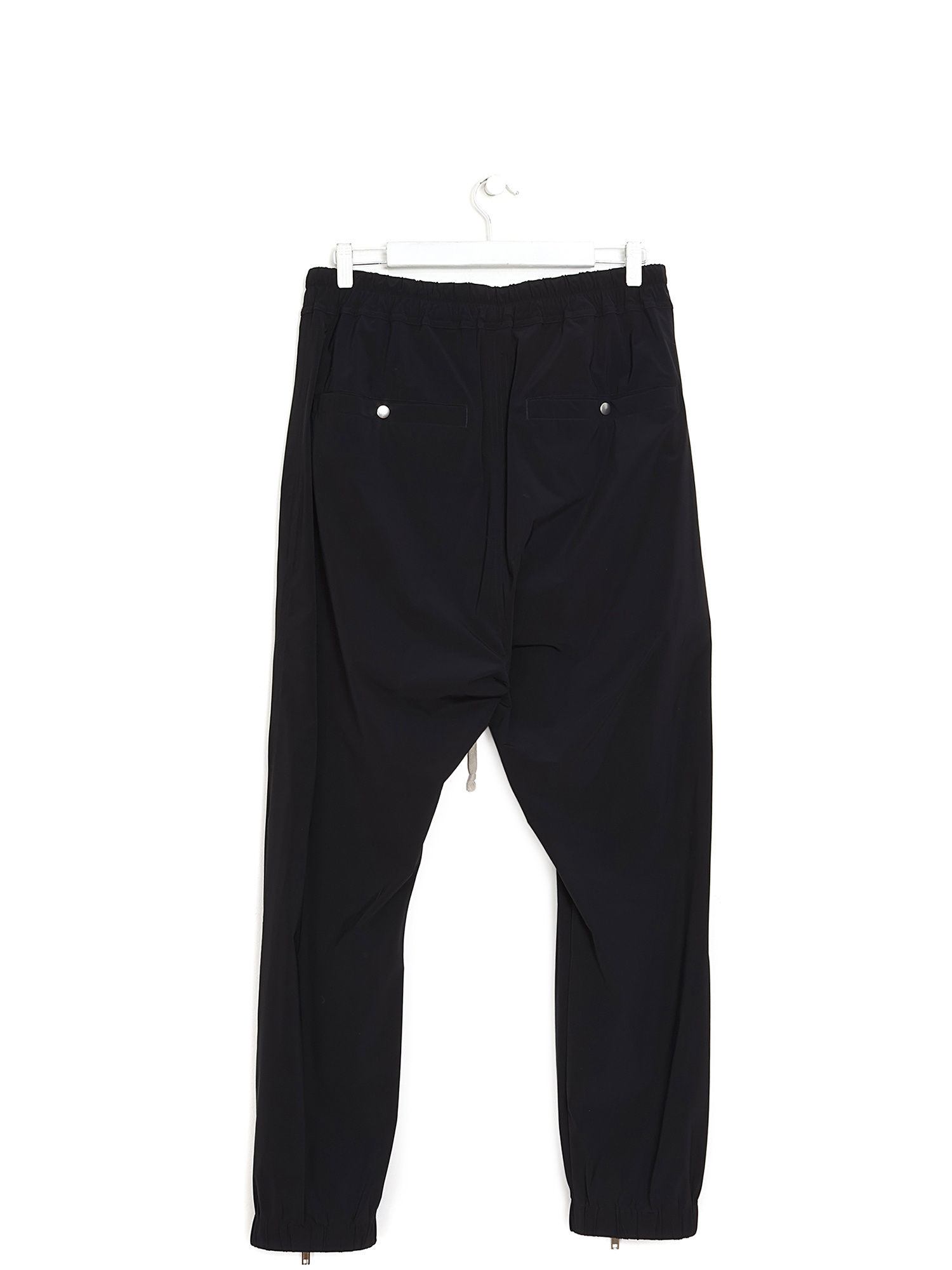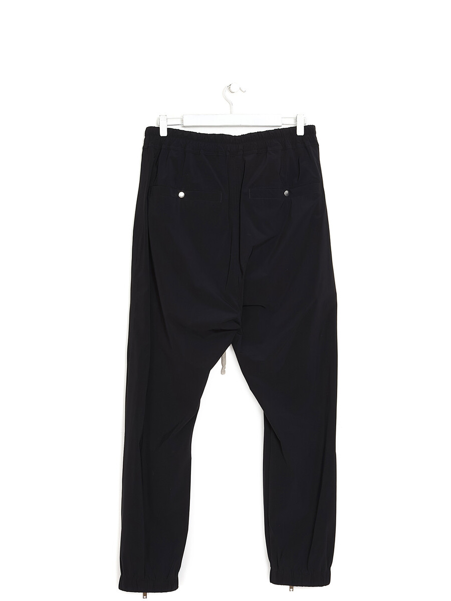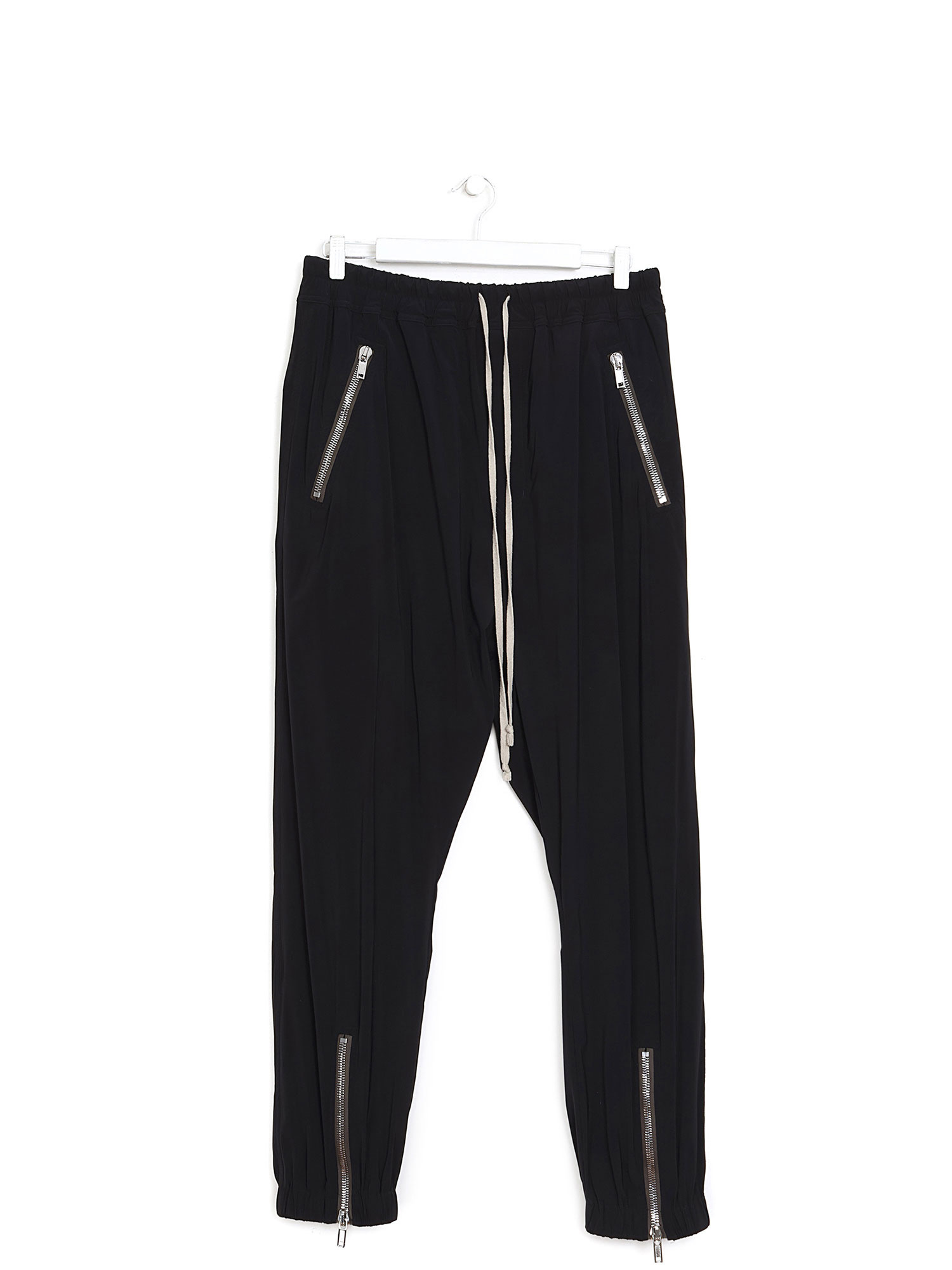 Black jogger pants featuring an elastic waistband with drawstrings. Zipper pockets at front and buttoned pockets at back.