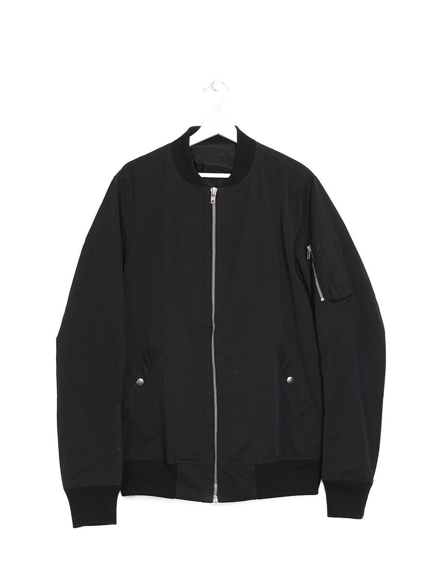 Black long sleeve bomber jacket in black. Zipper front closure.