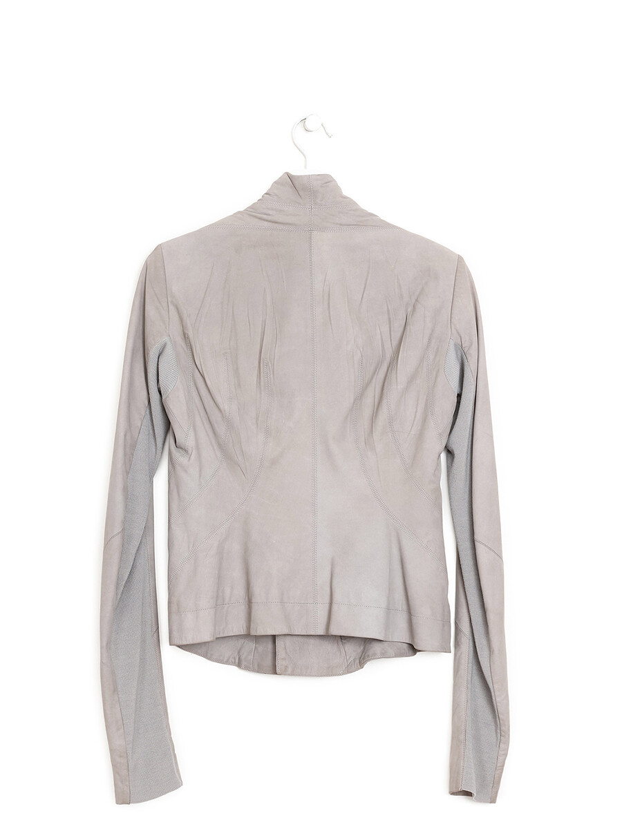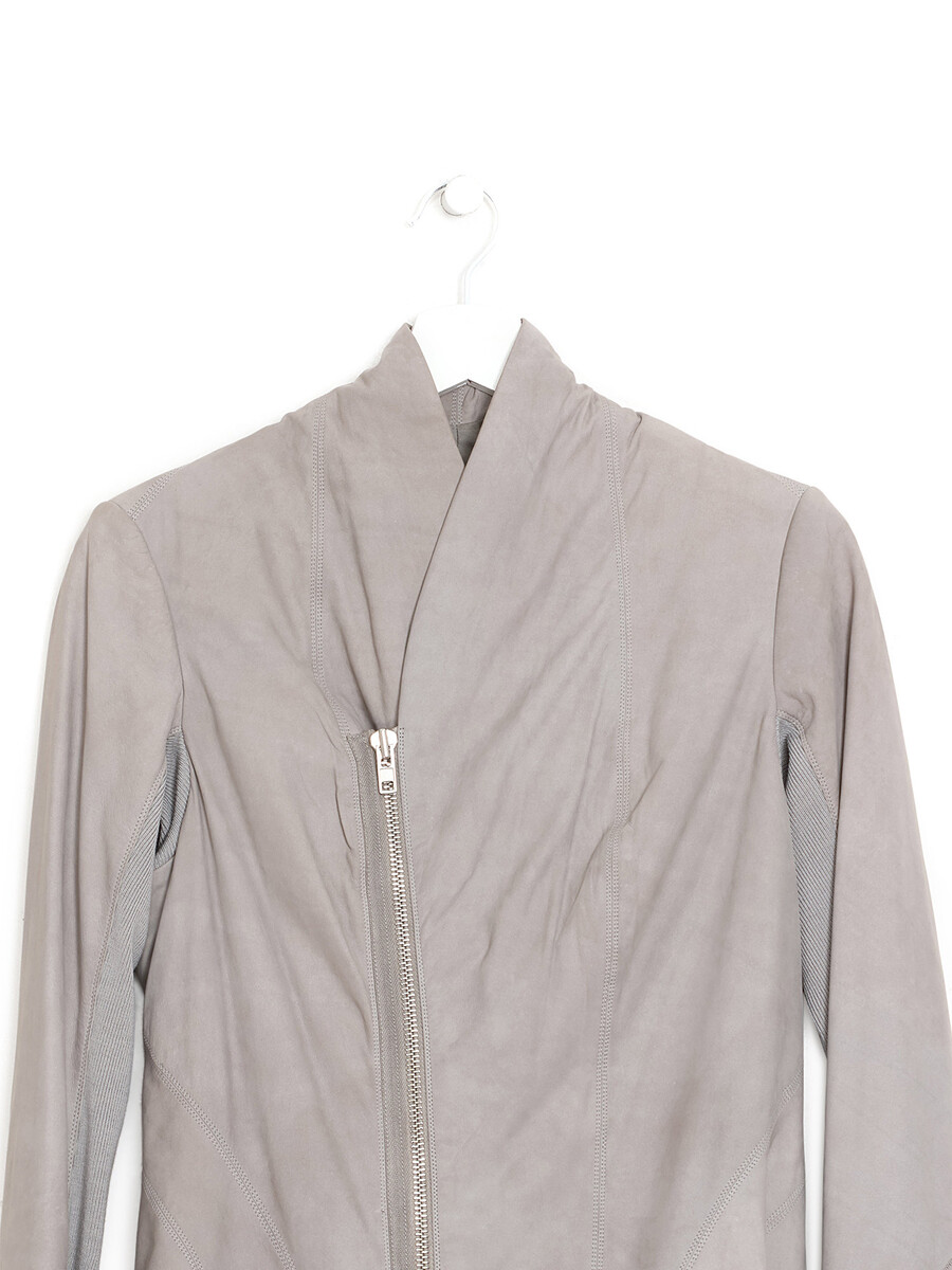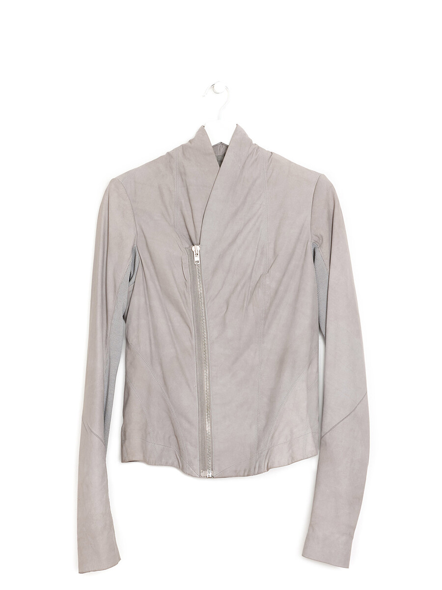 Grey calf leather jacket with an asymmetrical zipped closure. Front flap pockets.