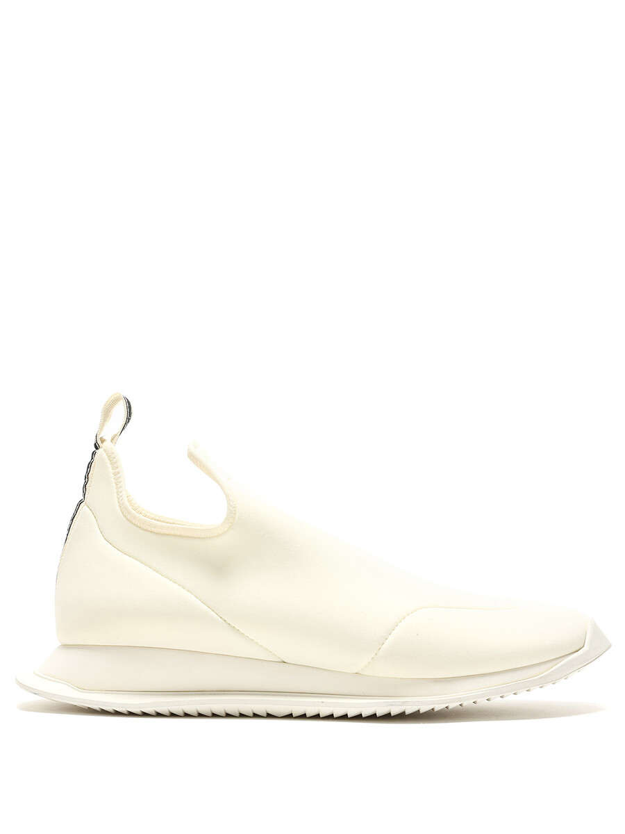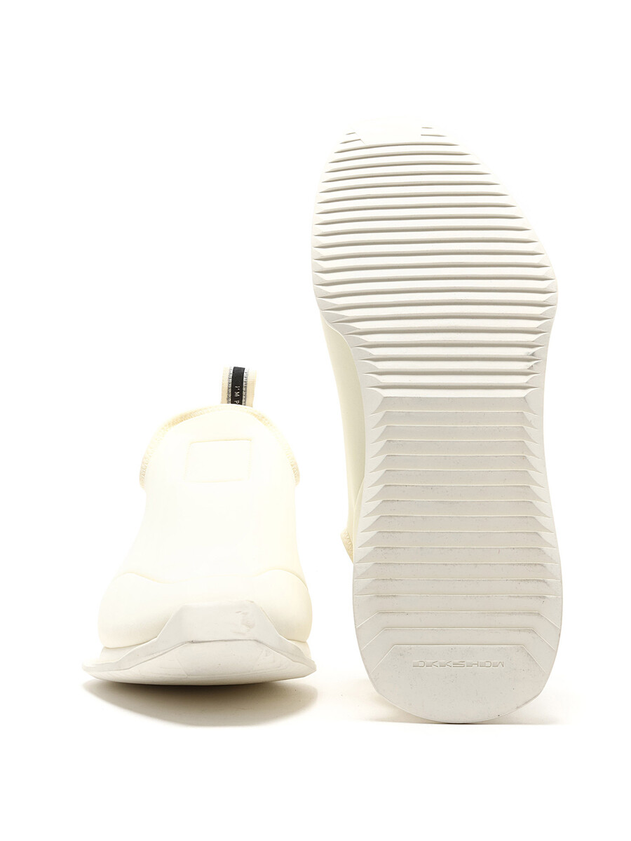 Pristine white slip-on leather sneakers. Closed round toe. Flat rubber sole.