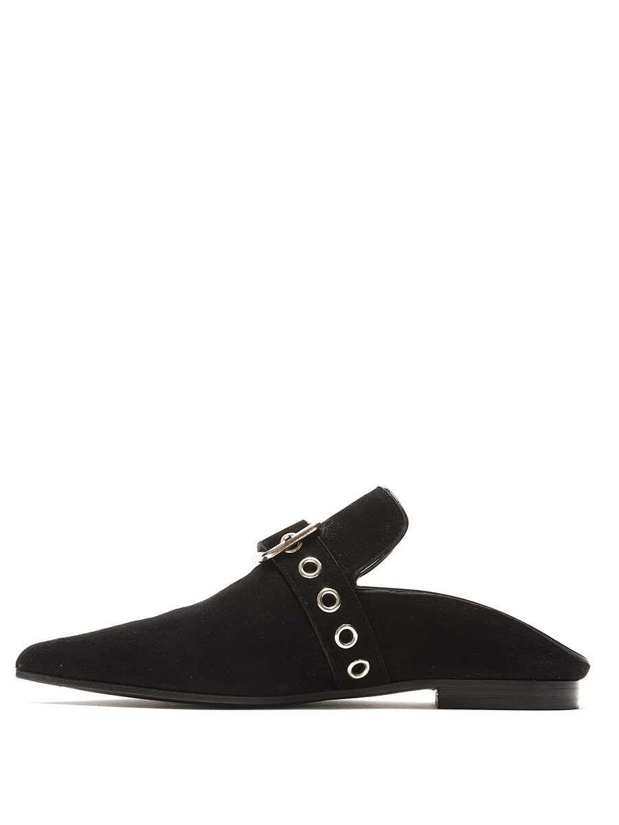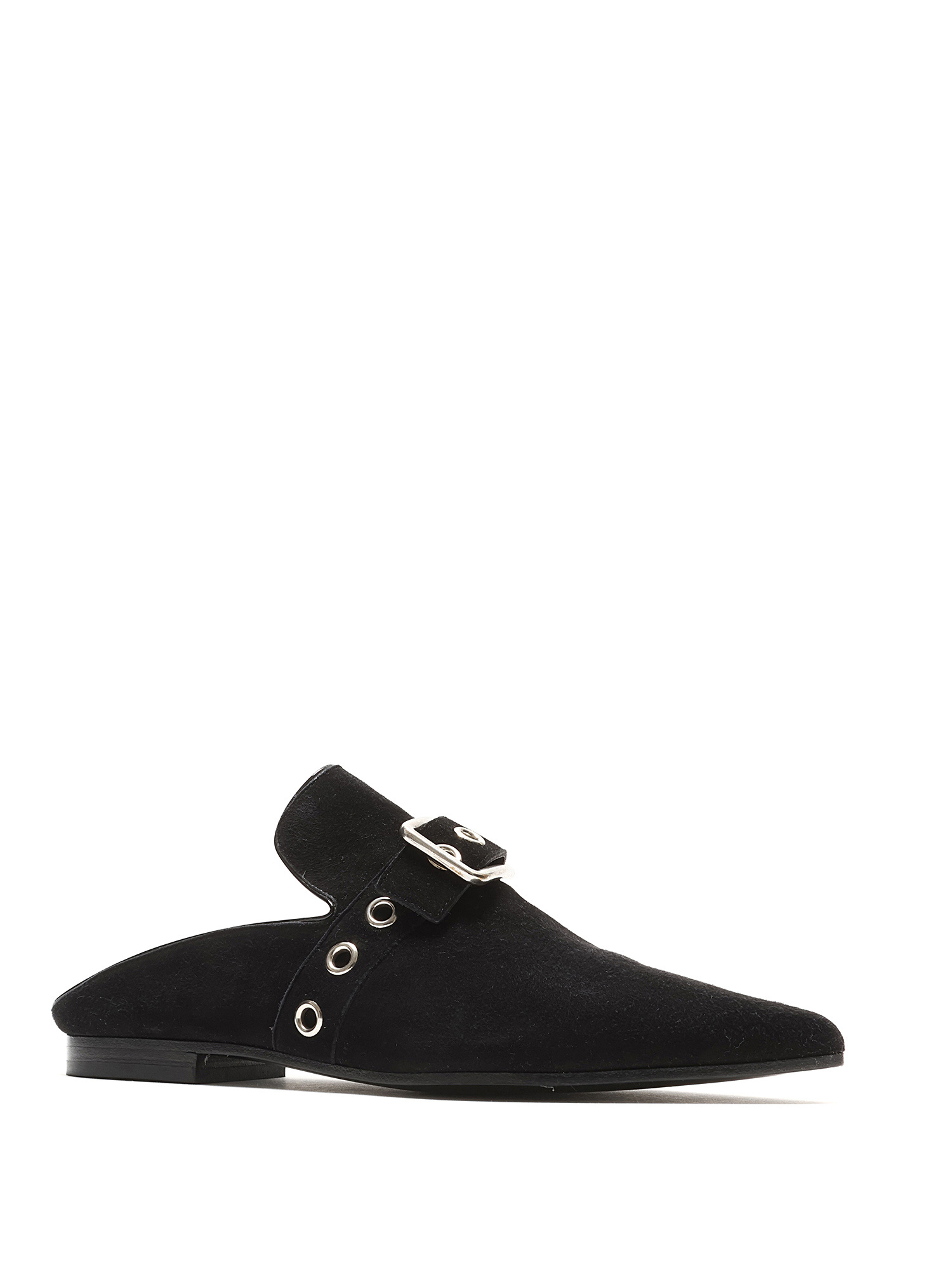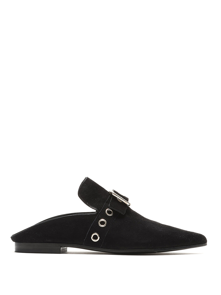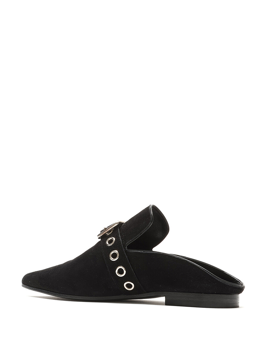 Pointed-toe suede mules featuring a silver-tone buckle fastening at the vamp. Leather sole with minor wear.