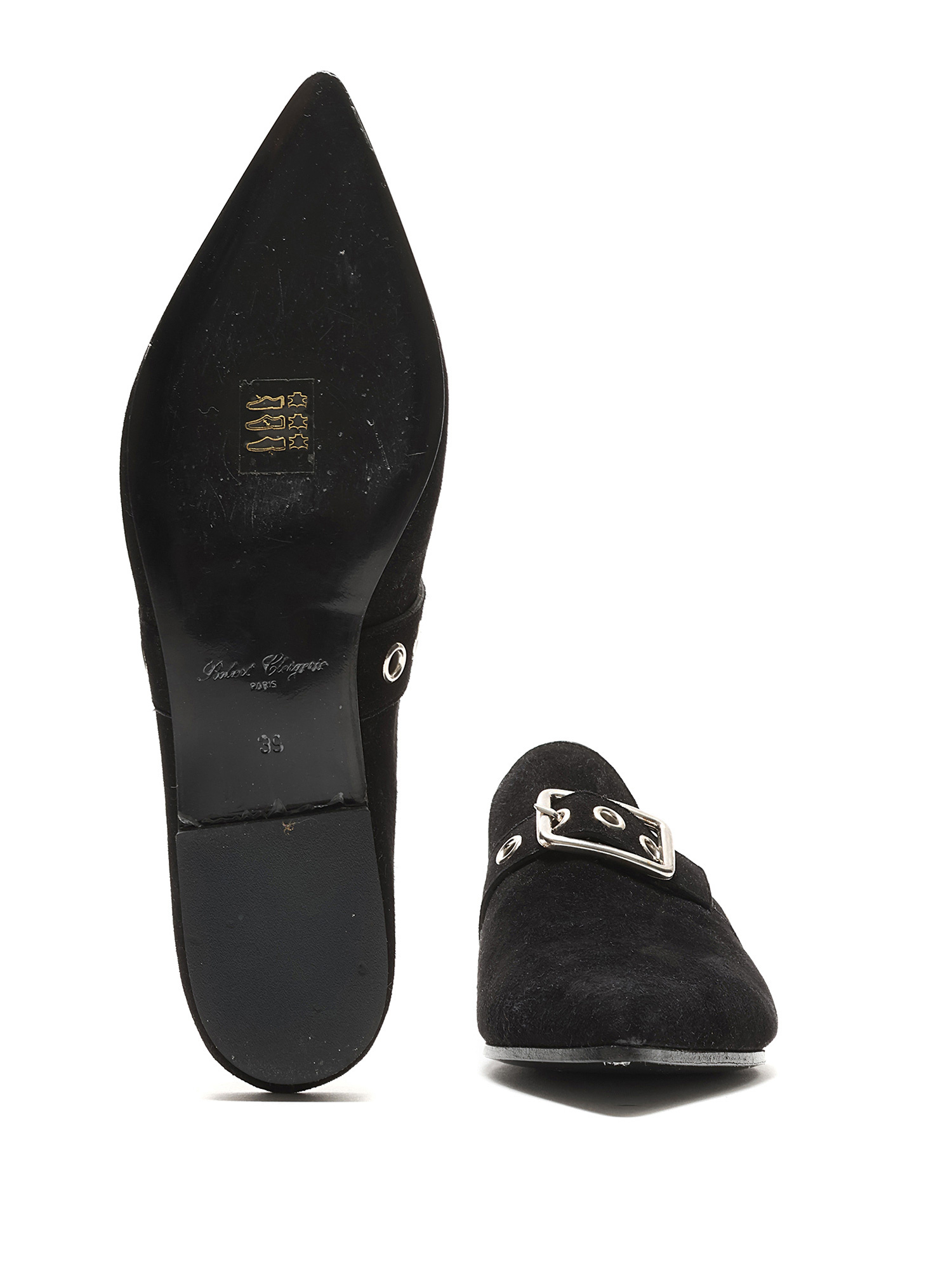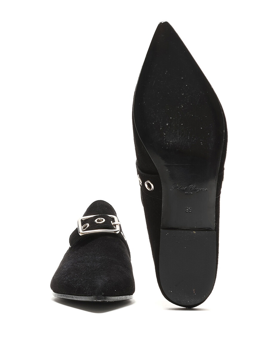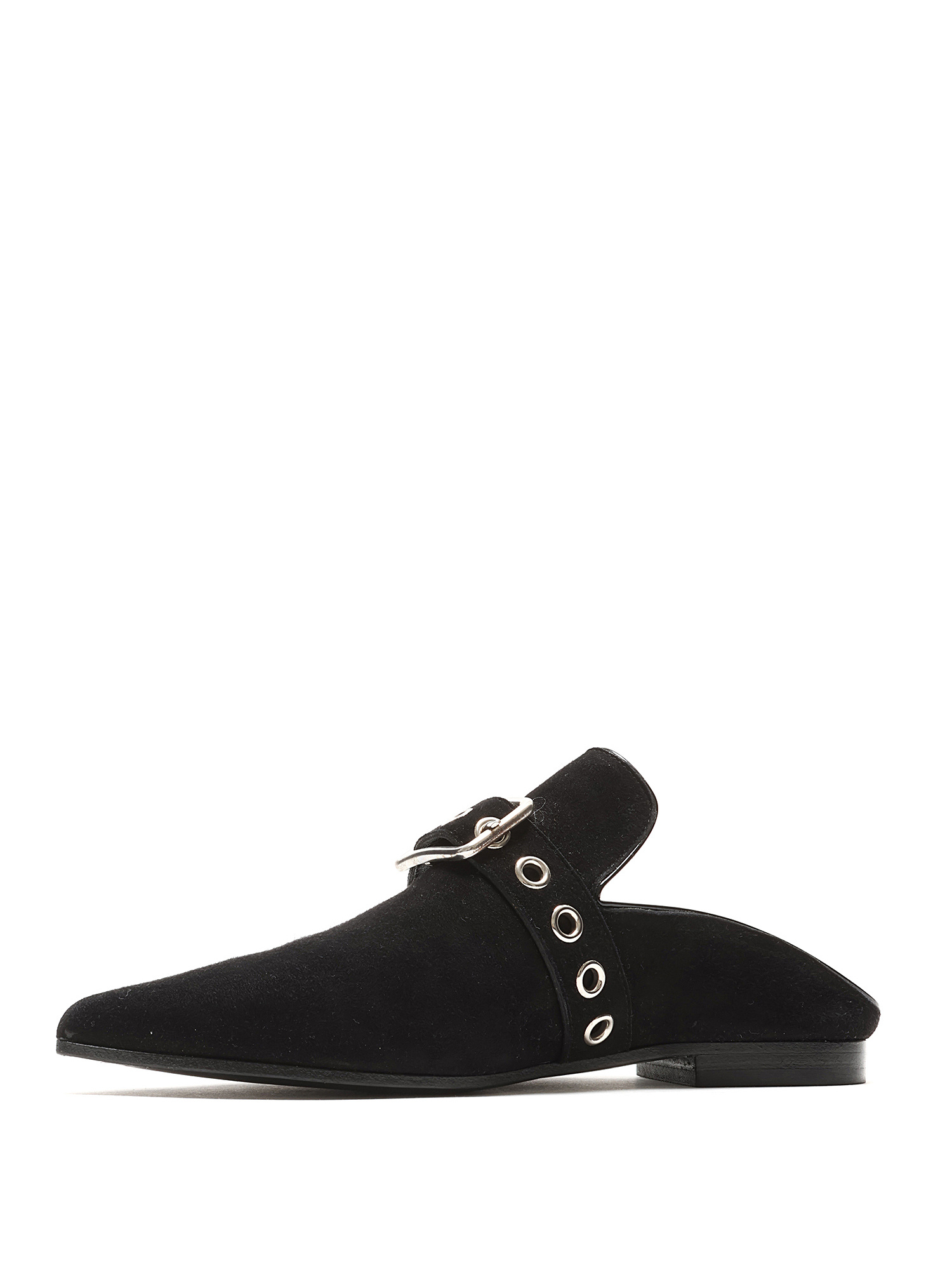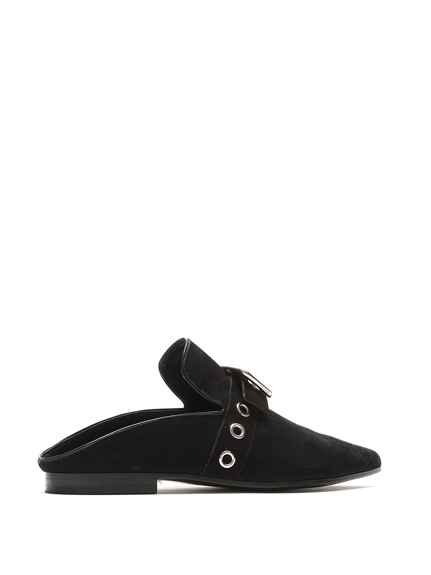 Pointed-toe suede mules featuring a silver-tone buckle fastening at the vamp. Leather sole with minor wear.