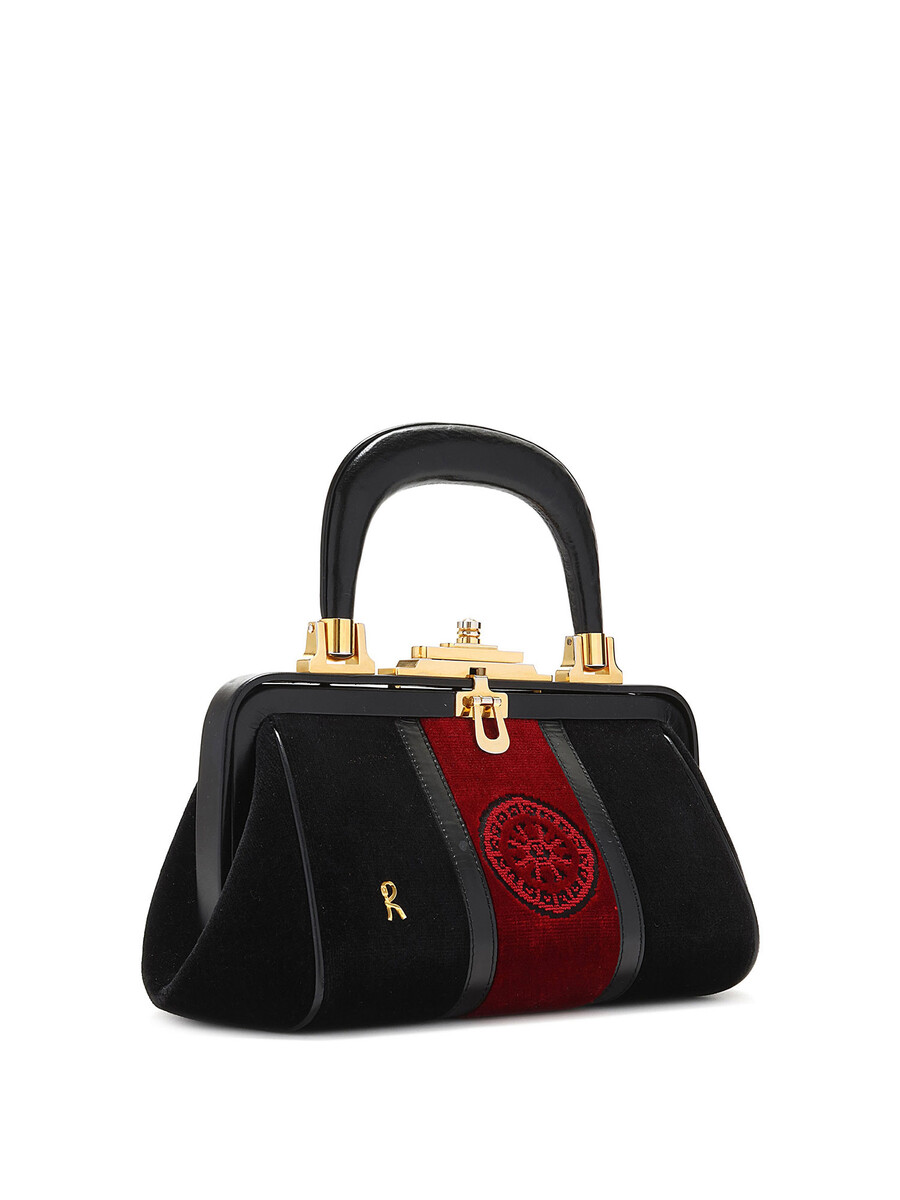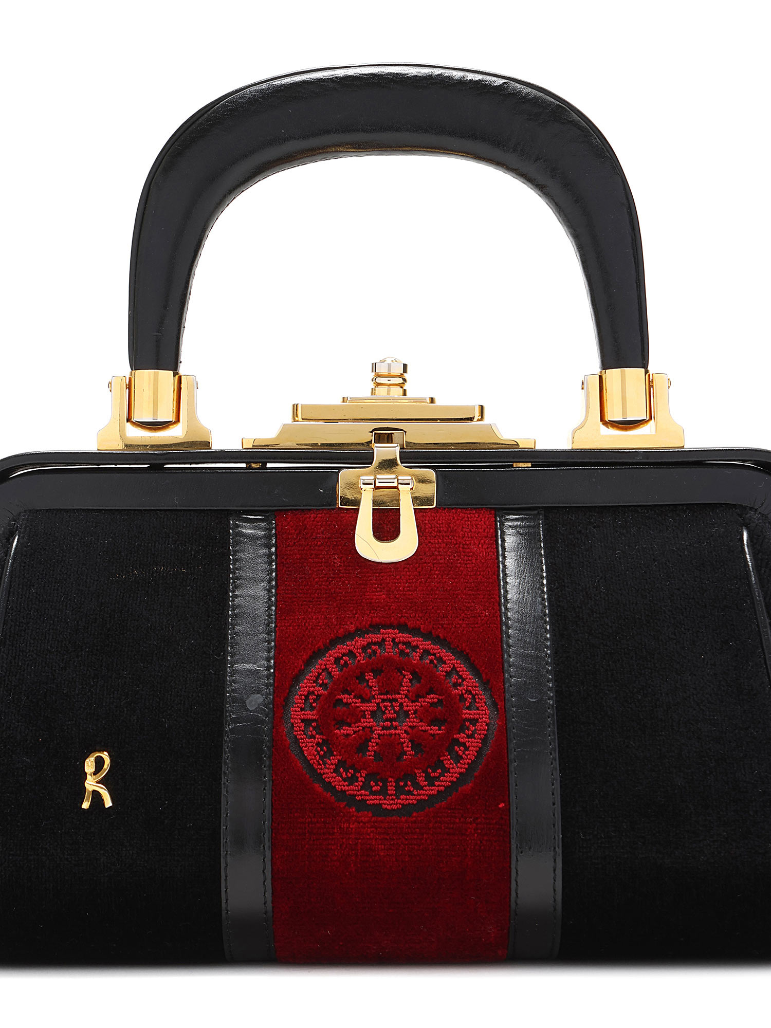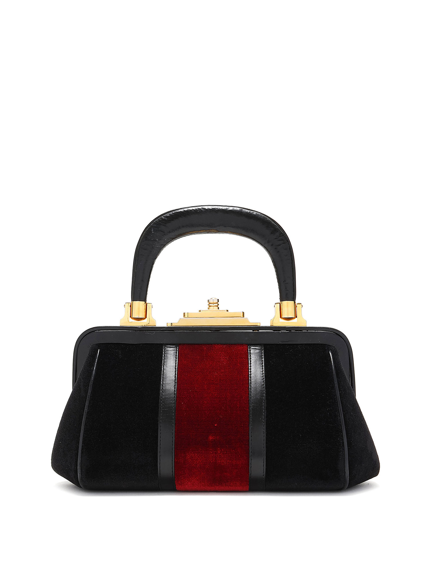 Velvet black top handle bag featuring a striking red stripe. Gold-tone lock closure and leather accents. Iconic Bagonghi bag style.
