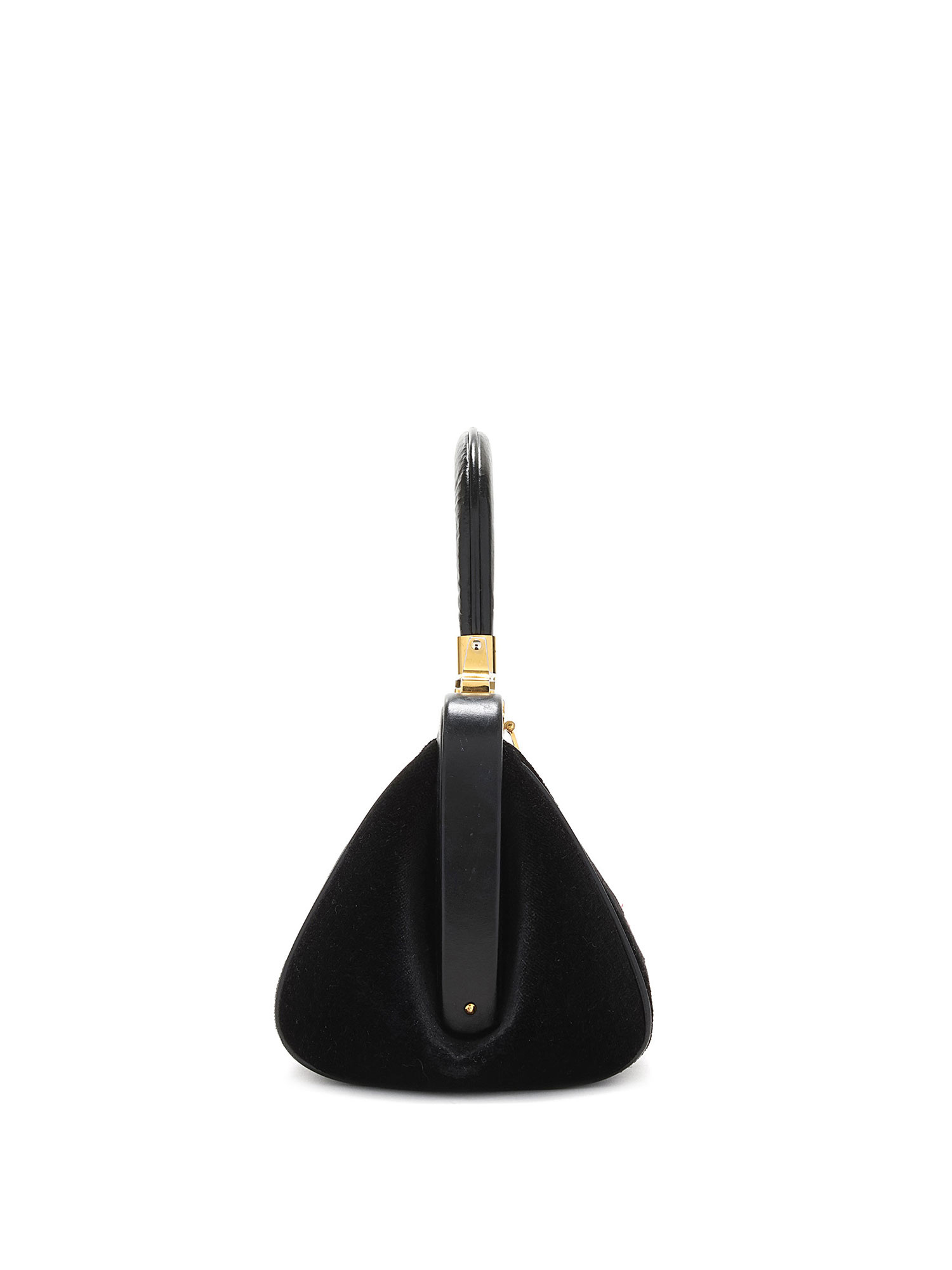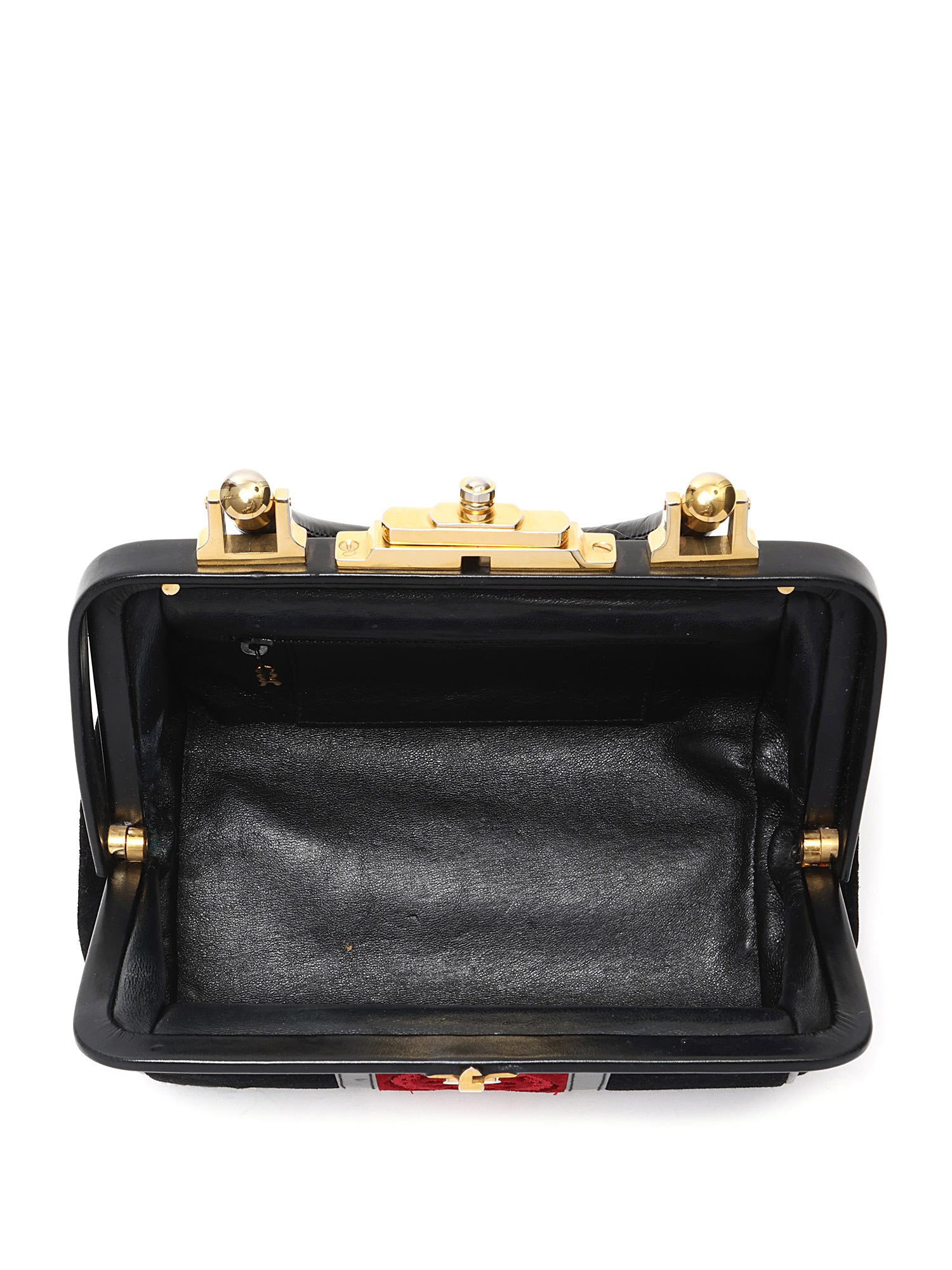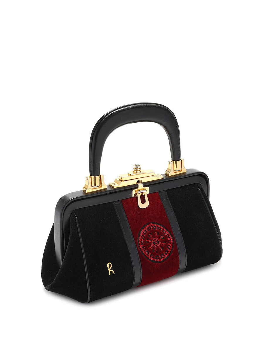 Velvet black top handle bag featuring a striking red stripe. Gold-tone lock closure and leather accents. Iconic Bagonghi bag style.