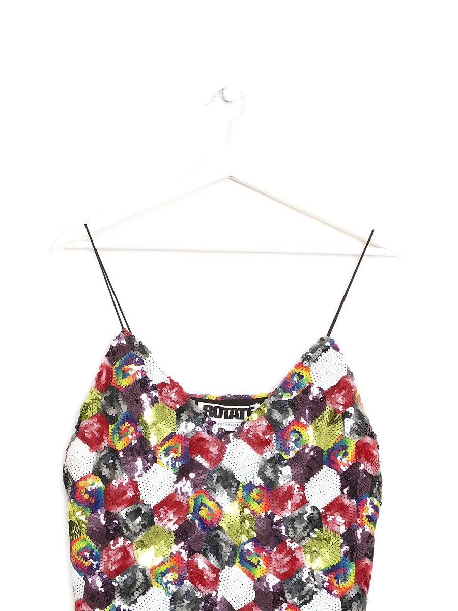 Sleeveless sequin dress with multicolored embellishments. Fitted silhouette. Back zipper closure. Shimmering effect throughout.