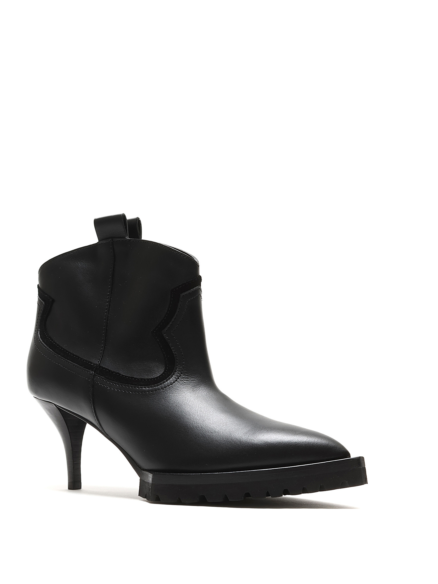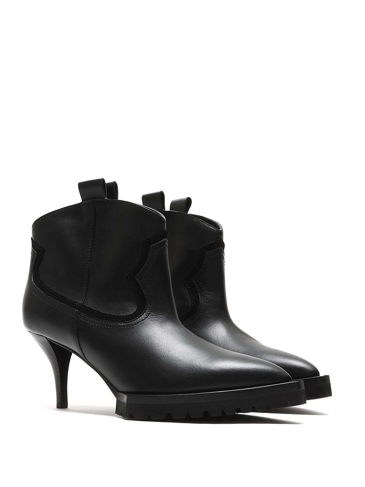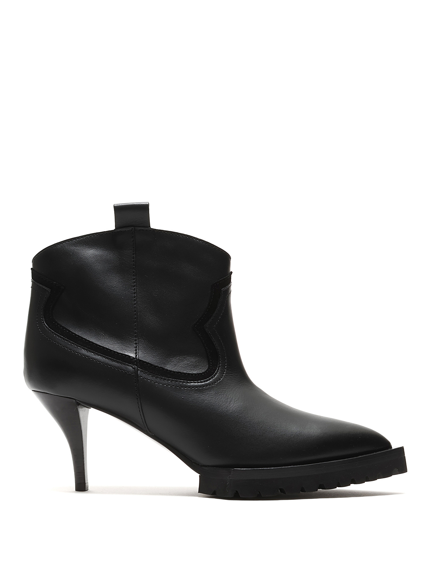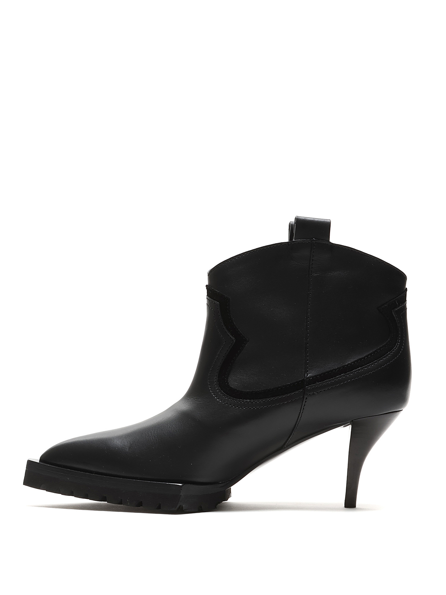 Smooth leather ankle boots in black with tonal stitching and kitten heel. Pull-on style with a rubber lug sole. Pointed toe design.