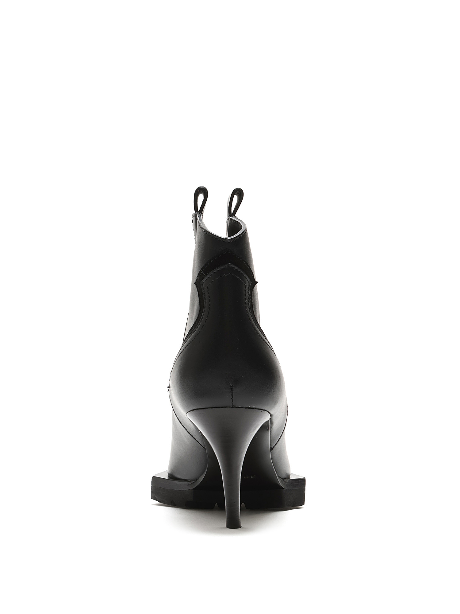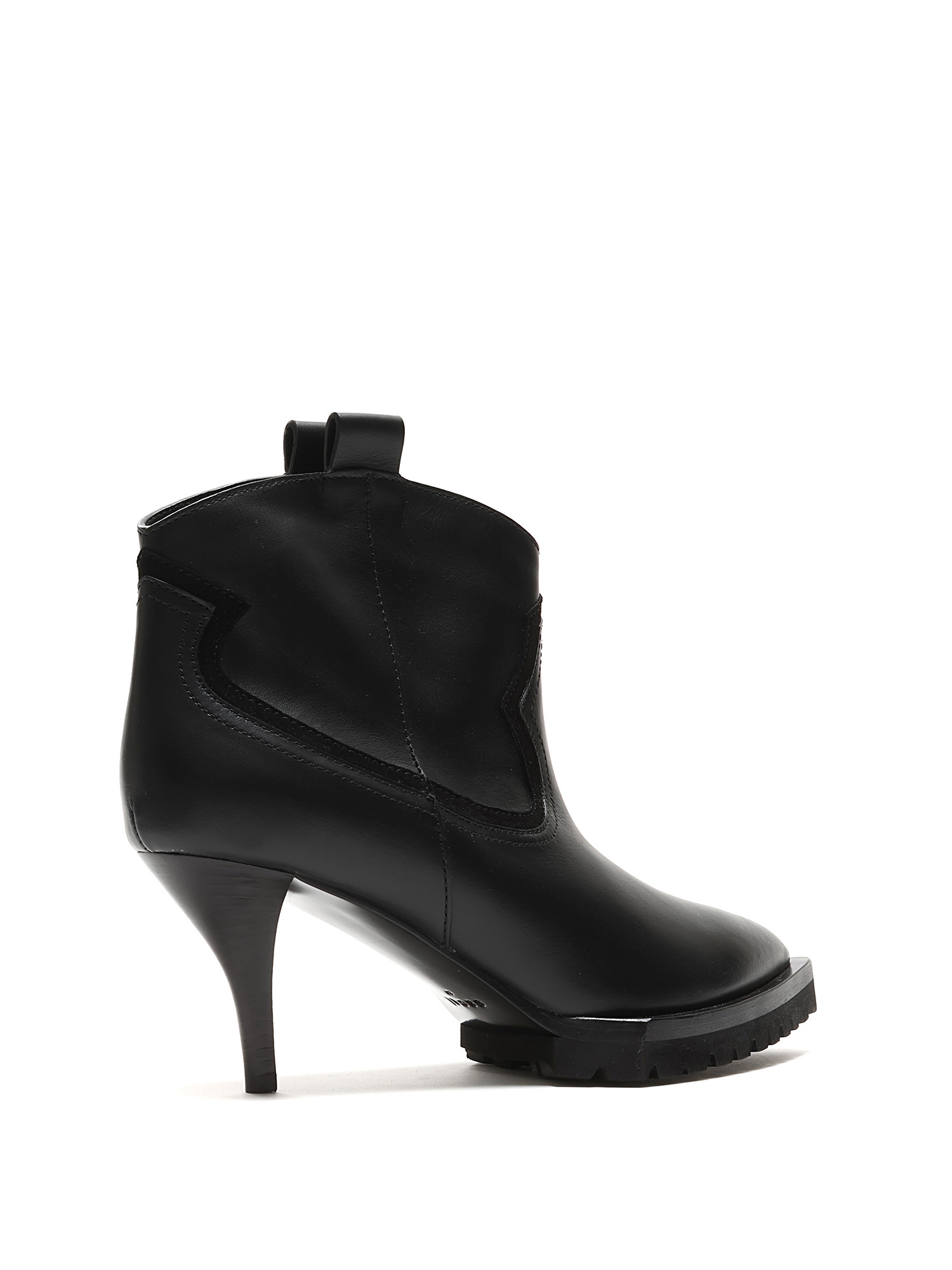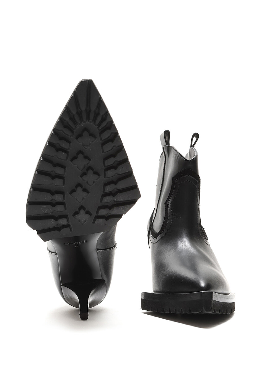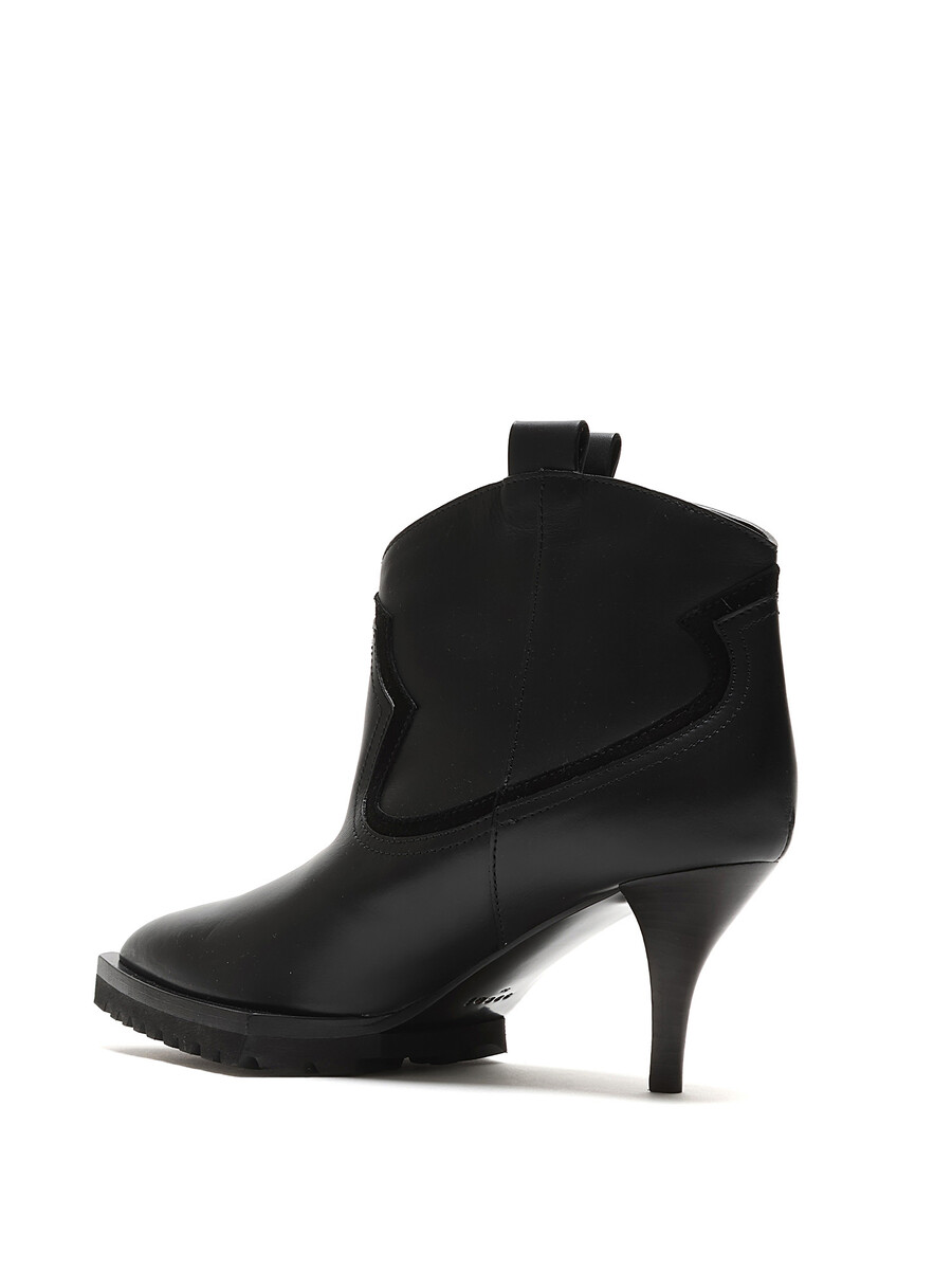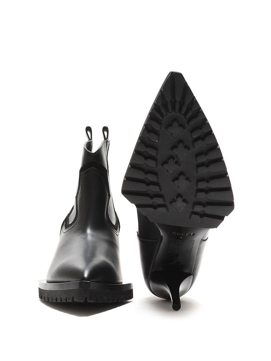 Smooth leather ankle boots in black with tonal stitching and kitten heel. Pull-on style with a rubber lug sole. Pointed toe design.