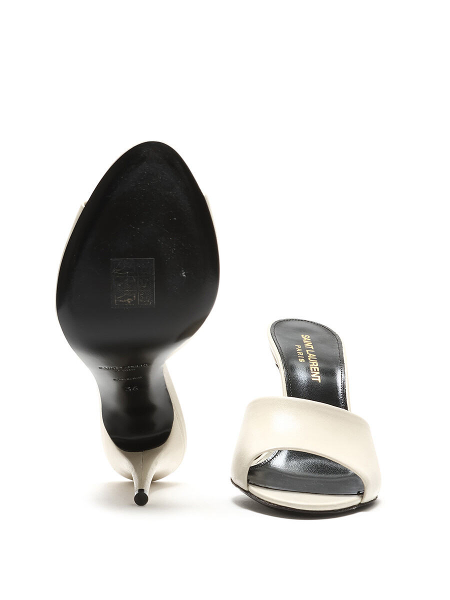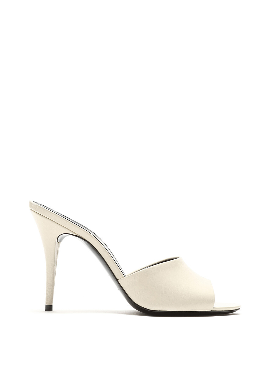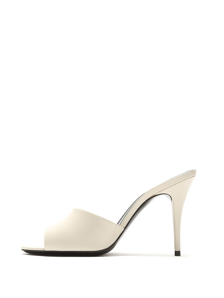 Cream white leather slip-on sandals with stiletto heel. Open toe design, featuring a sleek silhouette. Comes with a dust bag.